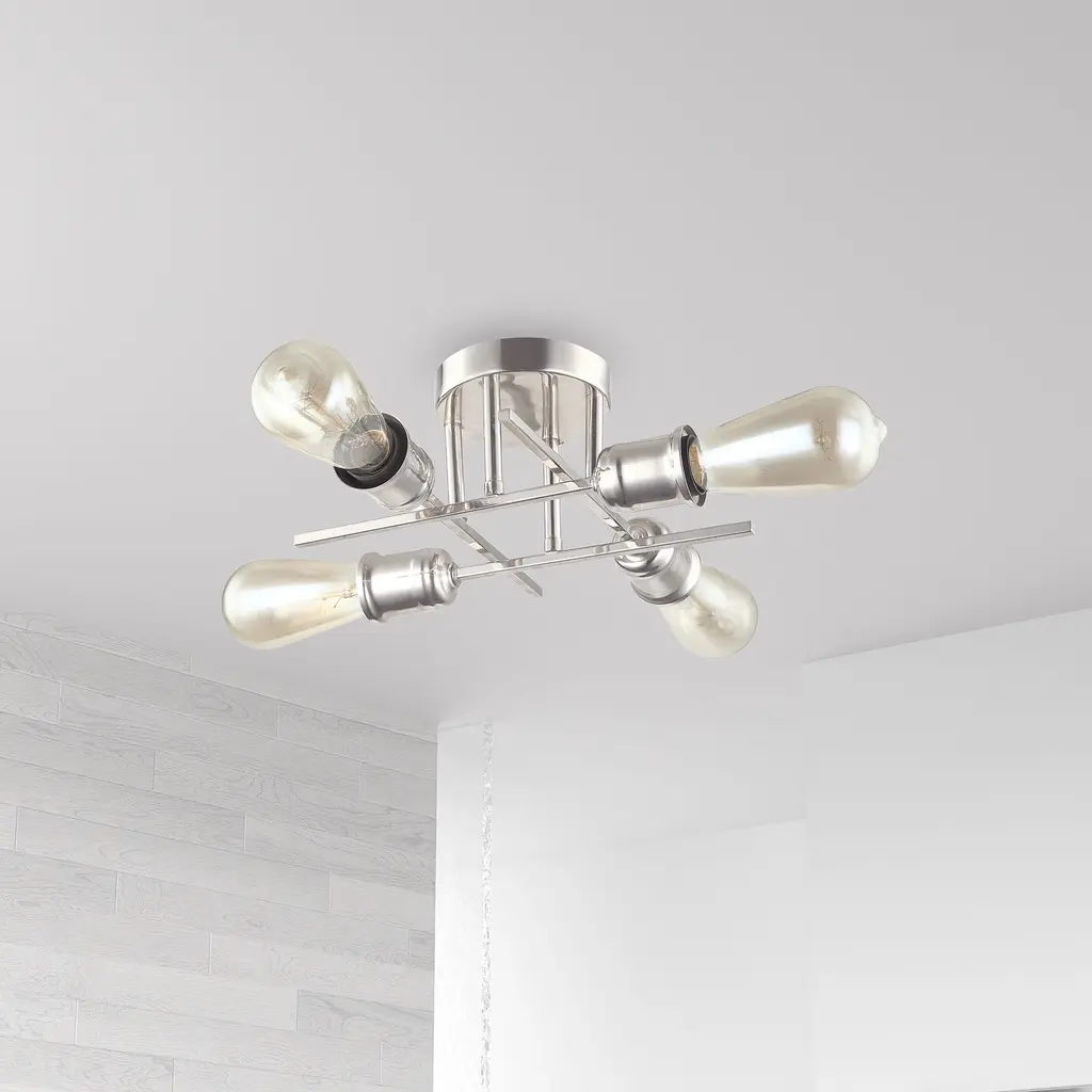 Adventurously stylish, the Nebraska family of lighting is inspired by the wide open spaces of the prairie state. The expansive design comes in a choice of configurations oriented vertically, horizontally or in all directions. A metal frame in a choice of gleaming finishes houses the arms that radiate out from the center. The bulbs emanate light from the end of each arm in a variety of intriguing patterns. With all its possible configurations, Nebraska lighting will add a focal point to any room from the living or great room to a dinette or hallway.