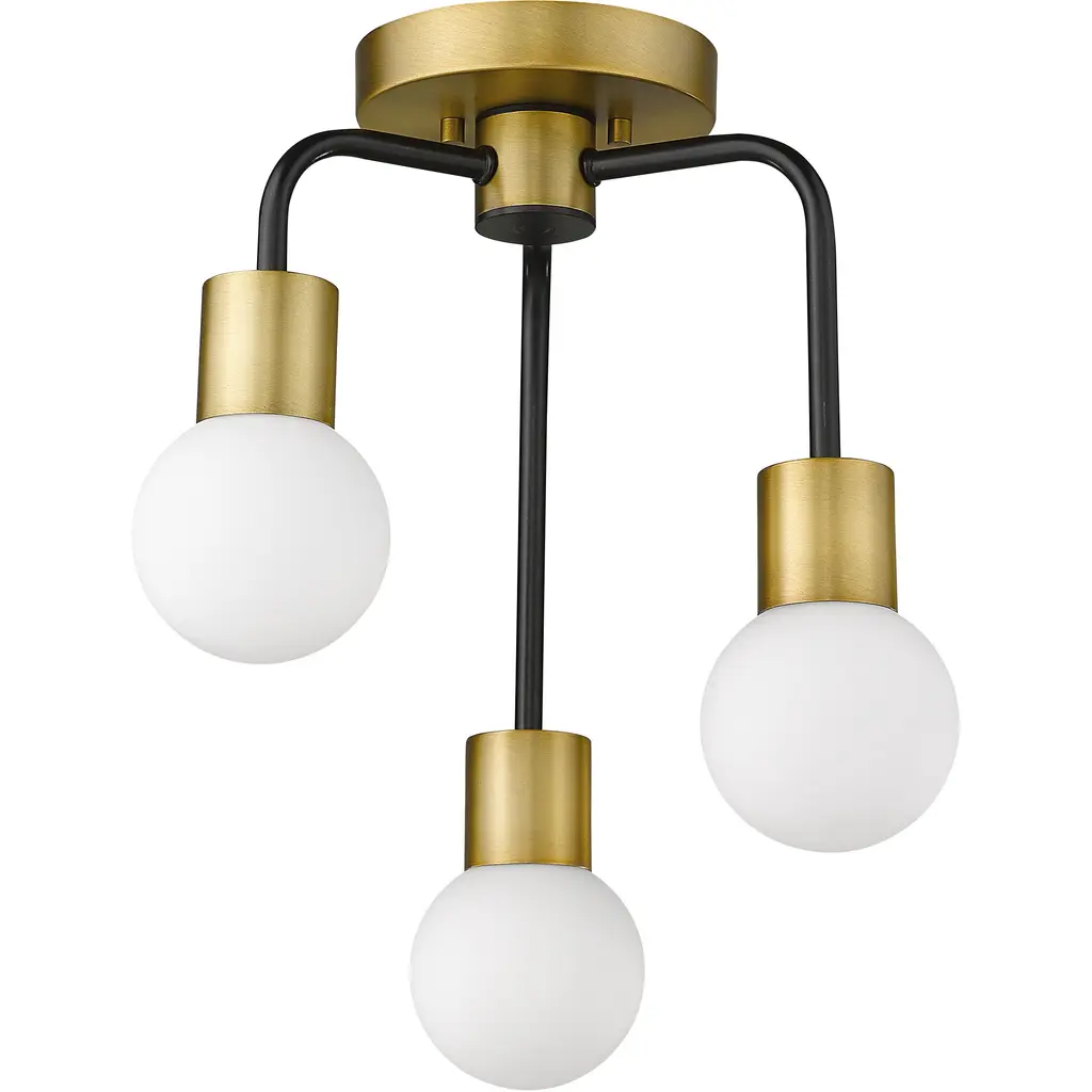 From the Neutra collection comes this stunning semi flush mount light with three opal glass globes to softly diffuse a space. Finished in a contrasting two-tone design that includes waterfall-curved matte black rods and a lustrous foundry brass mount plate and fixture supports, this flush mount lighting fixture lends a vintage-inspired mid-century modern vibe. Hang this steel drop pendant light in a bedroom or bathroom for Art Deco flair.