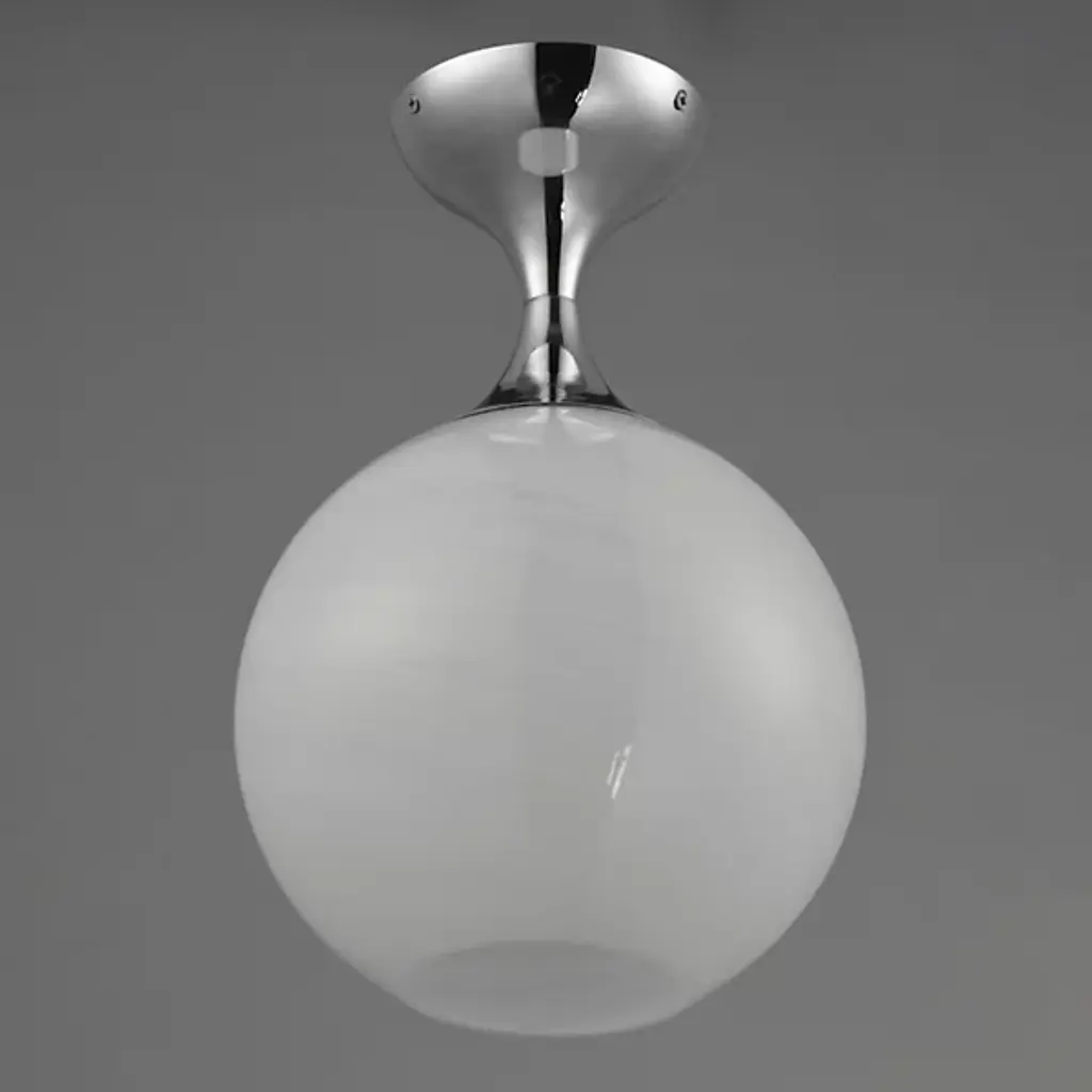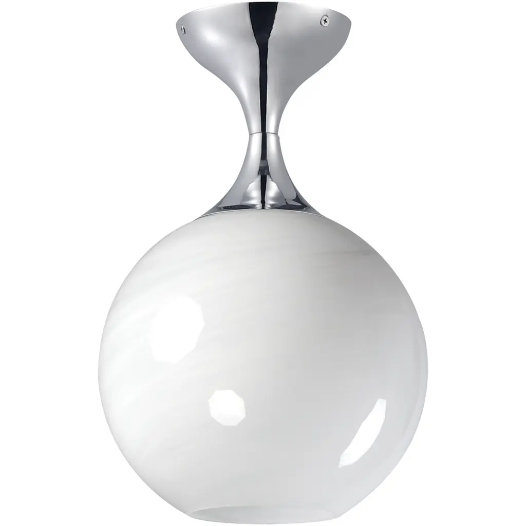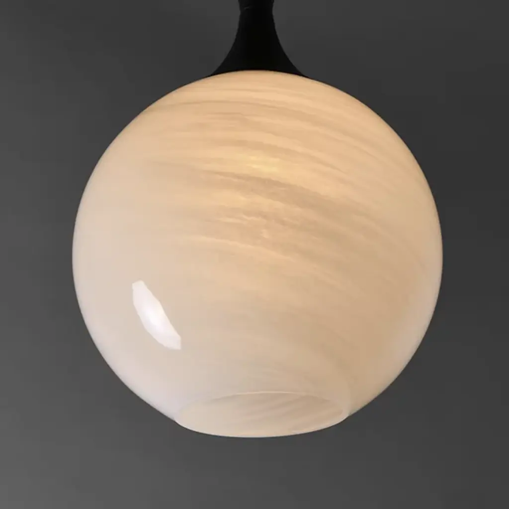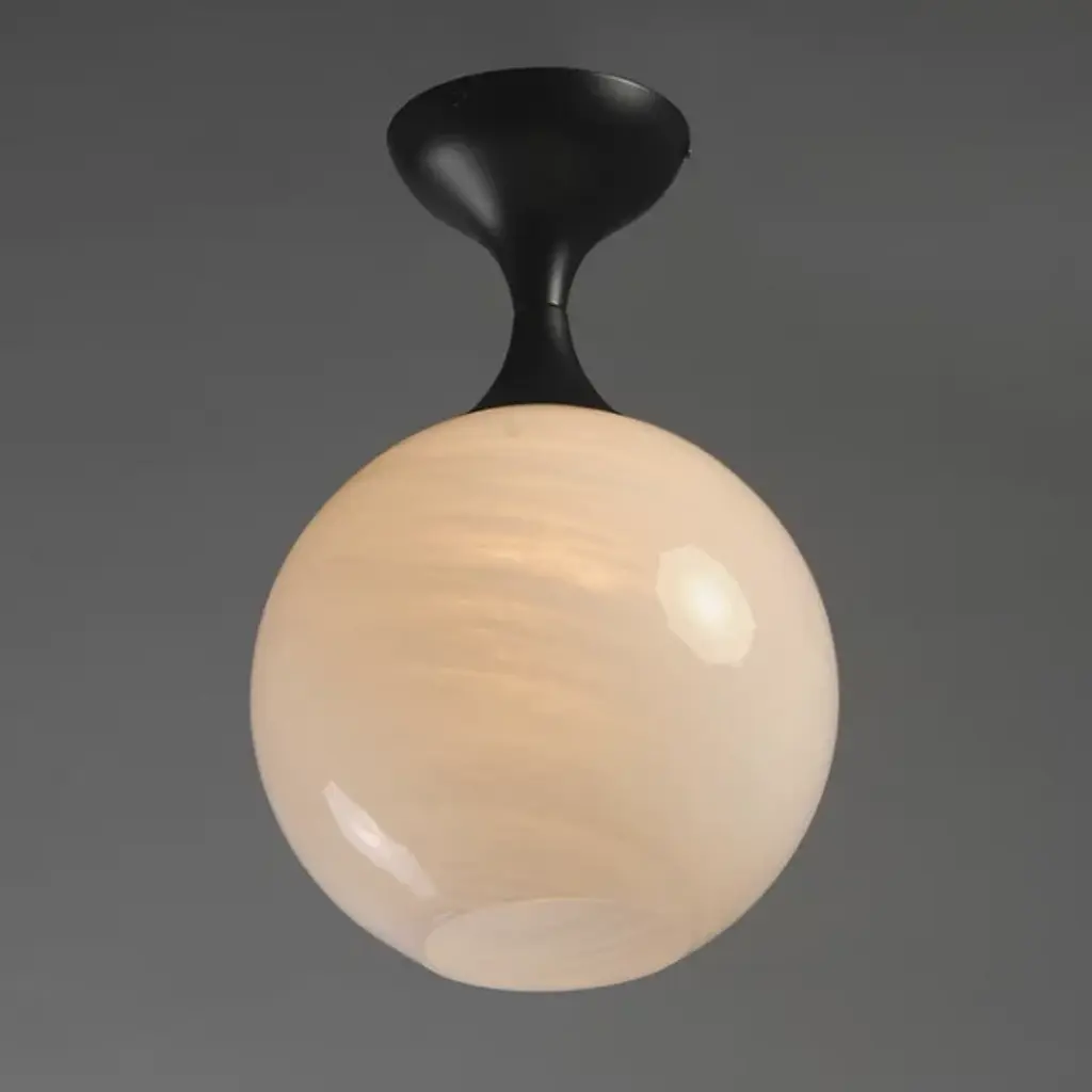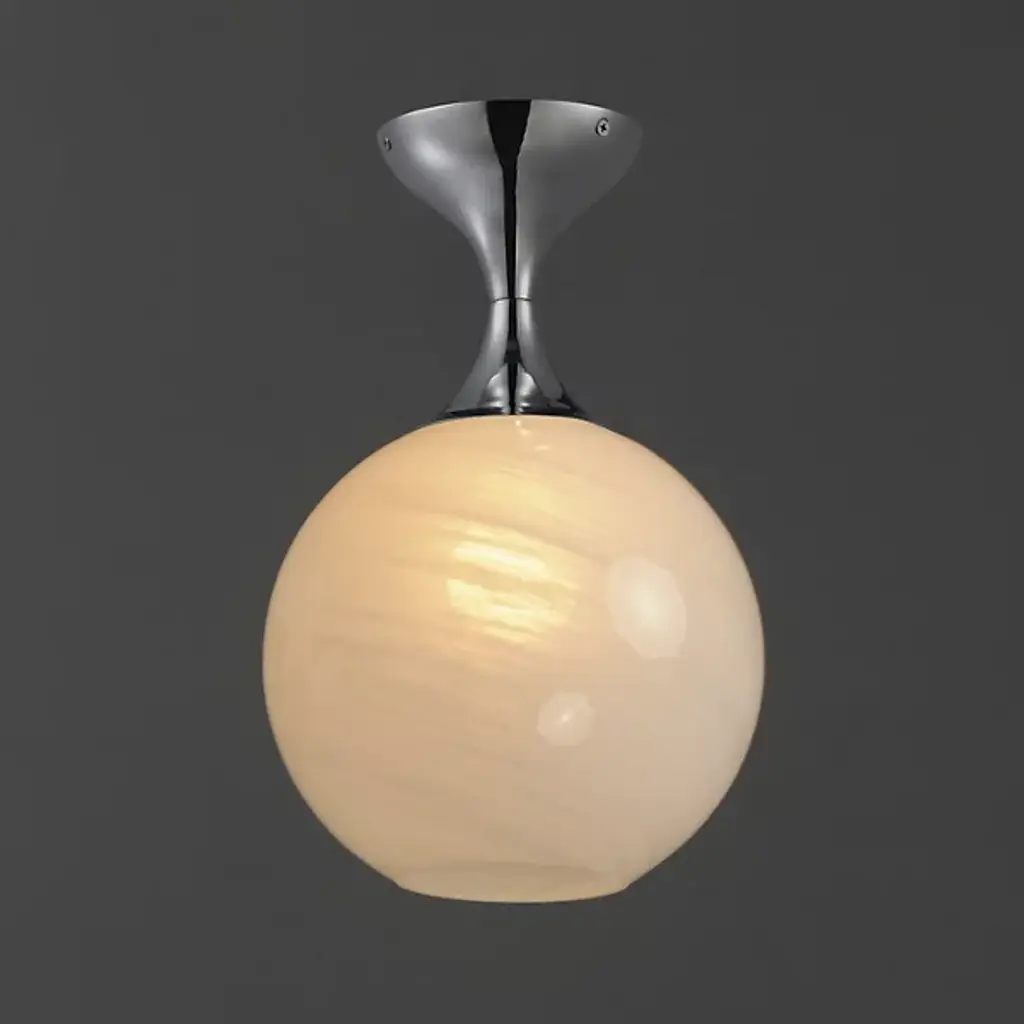 The Neve Semi-Flushmount from Maxim Lighting suspends a perfect marble-patterned sphere from a tapered hourglass connector that draws the eye upward. The swirling white patterns within the glass globe create a celestial quality that changes depending on the viewing angle and lighting conditions. Light diffuses evenly through the globe's surface, eliminating harsh shadows while maintaining enough brightness for practical use. The simple stem mount creates breathing room between the ceiling and globe, allowing the fixture to read as a floating element rather than a flush installation.