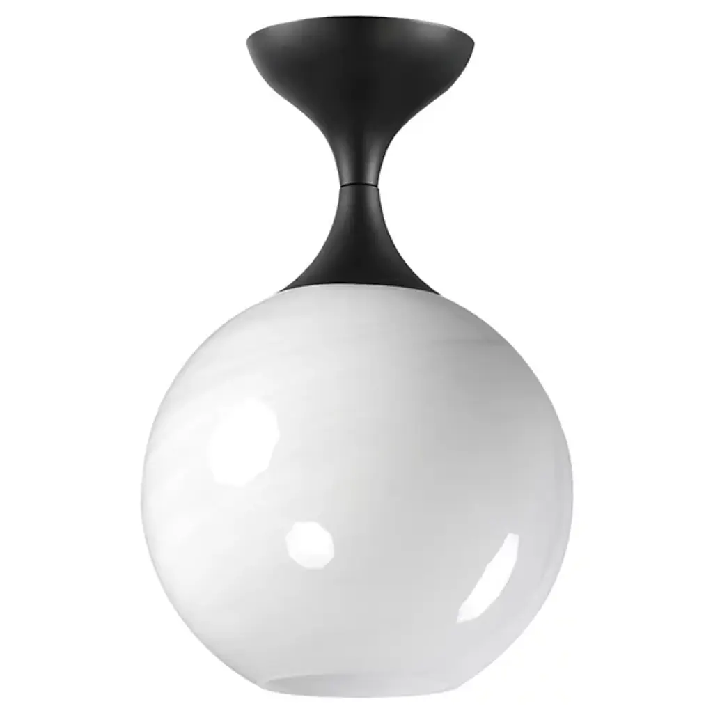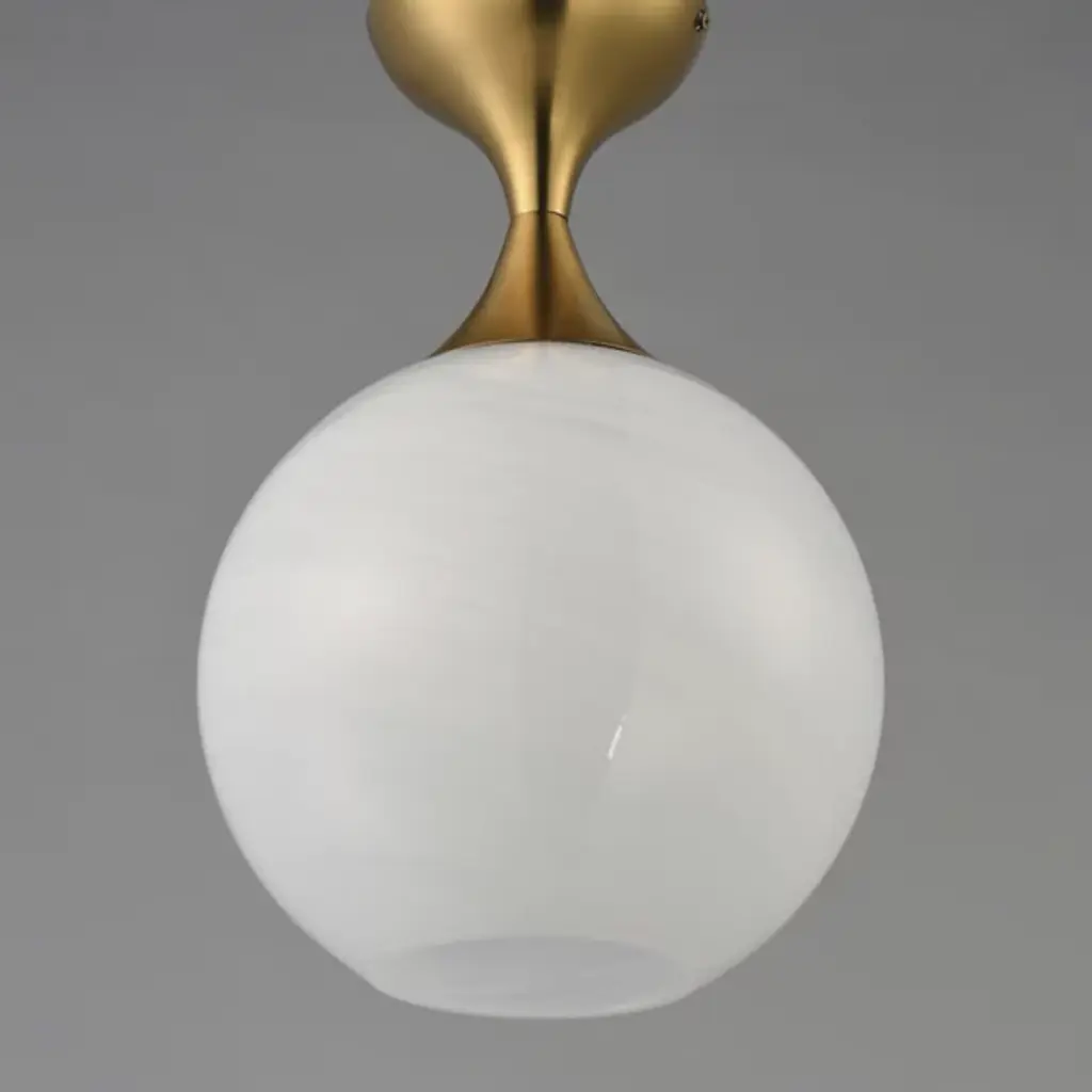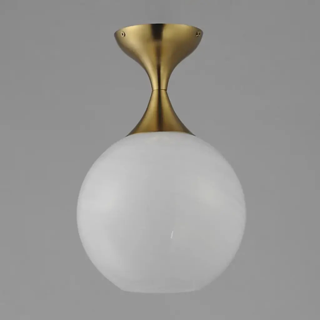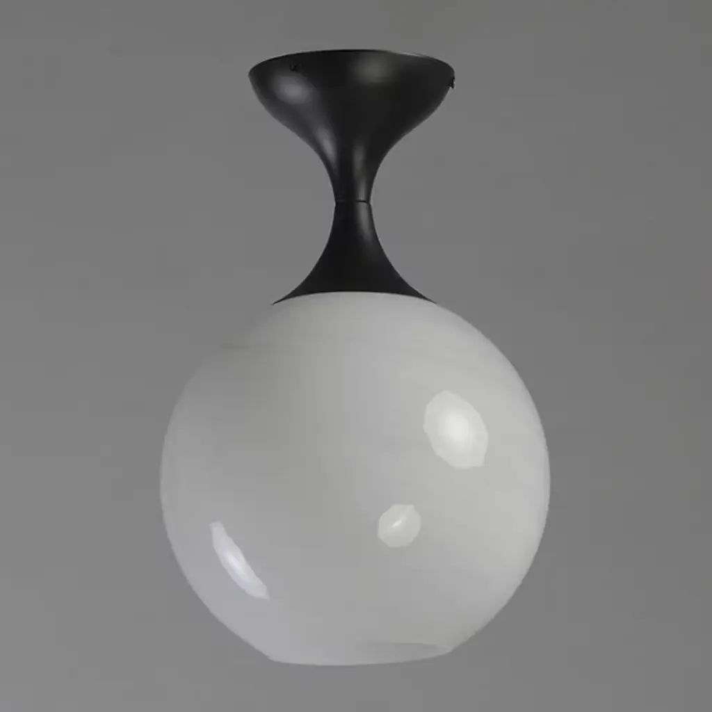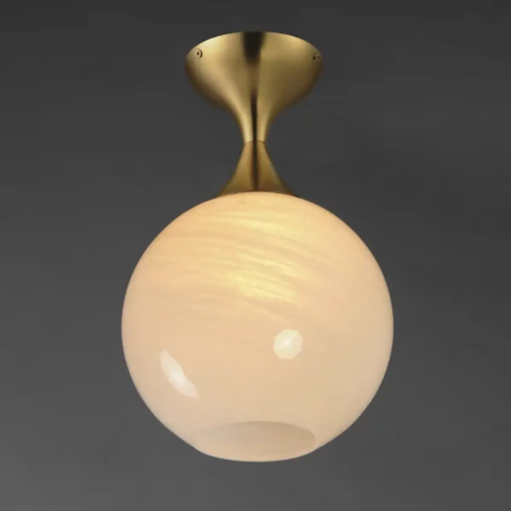 The Neve Semi-Flushmount from Maxim Lighting suspends a perfect marble-patterned sphere from a tapered hourglass connector that draws the eye upward. The swirling white patterns within the glass globe create a celestial quality that changes depending on the viewing angle and lighting conditions. Light diffuses evenly through the globe's surface, eliminating harsh shadows while maintaining enough brightness for practical use. The simple stem mount creates breathing room between the ceiling and globe, allowing the fixture to read as a floating element rather than a flush installation.