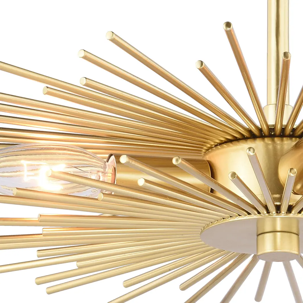 The Nikko collection is bursting with excitement and warmth. Gold finished rods playfully radiate from the central band like rays from the sun. This mid-century modern look is a flirty throwback to a simpler age. With its personality and charm, the Nikko collection feels like a familiar friend, sure to make a statement in any entryway, hallway, or bedroom.