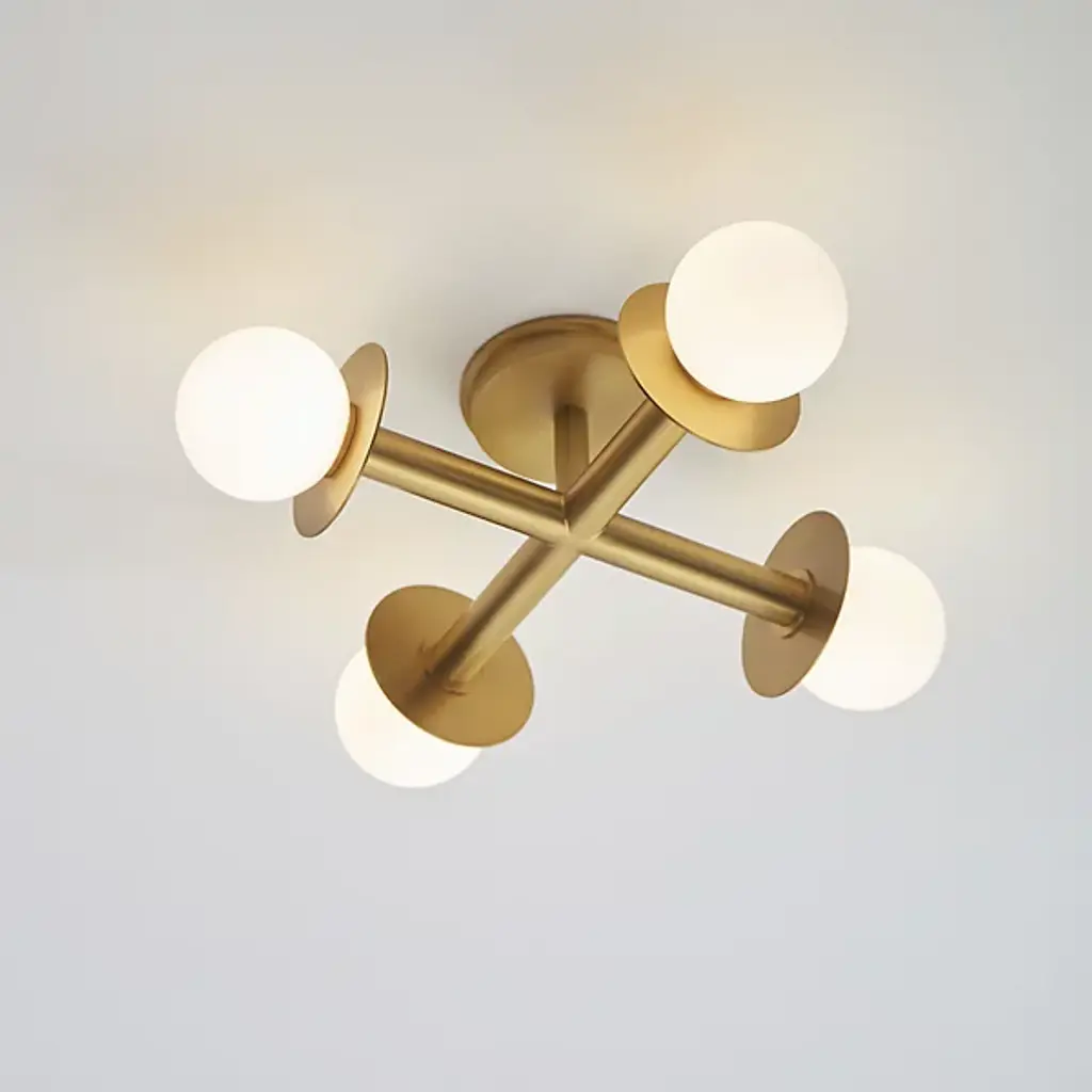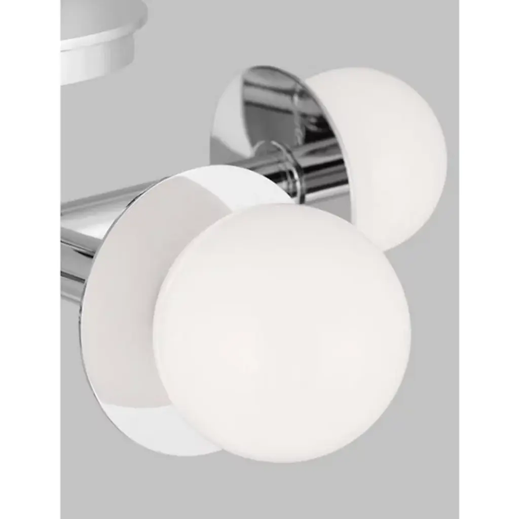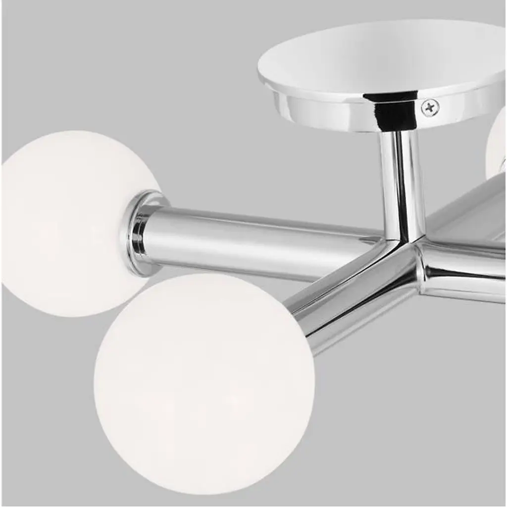 A simple yet abstract shape. The Nodes Semi-Flushmount from Visual Comfort Studio, formerly known as Kelly by Kelly Wearstler, has a minimalist design that will nonetheless bring a sense of contemporary style to your hallway, dining room, or living room. It features two Steel beams cross each other at a perpendicular angle with each beam ending on either end in a light fitting and a flat, round disk. A Glass globe covers the bulbs and provides a beautiful contrast of materials to this product.