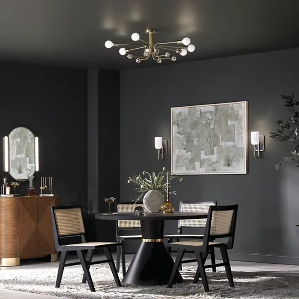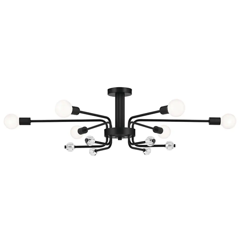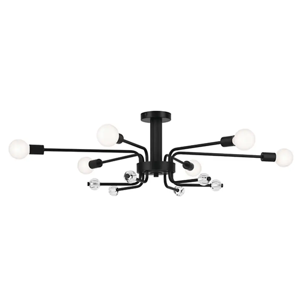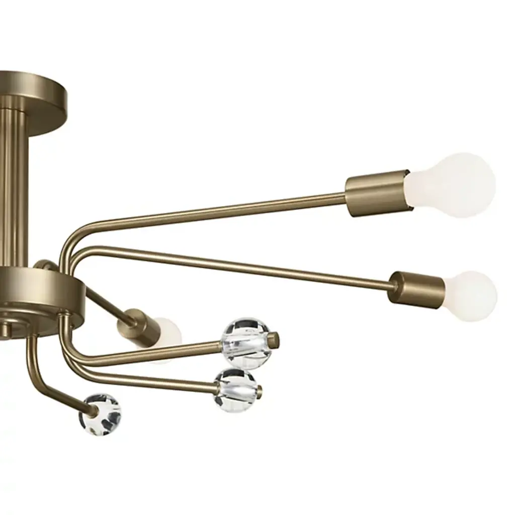 The Ocala 41.25 Inch 6 Light Semi-Flushmount by Kichler features a unique sunburst design with six arms that radiate outward from a central disk. The arms are adorned with clear crystal spheres that add a touch of luxury. Its Art Deco design makes it the quintessential statement piece you've been searching for. It is dimmable, so you can create the perfect mood for any room, from traditional to contemporary.