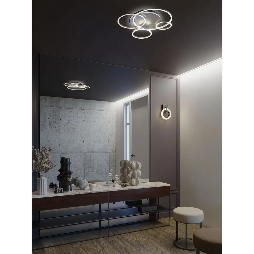 The orbit LED semi-flushmount seamlessly blends into any living room or dining room, offering a modern take on traditional lighting. Its sleek steel and acrylic design creates an inviting ambiance, perfect for transitional spaces. Ideal for adding a touch of sophistication to your home, this fixture provides ample lighting and style.
