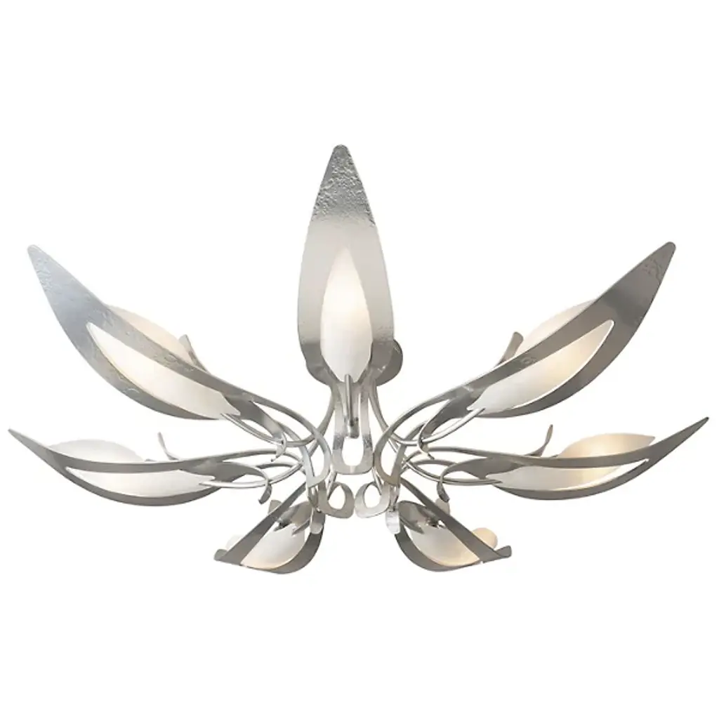 The Parasol Semi-Flushmount fixture by Hubbardton Forge offers a stunning way to bring illumination and style to any space. With a design that seamlessly blends delicacy and grandeur, this fixture captivates with its unique craftsmanship. Each arm is carefully constructed to cradle a piece of slumped art glass, creating a visually striking effect. HF designer Jason Hancock recommends using a "milky" candelabra bulb to achieve an elegant ambiance. Crafted from high-quality steel and glass, this fixture embodies both durability and sophistication.