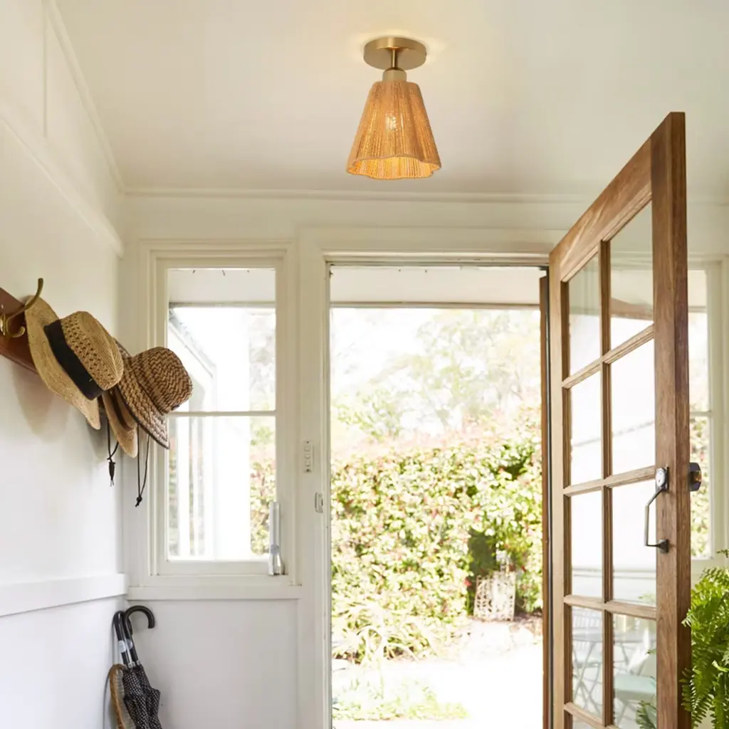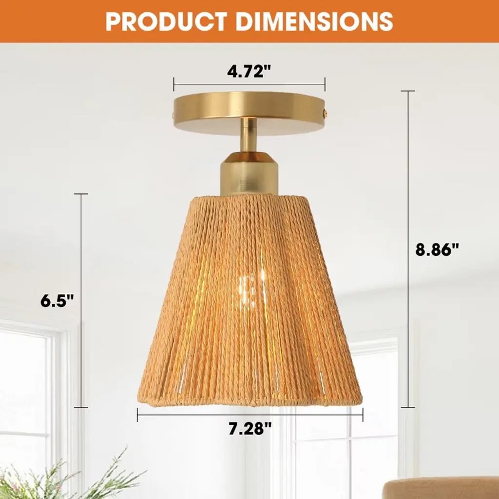 This exquisite 7-inch Rustic Semi-Flush Mount Ceiling Light skillfully combines natural materials with modern design, injecting a warm and cozy atmosphere into your space. The lampshade is crafted with natural jute fiber and metal, which not only retains the rustic texture of jute, but also gives it a solid sense of support through the metal frame, and the overall shape is like a blossoming flower, with soft and layered lines, adding a touch of art to the ceiling.