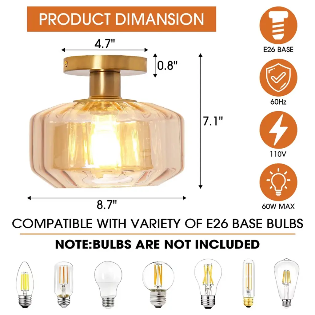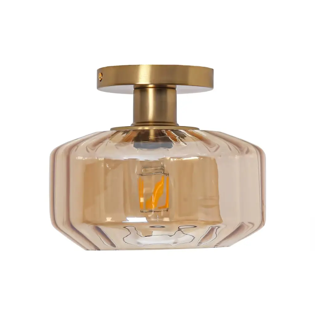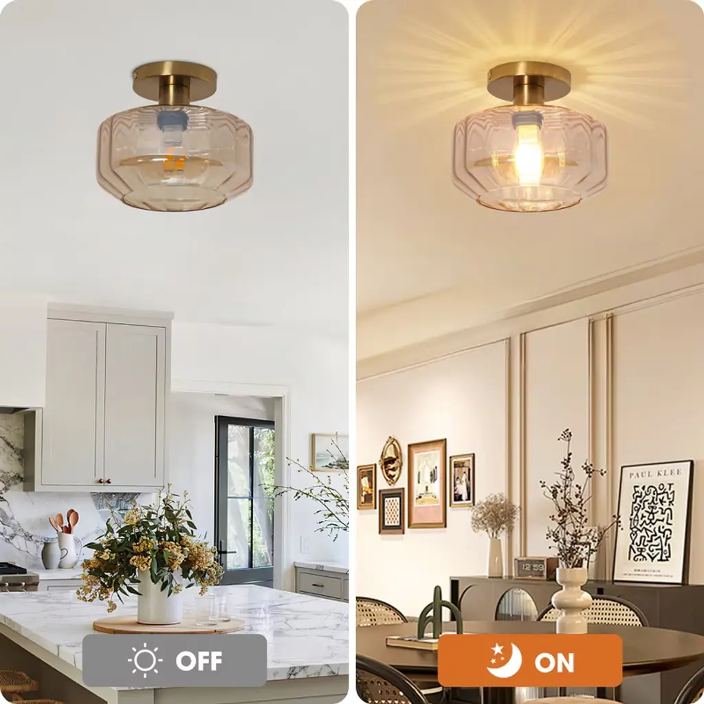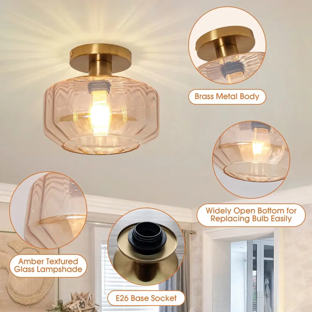 This 9-inch modern semi-flush mount ceiling light interprets the essence of contemporary home aesthetics in a minimalist design language. The gold metal finish presents a delicate matte texture, as calm and restrained as the night. Transparent glass shade is made of high borosilicate material blown at high temperature, the crystal clear dome shape is like a solidified water droplet, and the surface is specially added with a micro-prism etching process. When the light source is on, the light is refracted by millions of microscopic prisms, creating a unique stellar scattering effect that transforms direct light into layers of halos. Adding a touch of luxury texture in the contrast of brass and light brown.