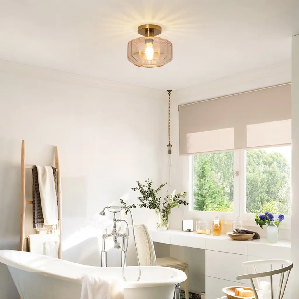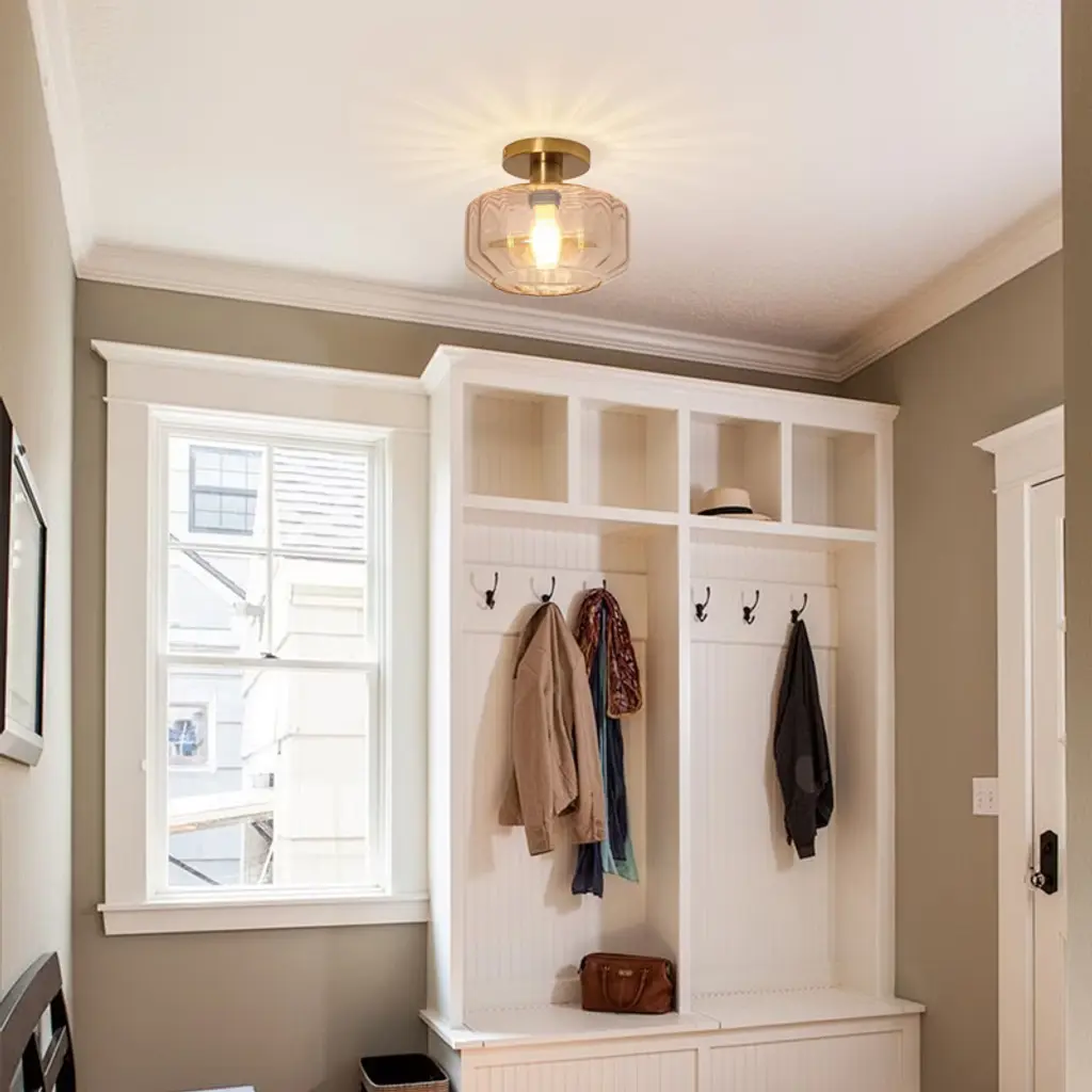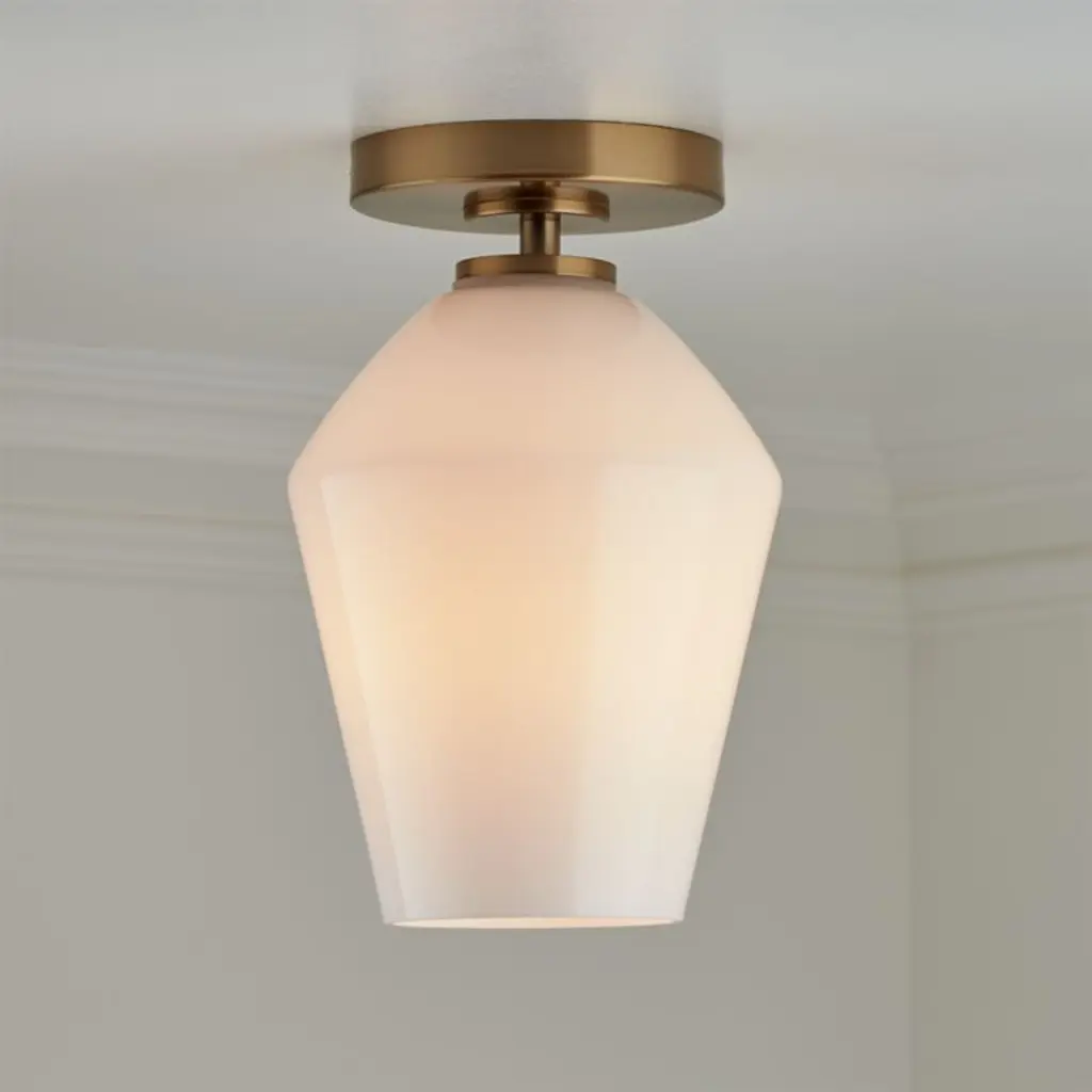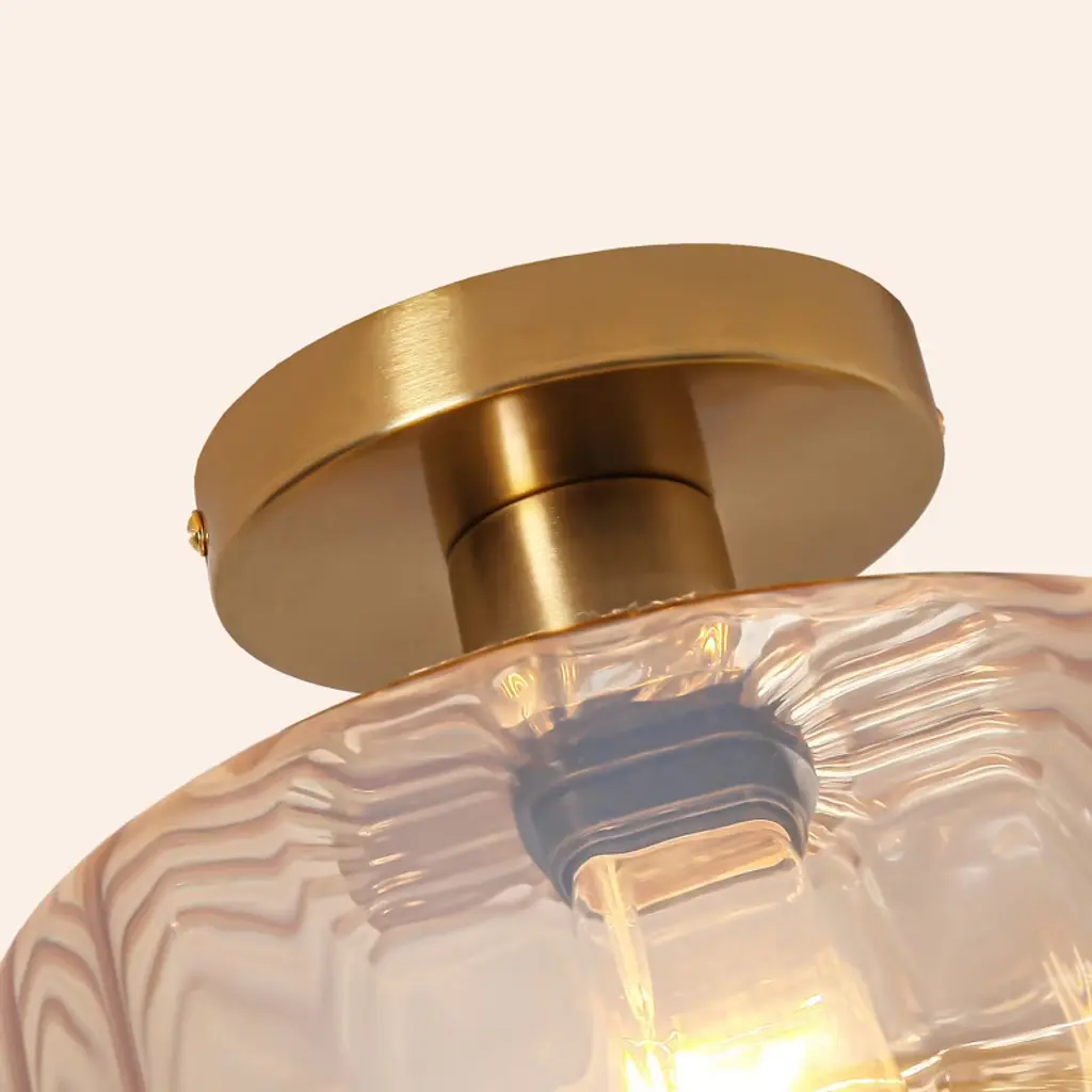 This 9-inch modern semi-flush mount ceiling light interprets the essence of contemporary home aesthetics in a minimalist design language. The gold metal finish presents a delicate matte texture, as calm and restrained as the night. Transparent glass shade is made of high borosilicate material blown at high temperature, the crystal clear dome shape is like a solidified water droplet, and the surface is specially added with a micro-prism etching process. When the light source is on, the light is refracted by millions of microscopic prisms, creating a unique stellar scattering effect that transforms direct light into layers of halos. Adding a touch of luxury texture in the contrast of brass and light brown.