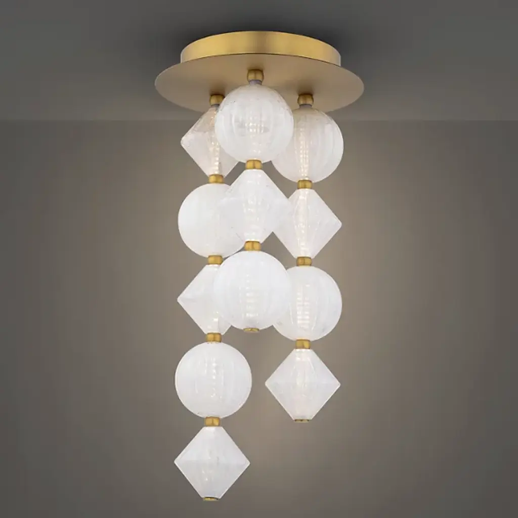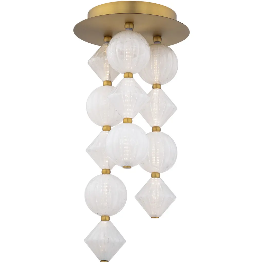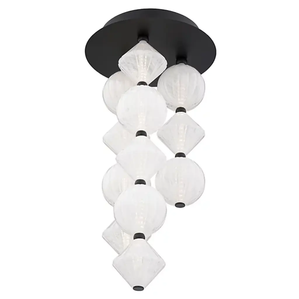 The Pearla 2523 LED Semi-Flushmount from Modern Forms cascades mouth-blown art glass diamonds and orbs in a dramatic three-dimensional composition that descends from a polished round canopy. Each glass element displays individual patterns created during the artisanal blowing process, making every fixture unique. The aluminum construction supports opaque glass diffusers that create warm, even illumination throughout the space. This flushmount design brings together traditional glassmaking techniques with contemporary LED technology for both functional lighting and artistic statement.