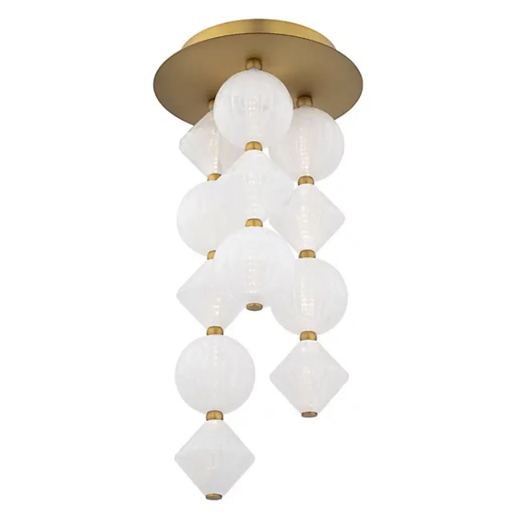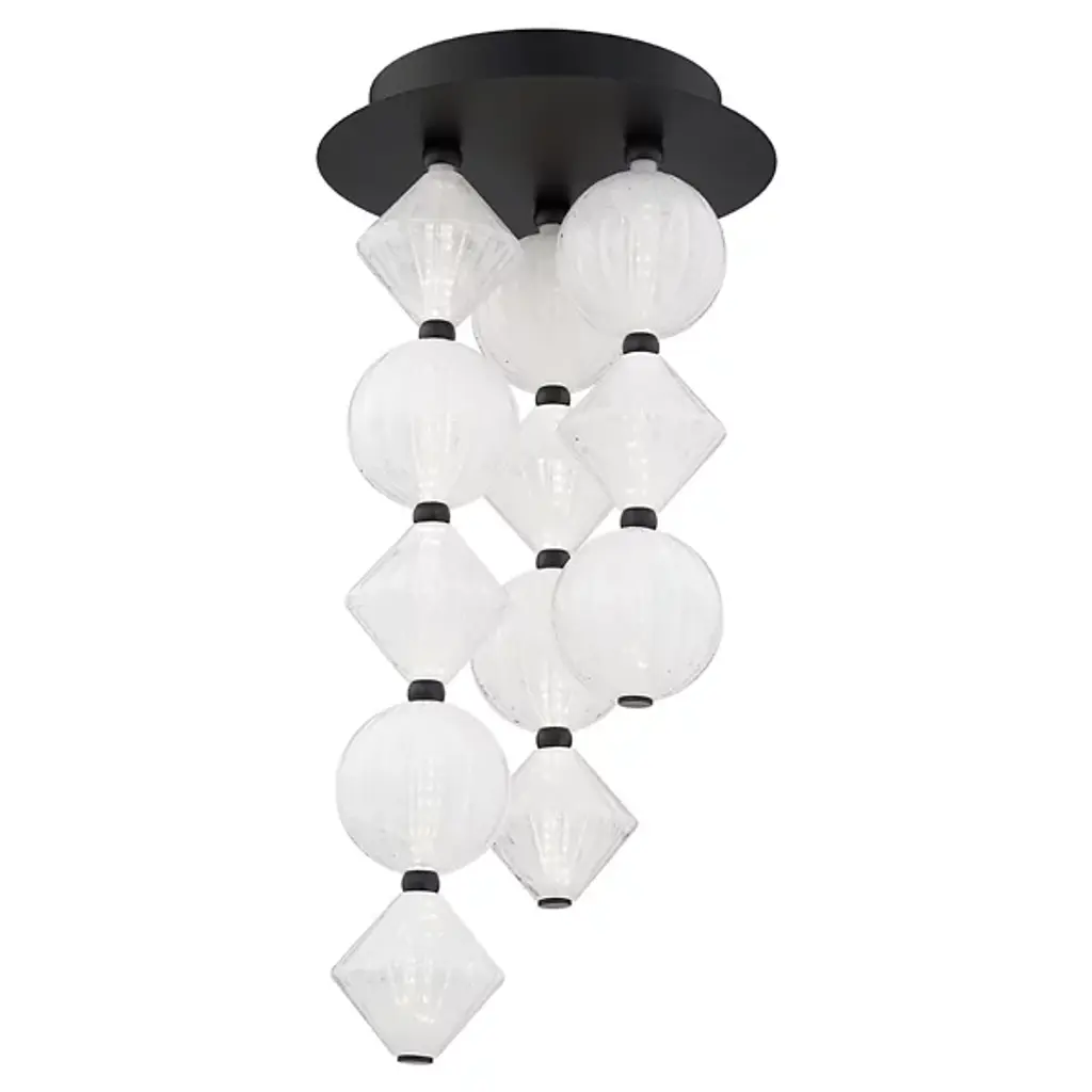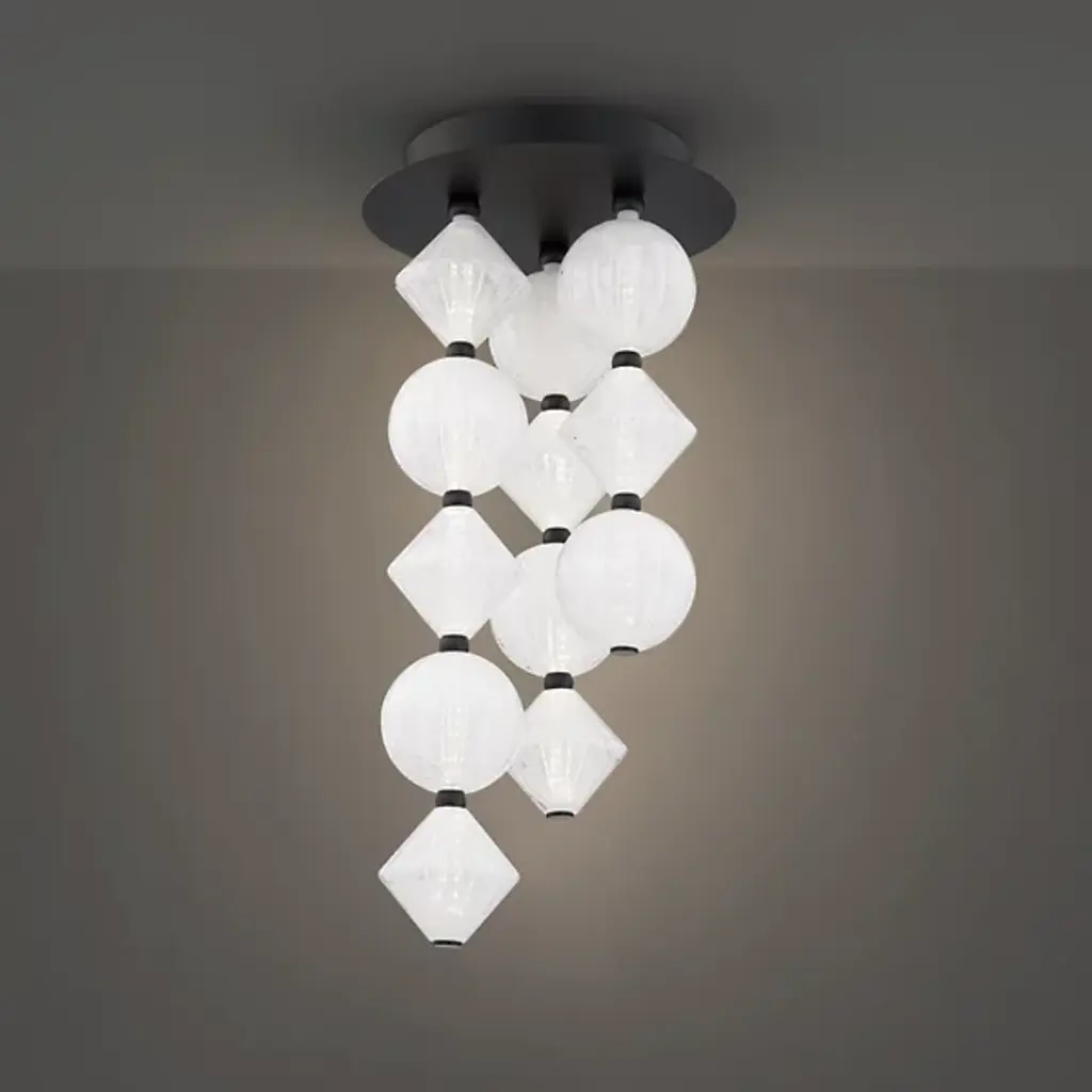 The Pearla 2523 LED Semi-Flushmount from Modern Forms cascades mouth-blown art glass diamonds and orbs in a dramatic three-dimensional composition that descends from a polished round canopy. Each glass element displays individual patterns created during the artisanal blowing process, making every fixture unique. The aluminum construction supports opaque glass diffusers that create warm, even illumination throughout the space. This flushmount design brings together traditional glassmaking techniques with contemporary LED technology for both functional lighting and artistic statement.