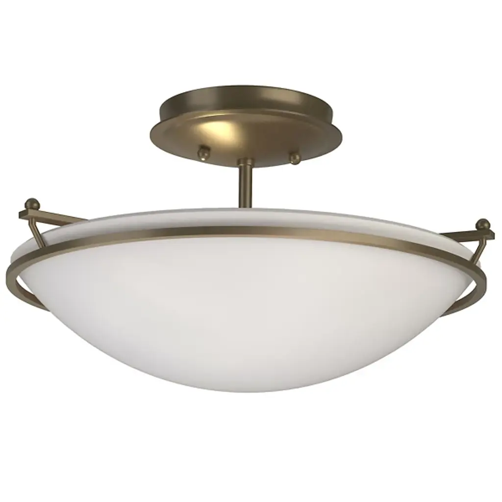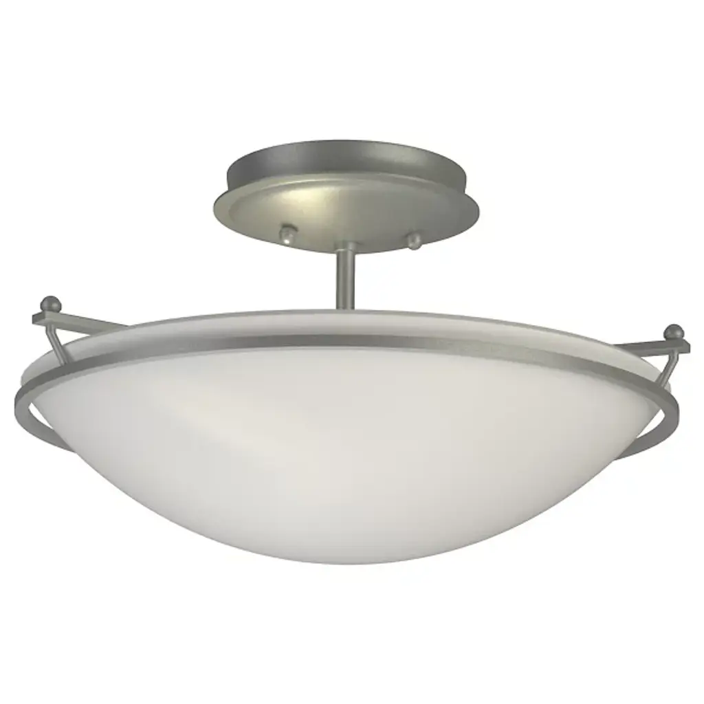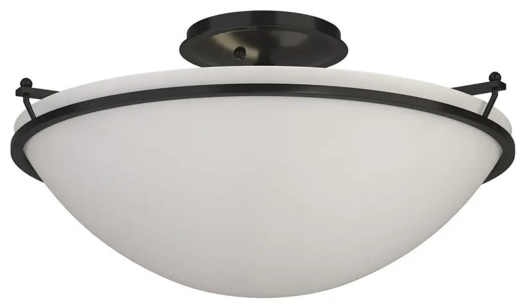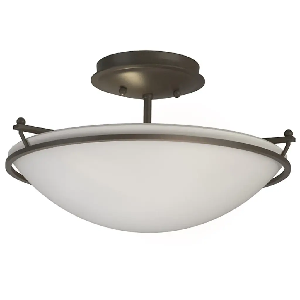 The Plain Semi-Flushmount by Hubbardton Forge may be simple, but it is an elegant and artisan crafted addition to the home. A hand-blown bowl-shaped Glass shade diffuses light beautifully. Supported by a circular canopy, a hand forged wrought Iron frame encircles the top of the Glass bowl. With a clean silhouette that is highlighted by the neat and tailored lines of metalwork, this fixture adds warm lighting to hallways, entryways and a variety of living spaces.