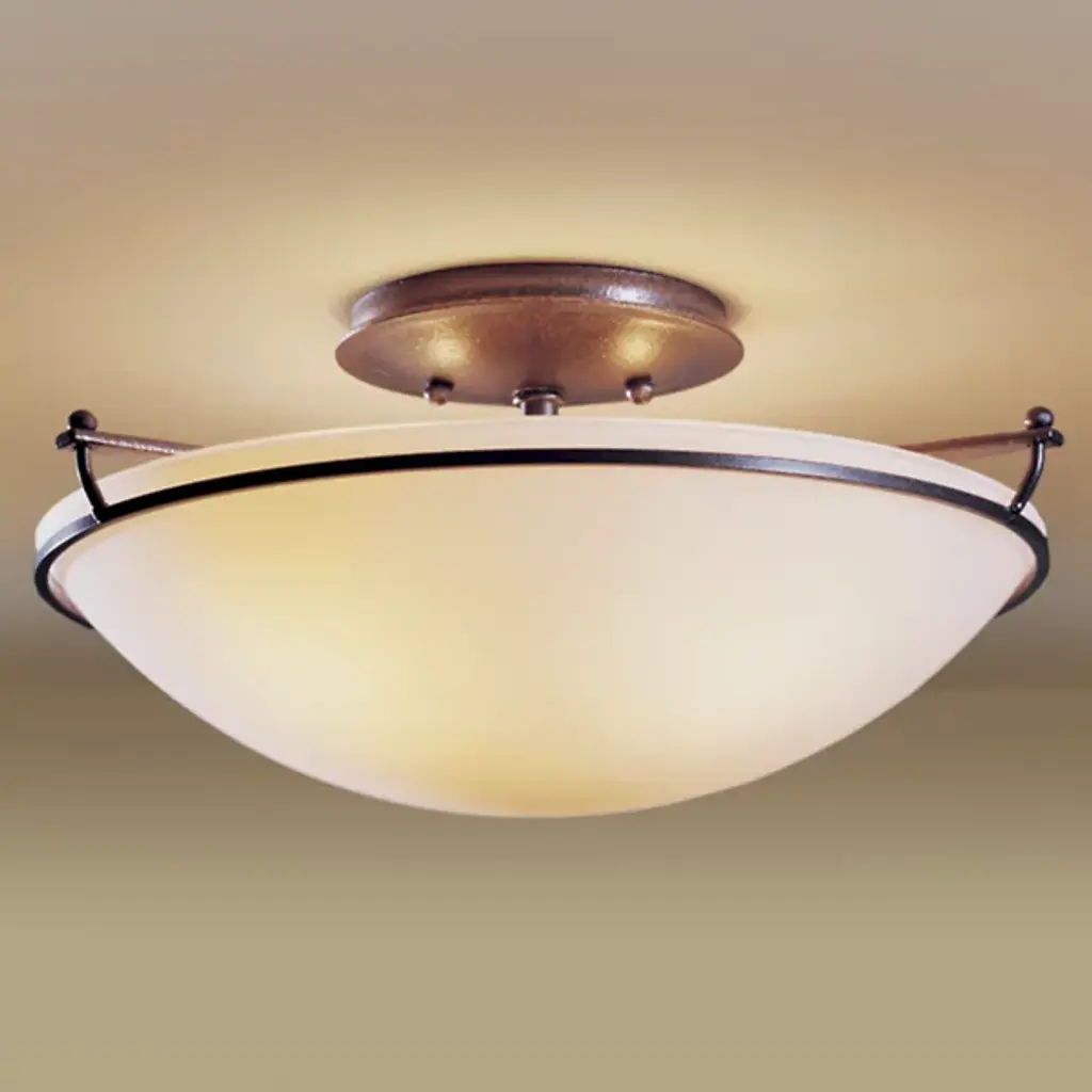 The Plain Semi-Flushmount by Hubbardton Forge may be simple, but it is an elegant and artisan crafted addition to the home. A hand-blown bowl-shaped Glass shade diffuses light beautifully. Supported by a circular canopy, a hand forged wrought Iron frame encircles the top of the Glass bowl. With a clean silhouette that is highlighted by the neat and tailored lines of metalwork, this fixture adds warm lighting to hallways, entryways and a variety of living spaces.
