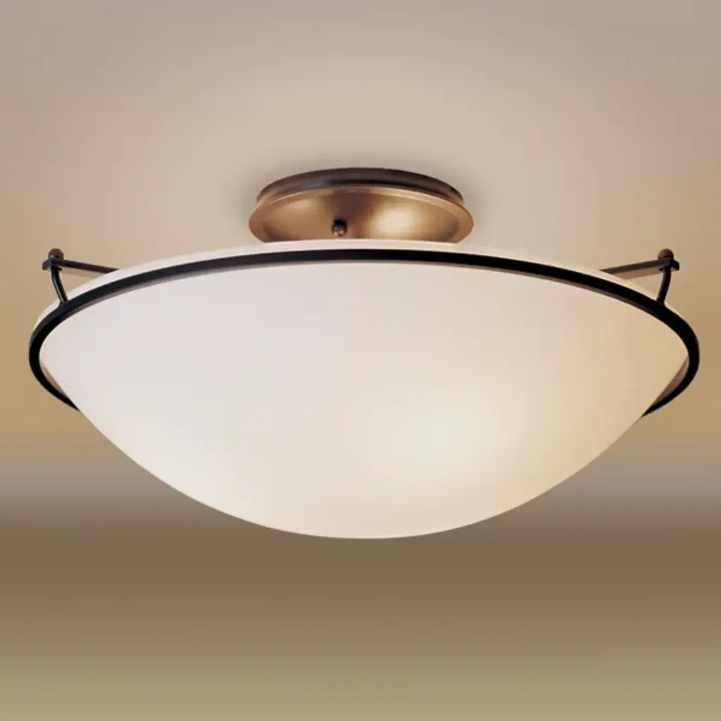 The Plain Semi-Flushmount by Hubbardton Forge may be simple, but it is an elegant and artisan crafted addition to the home. A hand-blown bowl-shaped Glass shade diffuses light beautifully. Supported by a circular canopy, a hand forged wrought Iron frame encircles the top of the Glass bowl. With a clean silhouette that is highlighted by the neat and tailored lines of metalwork, this fixture adds warm lighting to hallways, entryways and a variety of living spaces.