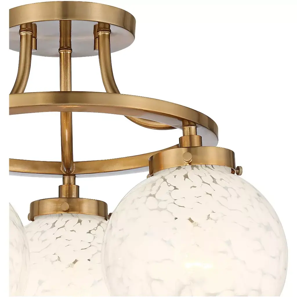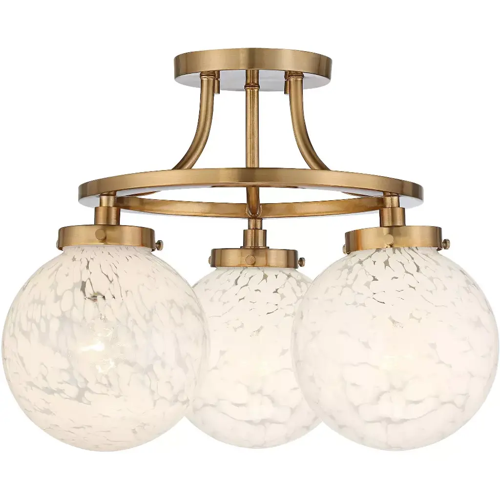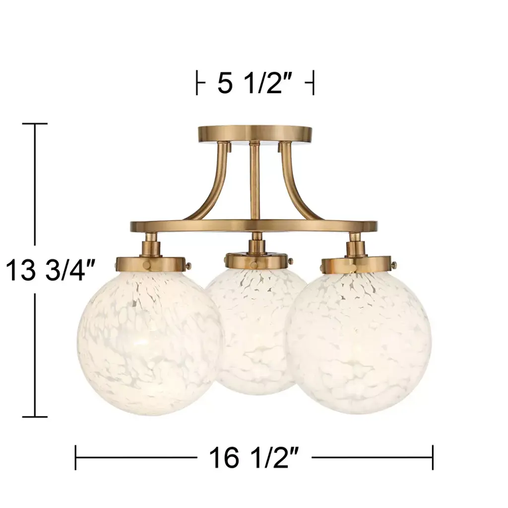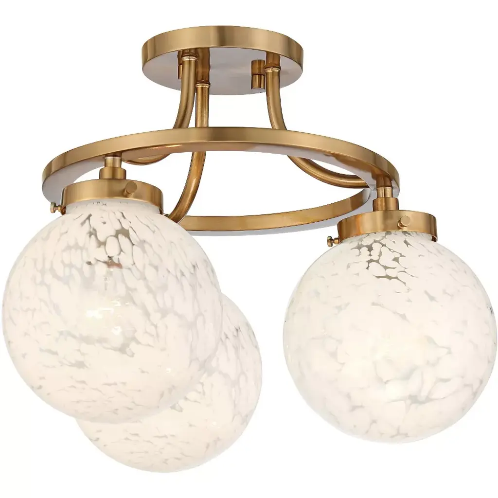 Get glamorous with your lighting. This Mid-Century Modern ceiling light from Possini Euro Design is a gorgeous addition to any living space. It comes in a warm aged brass finish metal frame, which supports three round art glass globe shades that feature a subtle crackled pattern. This semi-flushmount fixture is perfect for bedrooms, kitchens, and entryways.