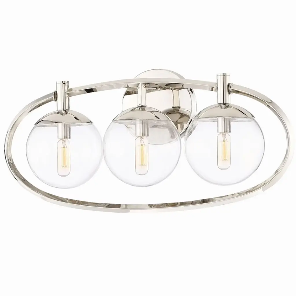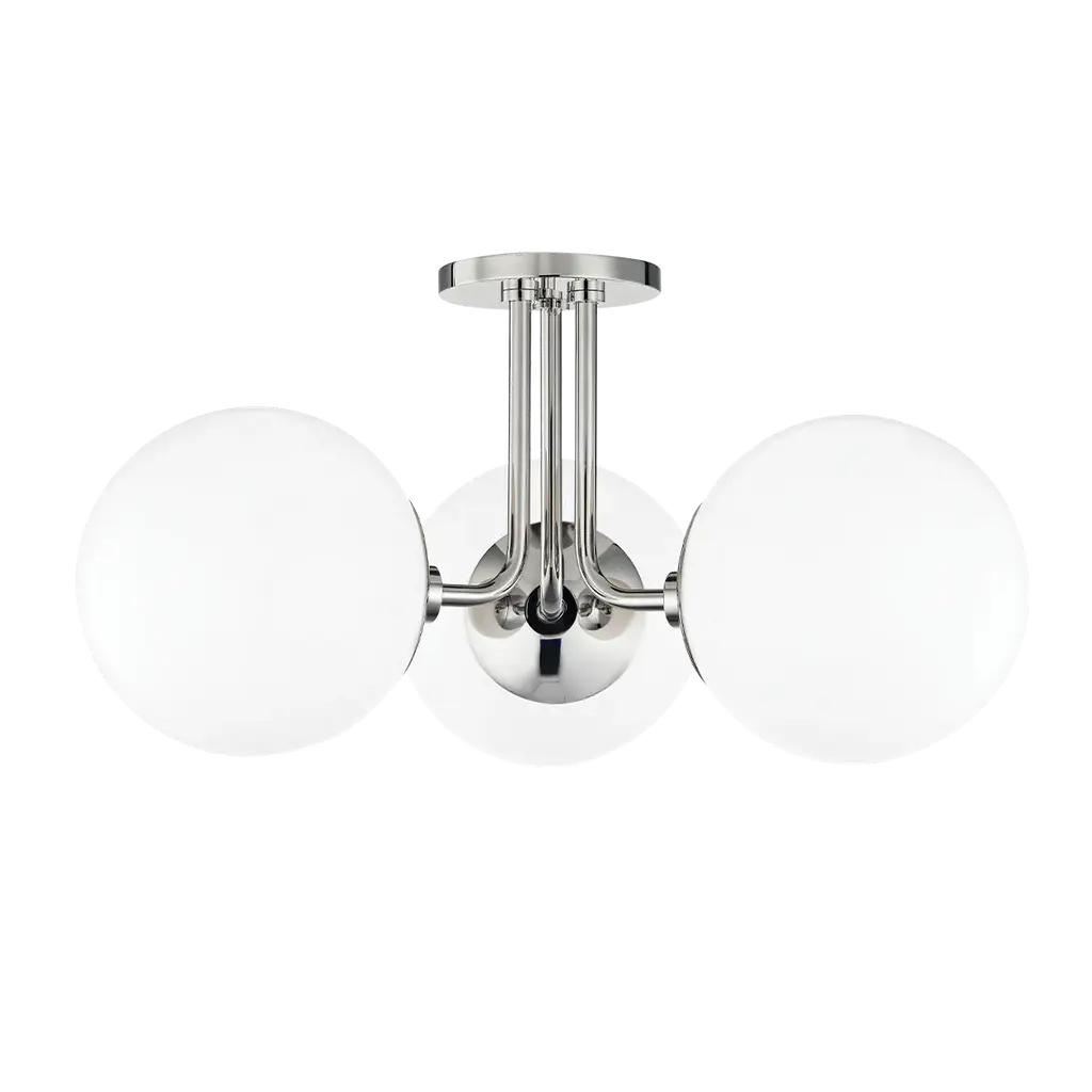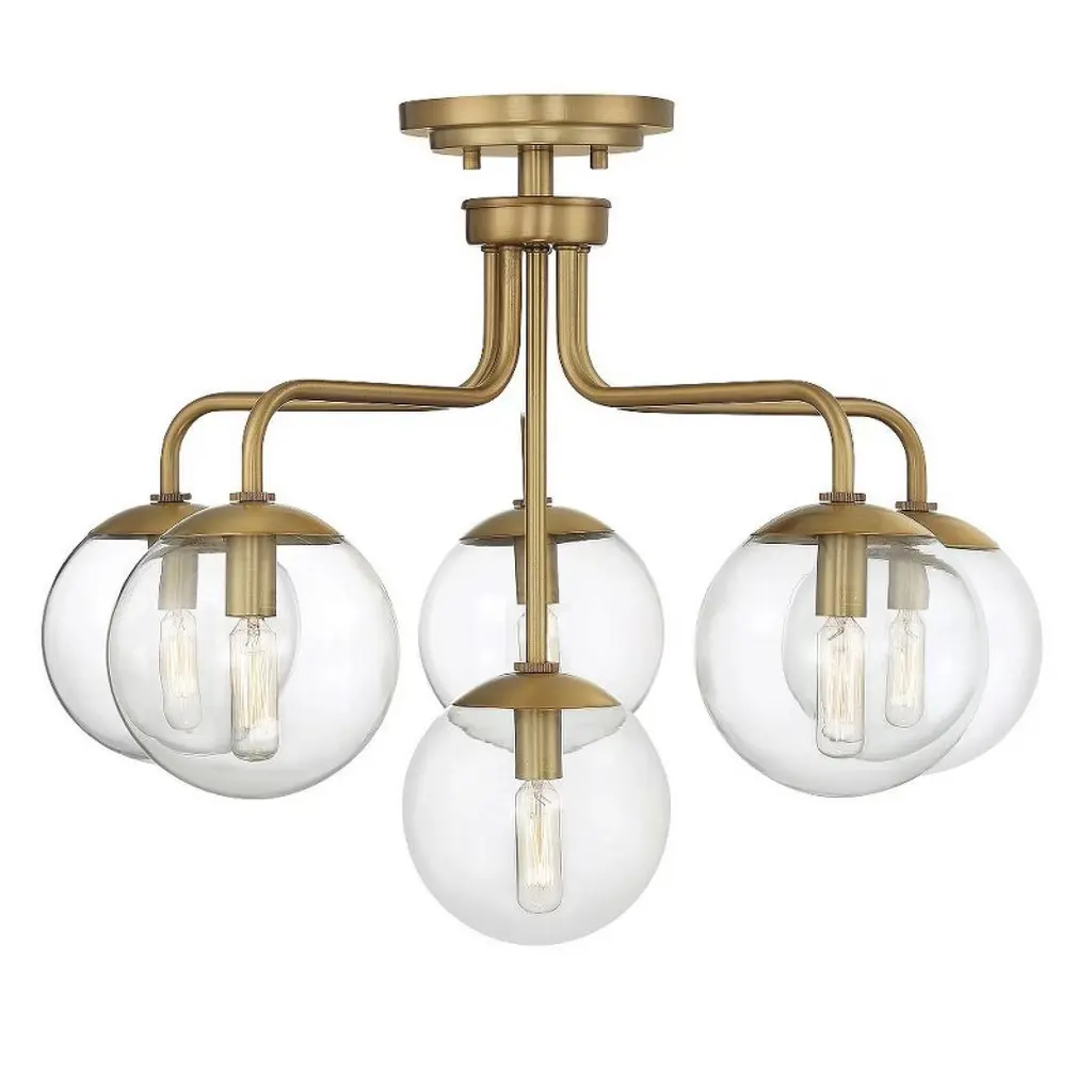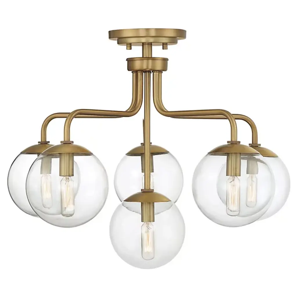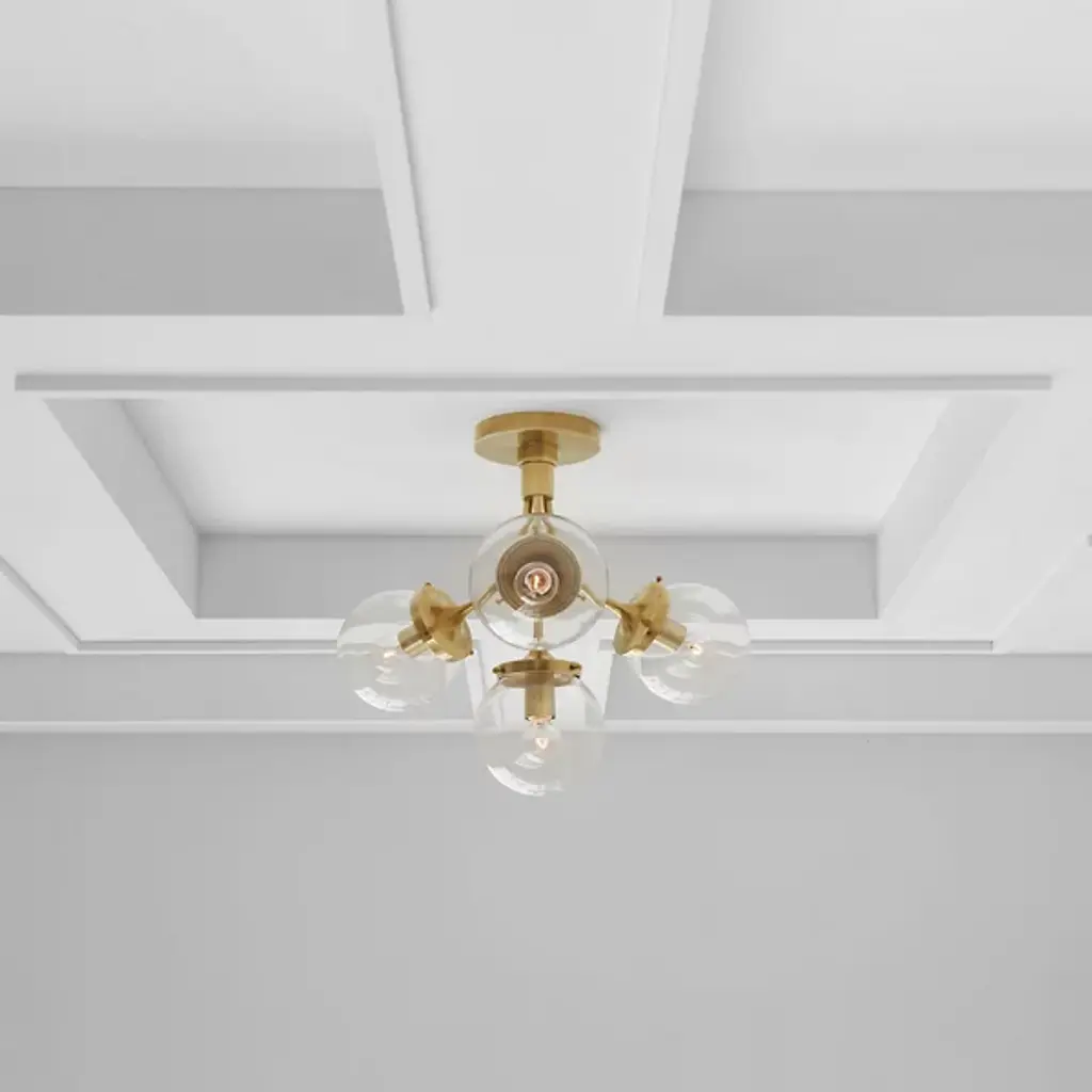 Lend an inspired enhancement to inside spaces with the sleek, swooping lines of Prescott Medium Semi-Flushmount from Visual Comfort Signature, formerly known as Visual Comfort, Retained from above by a sleek disc canopy, it sends a short cylindrical hub downward, extending a series of four slim metal stems arcing outward to terminate in damp-listed candelabra lamping. A spherical shade of clear glass blooms around each lamp, transforming direct brightness to an even, elegant warmth around the fixture.
