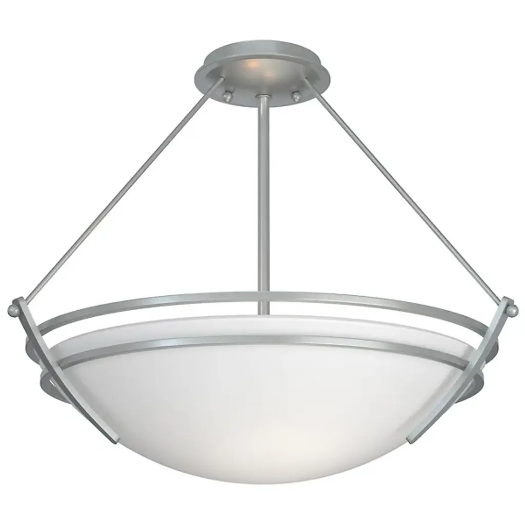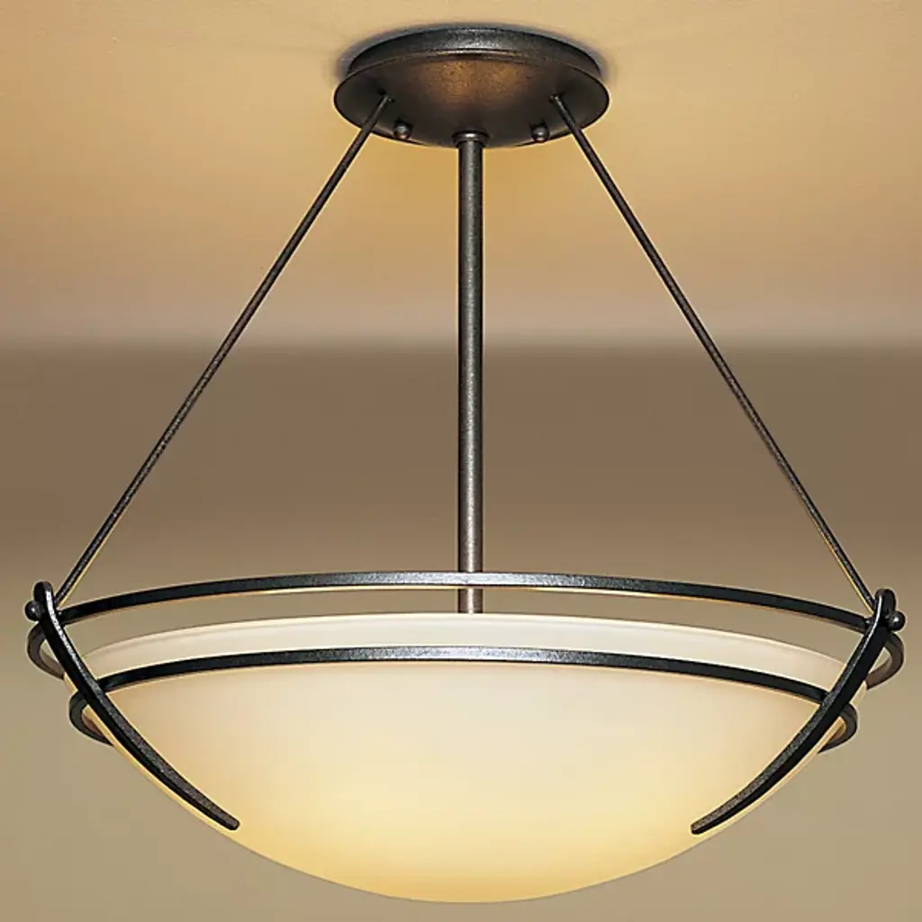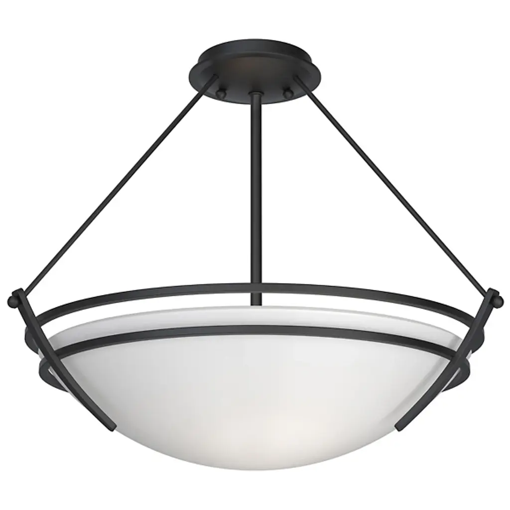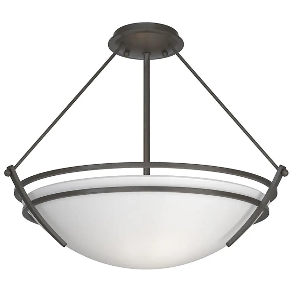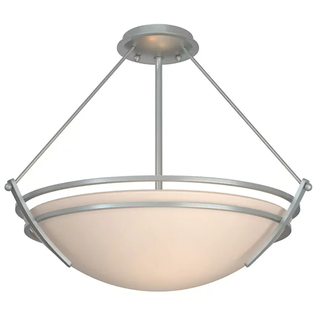 The simple and beautiful Presidio Tryne Bowl Semi-Flushmount by Hubbardton Forge adds a dramatic and handcrafted element to interior spaces while banishing shadows with its abundant uplighting. The Hand Blown Glass shade is fashioned into a smooth, elegant bowl shape, that disperses light evenly and warmly through its opaque and easygoing finish. This shade is suspended from a trio of robust yet thin Metal pieces, elegantly contrasting with the shade with impressive strength and aesthetic brilliance.