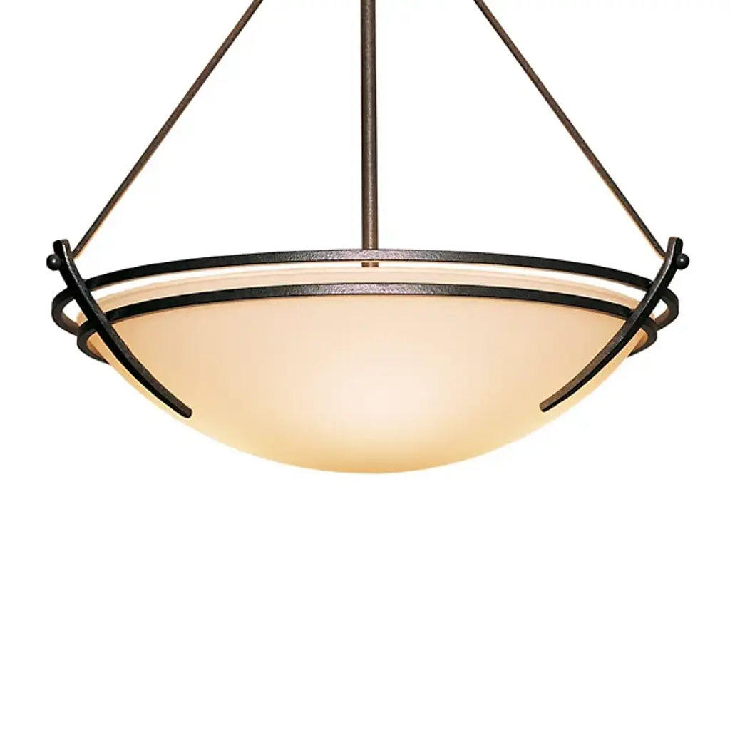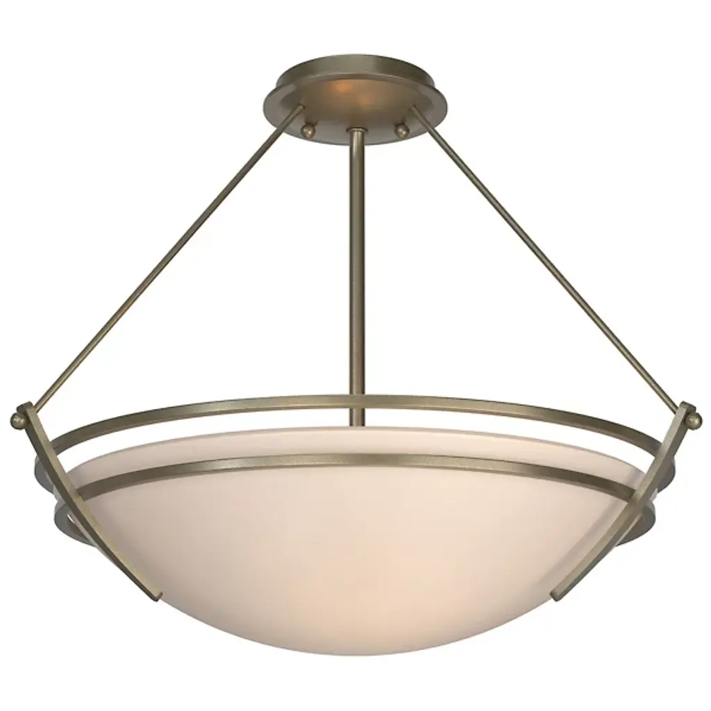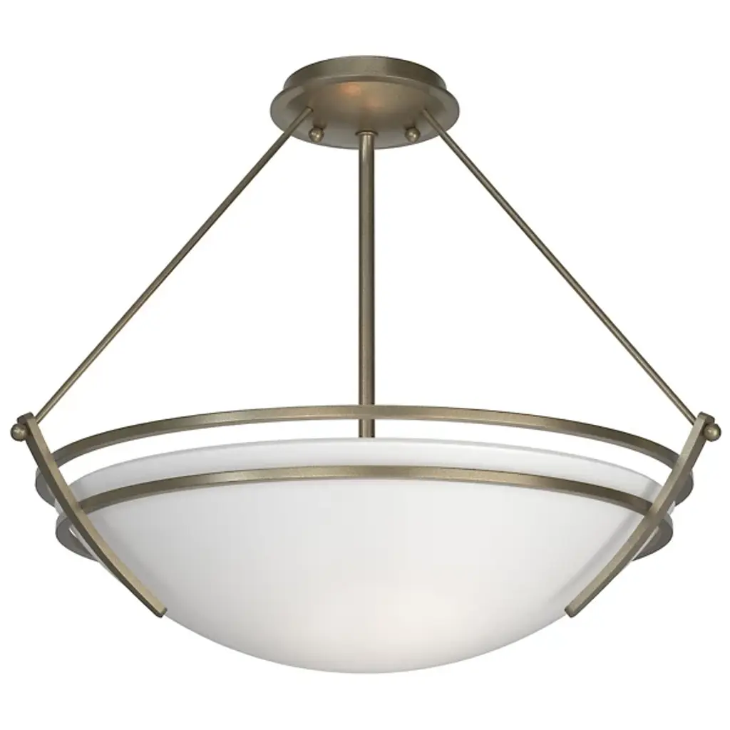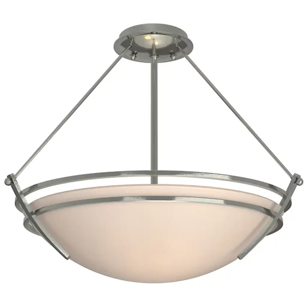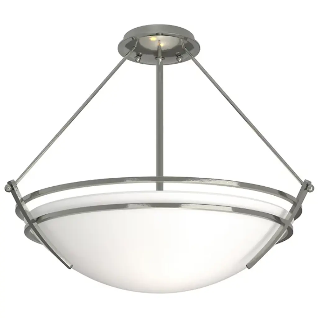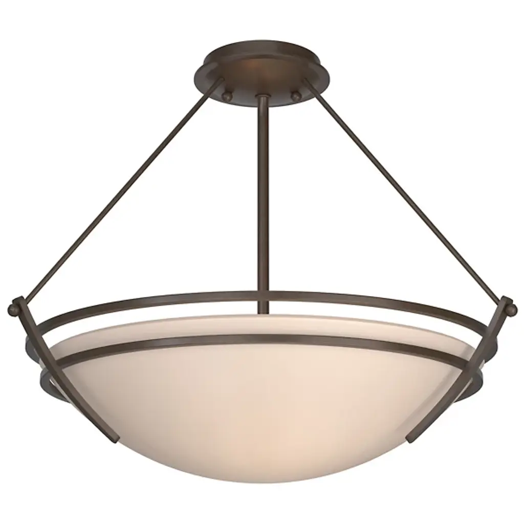 The simple and beautiful Presidio Tryne Bowl Semi-Flushmount by Hubbardton Forge adds a dramatic and handcrafted element to interior spaces while banishing shadows with its abundant uplighting. The Hand Blown Glass shade is fashioned into a smooth, elegant bowl shape, that disperses light evenly and warmly through its opaque and easygoing finish. This shade is suspended from a trio of robust yet thin Metal pieces, elegantly contrasting with the shade with impressive strength and aesthetic brilliance.