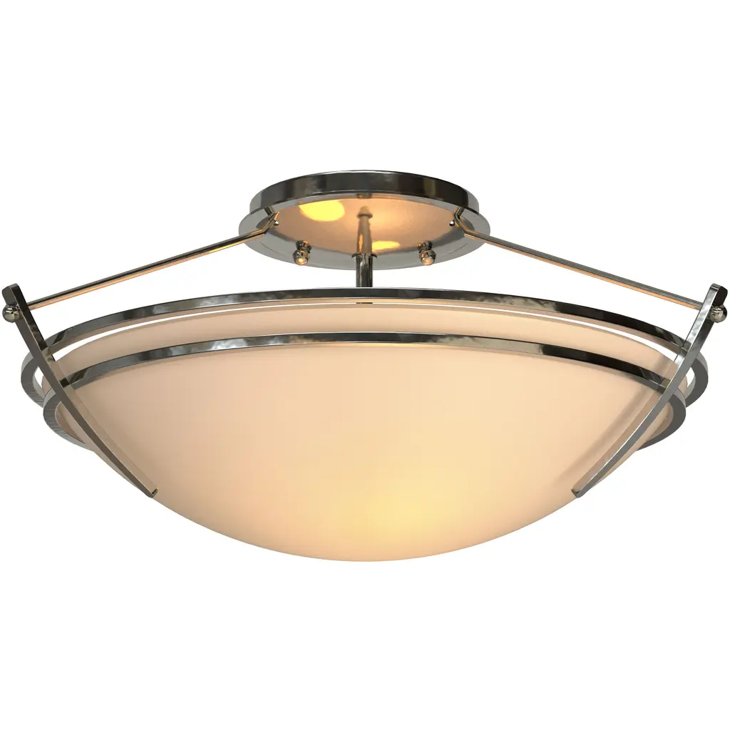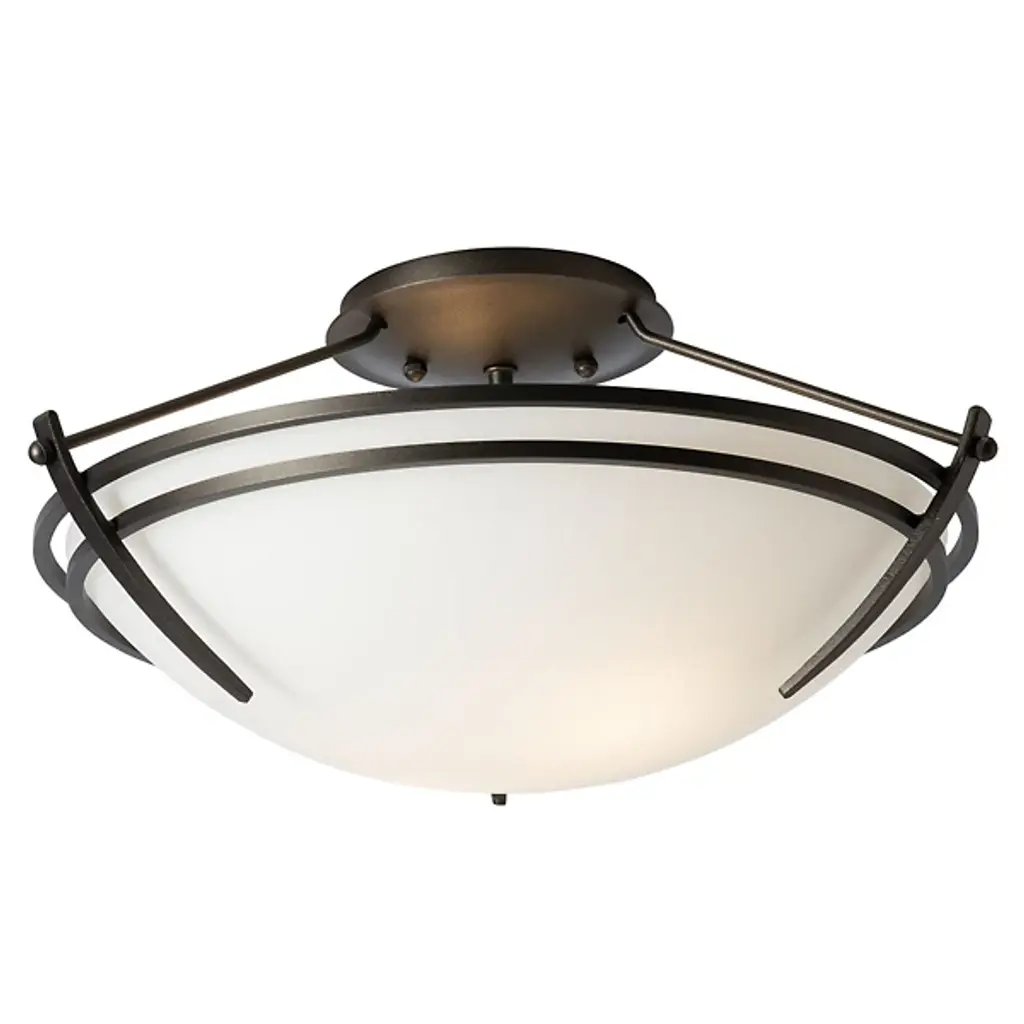 The Hubbardton Forge Presidio Tryne Semi-Flushmount creates warm, overall illumination while adding an element of handcrafted charm to interior spaces. The Presidio Tryne Bowl Semi-Flushmount features hand-blown glass shade and hand-forged wrought iron body.