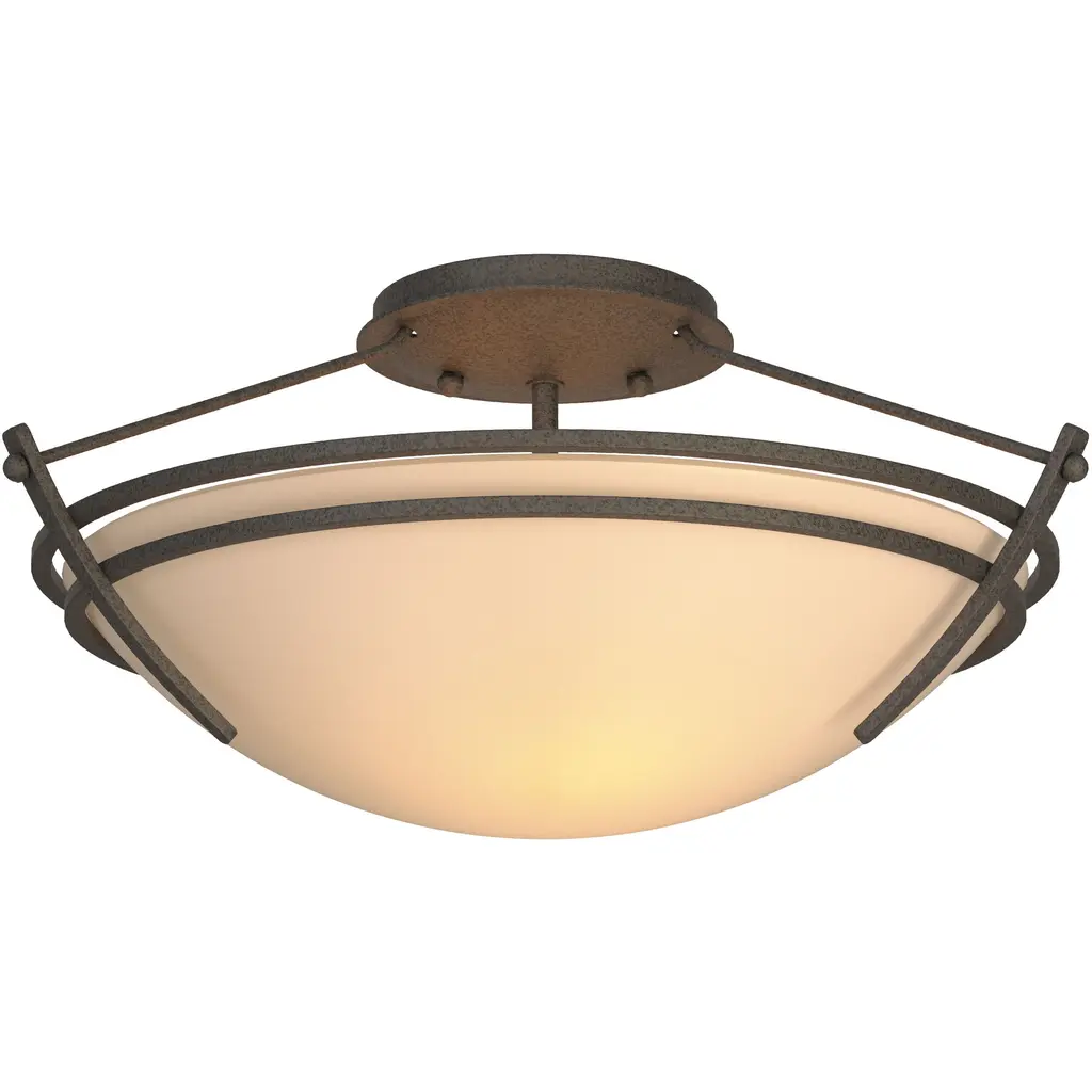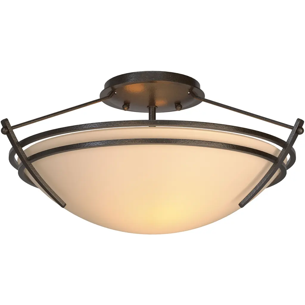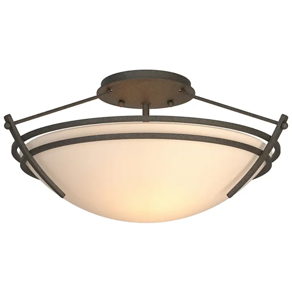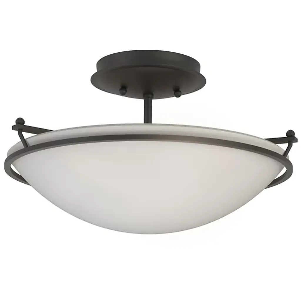 The Hubbardton Forge Presidio Tryne Semi-Flushmount creates warm, overall illumination while adding an element of handcrafted charm to interior spaces. The Presidio Tryne Bowl Semi-Flushmount features hand-blown glass shade and hand-forged wrought iron body.