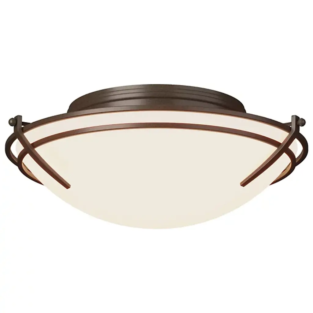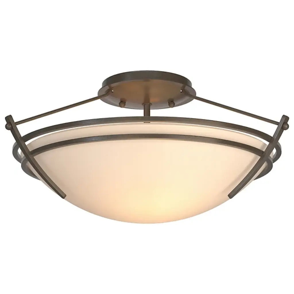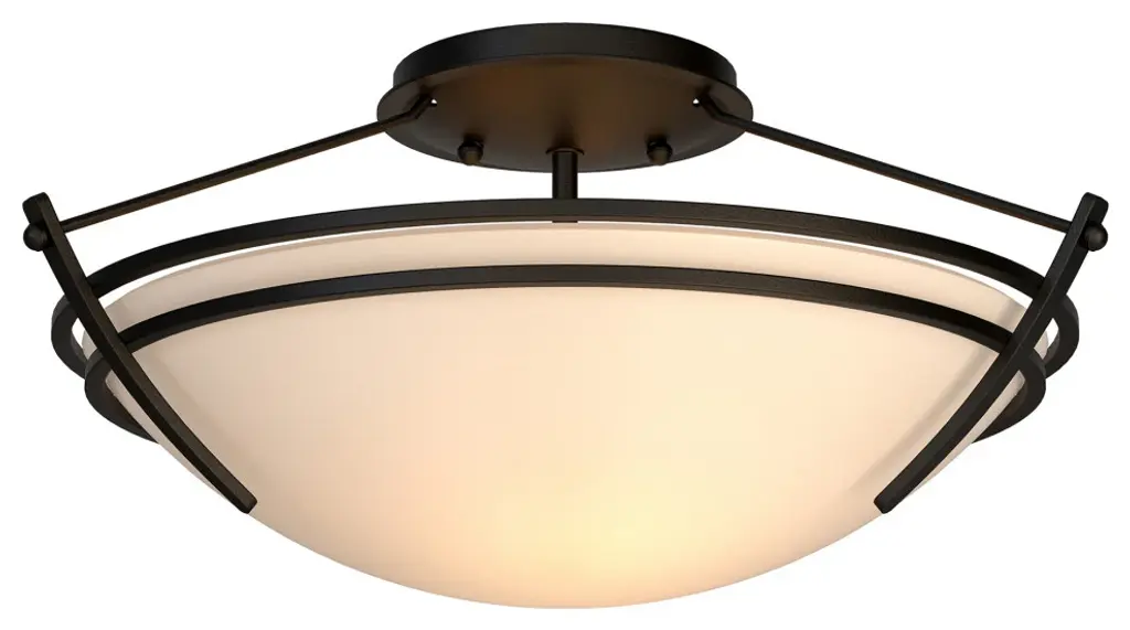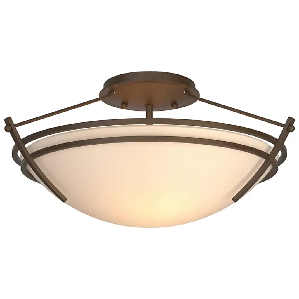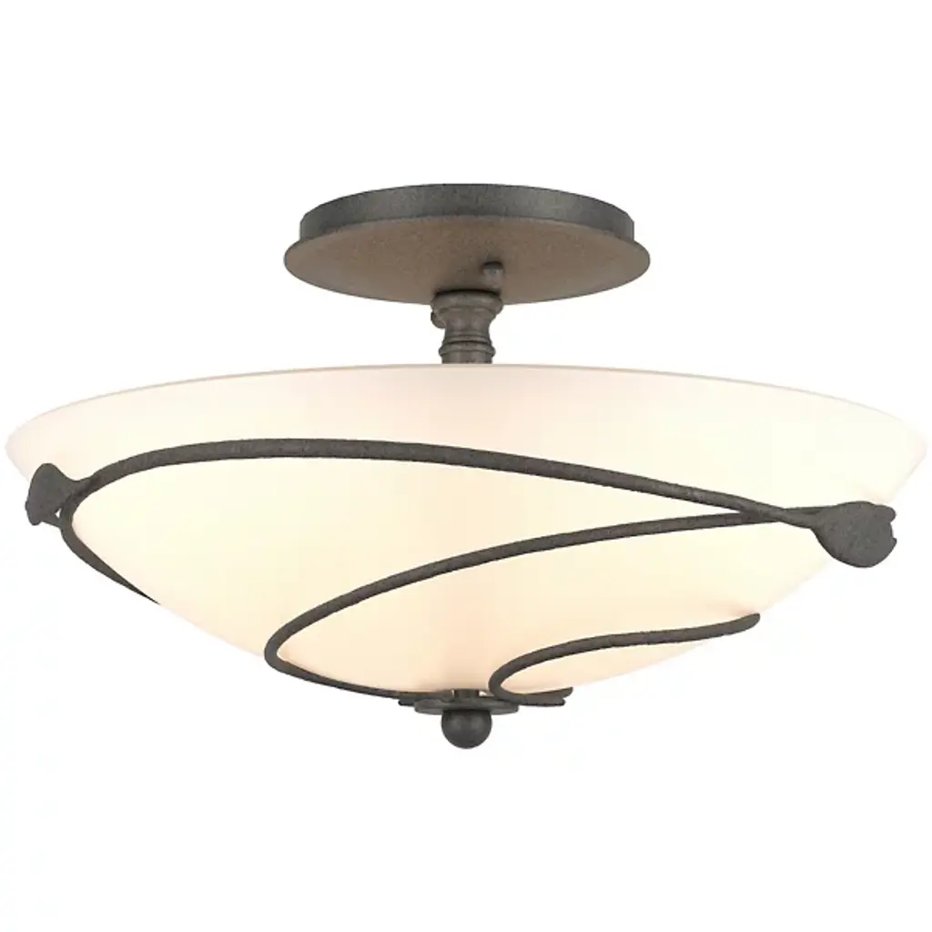 The Hubbardton Forge Presidio Tryne Semi-Flushmount creates warm, overall illumination while adding an element of handcrafted charm to interior spaces. The Presidio Tryne Bowl Semi-Flushmount features hand-blown glass shade and hand-forged wrought iron body.