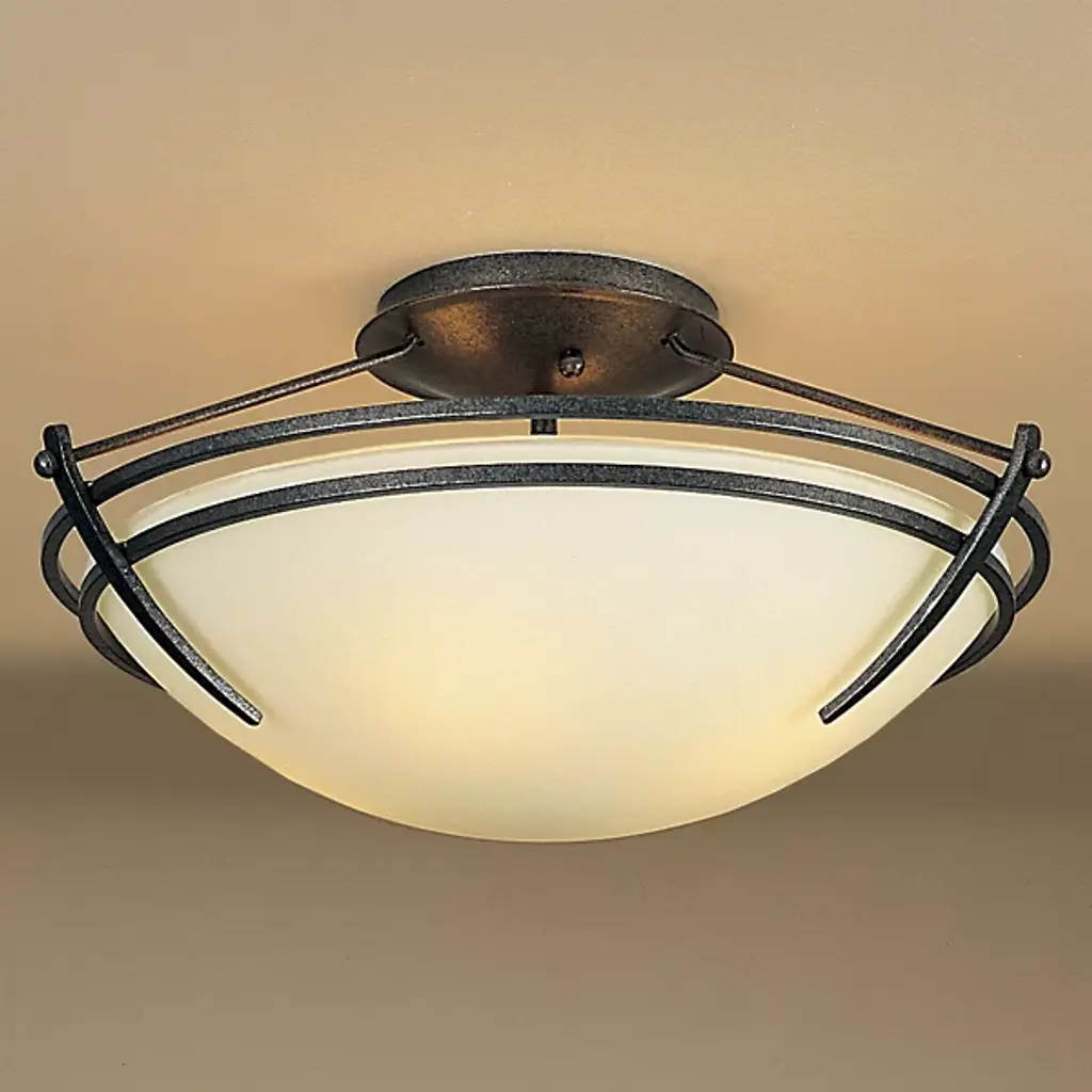 The Hubbardton Forge Presidio Tryne Semi-Flushmount creates warm, overall illumination while adding an element of handcrafted charm to interior spaces. The Presidio Tryne Bowl Semi-Flushmount features hand-blown glass shade and hand-forged wrought iron body.