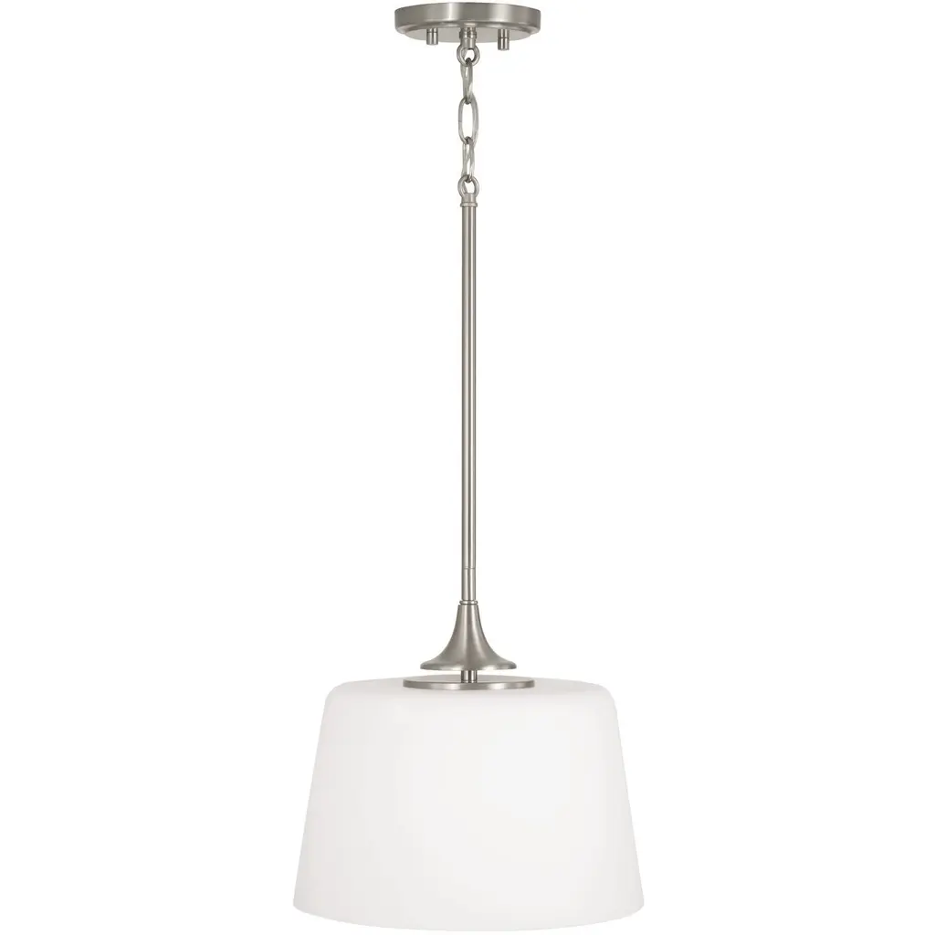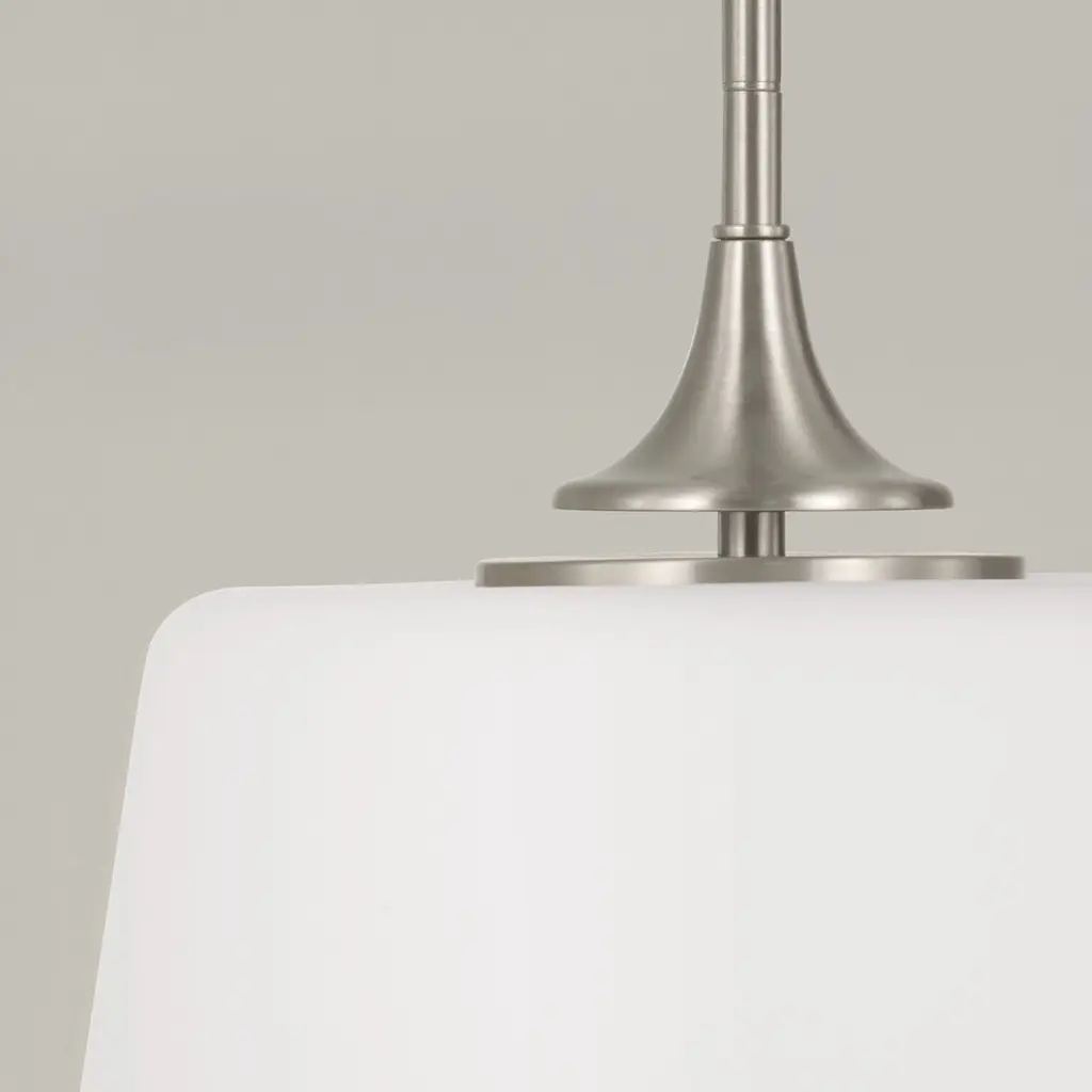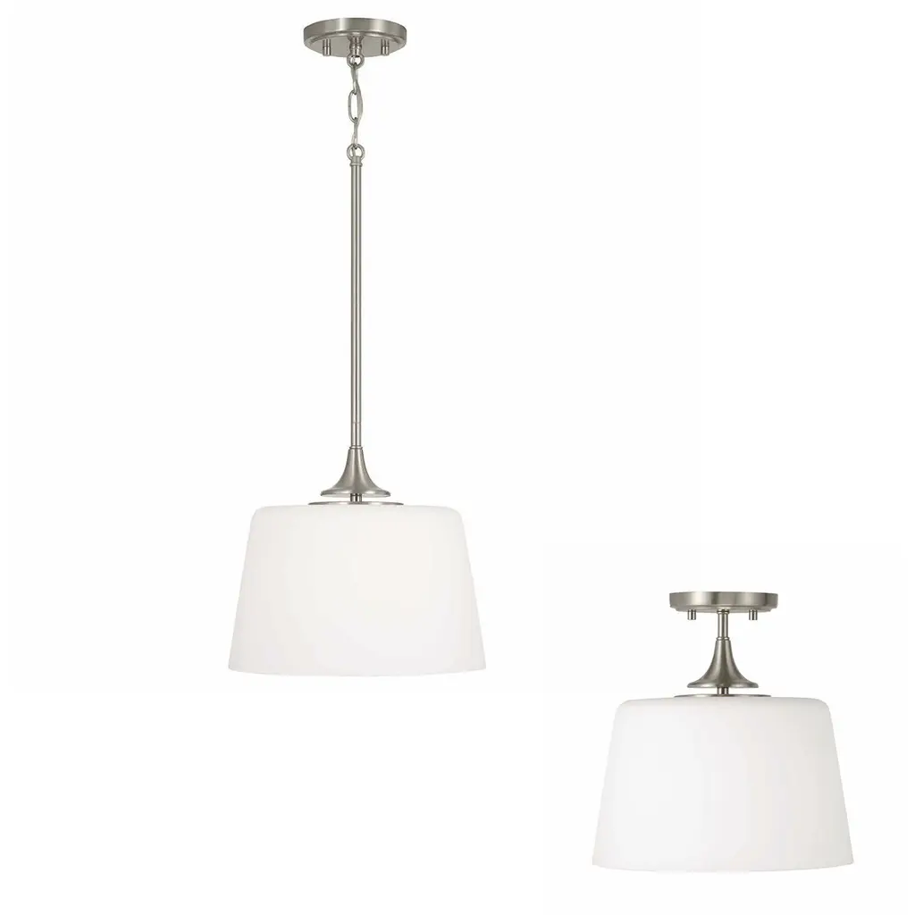 Sleek contours and flared accents create the Presley Dual Mount Semi-Flush Pendant for HomePlace. The soft white glass paired with Brushed Nickel finish brings a classic aesthetic that mixes with any style.