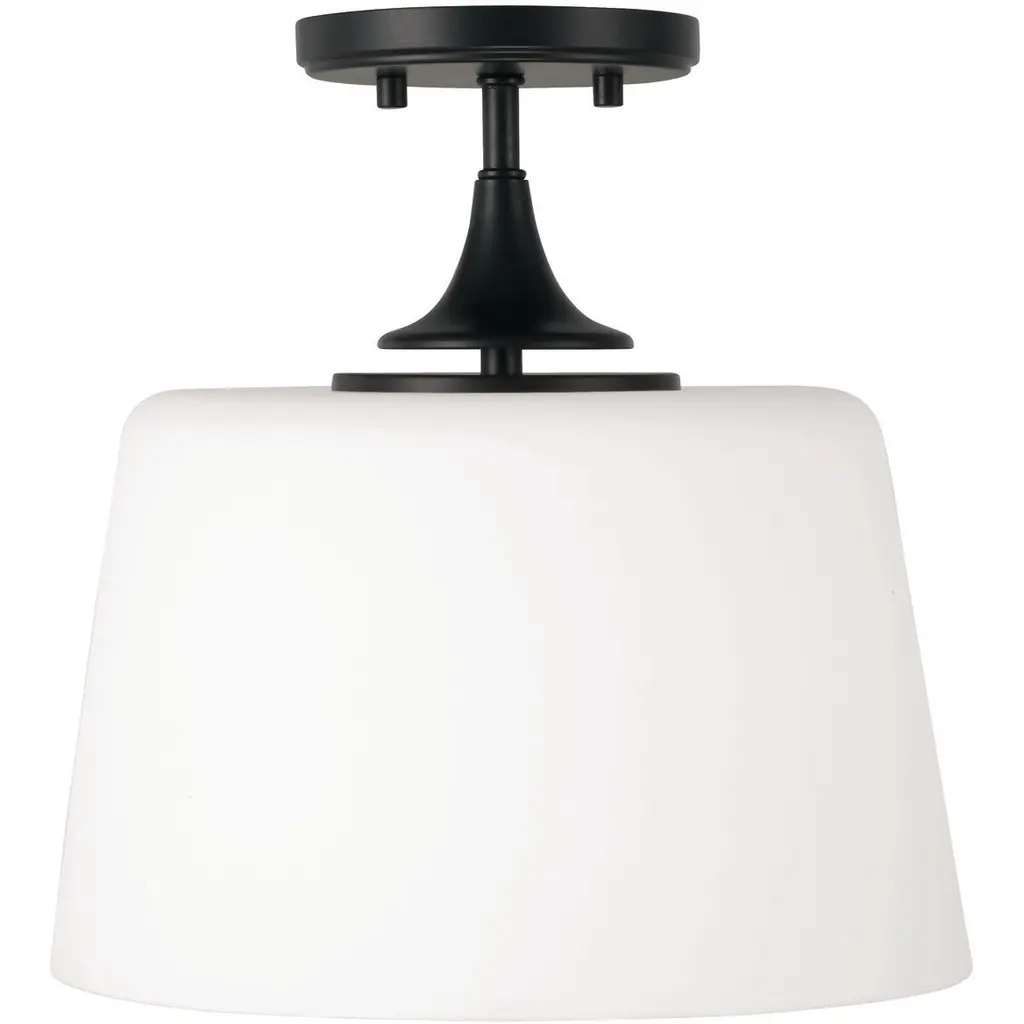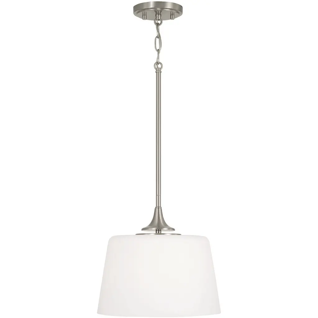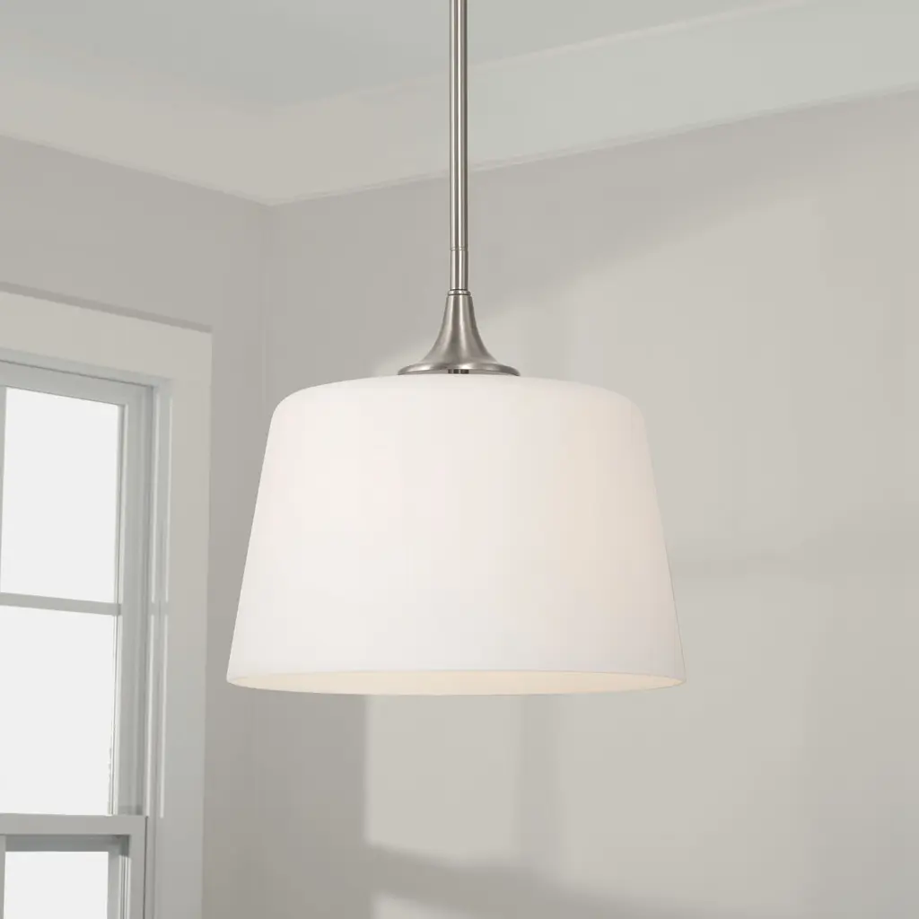 Sleek contours and flared accents create the Presley Dual Mount Semi-Flush Pendant for HomePlace. The soft white glass paired with Brushed Nickel finish brings a classic aesthetic that mixes with any style.