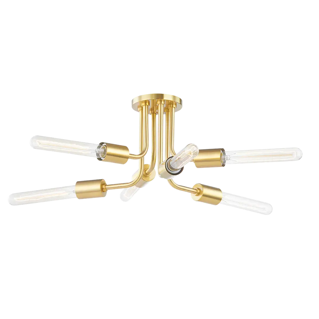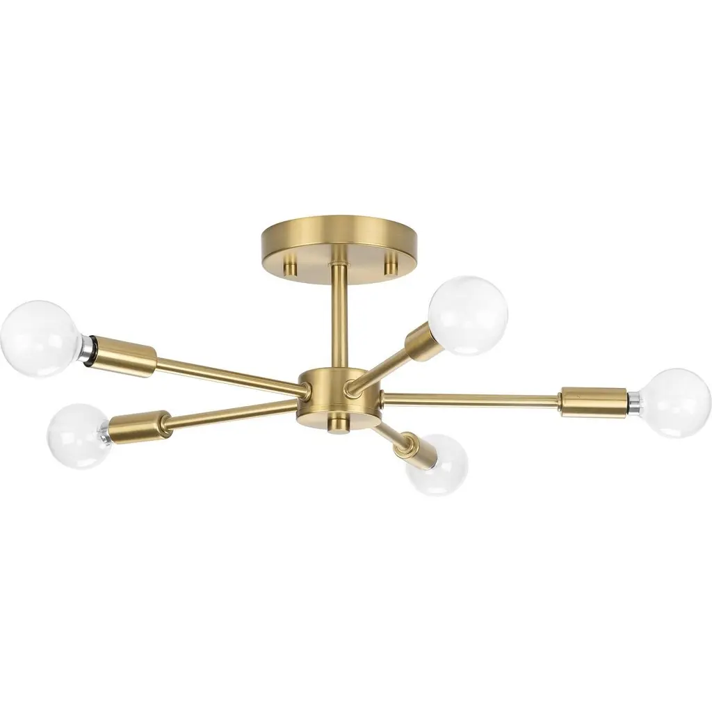 Introducing the Delayne Collection from Progress Lighting, a stunning semi-flush light fixture made of durable steel with a brushed bronze finish. This mid-century inspired fixture has a 16" width and 5.62" height, featuring a space-age design with arms extending from a rounded central support. The metallic finish reflects light, creating a dazzling effect on bedroom, bathroom, and living room ceilings. The fixture supports five linear spokes with exposed bulbs, accommodating 5 incandescent bulbs with a maximum wattage of 60 watts each. It is dry rated and suitable for bedrooms, living rooms, and bathrooms. The product includes installation instructions and mounting hardware, and is covered by a 1-Year Limited Warranty. Elevate your space with the contemporary and mid-century modern style of the Delayne Collection from Progress Lighting.
