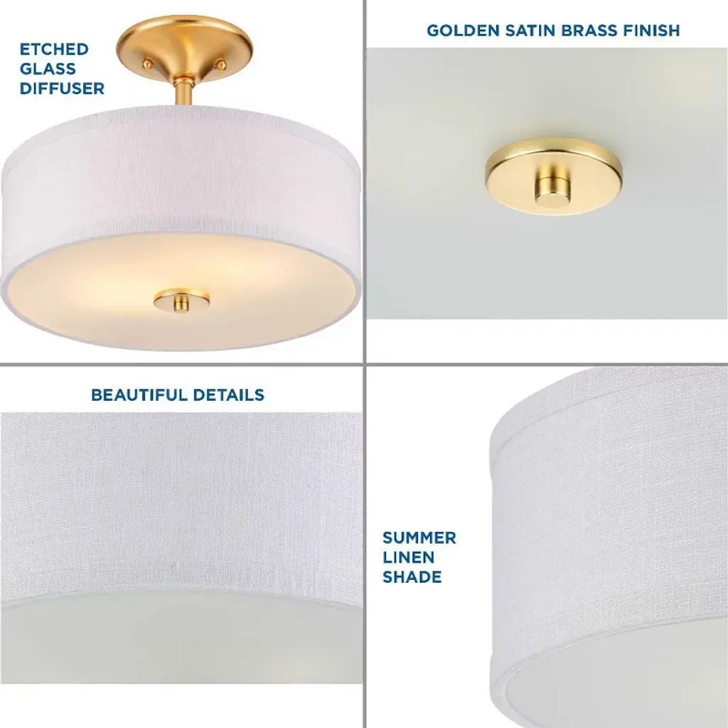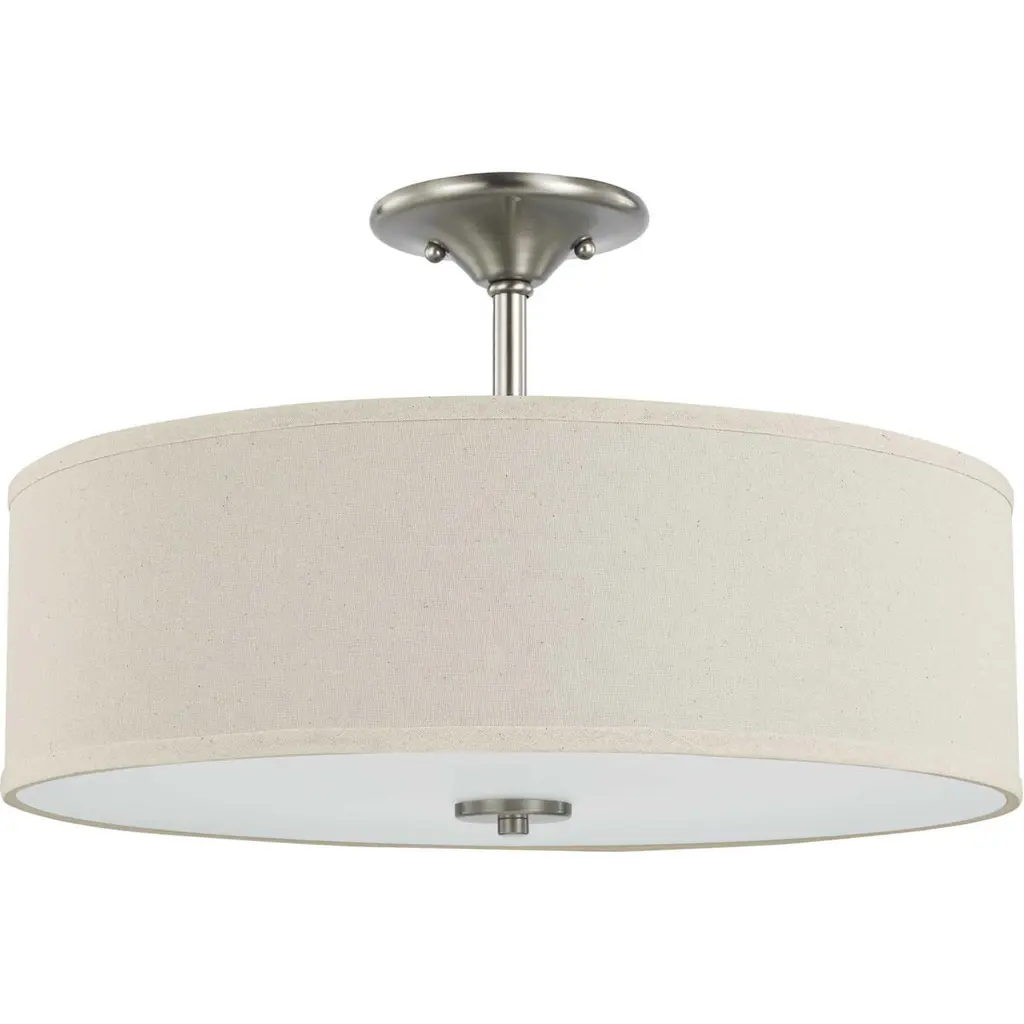 Introducing the Inspire Collection Semi-Flush Mount Light by Progress Lighting. Crafted from durable steel with a satin brass finish, this 13x10.13x13-inch fixture combines traditional elegance with modern simplicity. The flowing lines and etched glass diffuser, complemented by a Summer Linen shade, create a soft, inviting glow. Equipped for incandescent bulbs up to 75 watts each, it provides ample illumination. Rated for damp locations, it's versatile for any room, including bathrooms and covered outdoor areas. Elevate your home's ambiance with the Inspire Collection's blend of classic charm and contemporary flair.