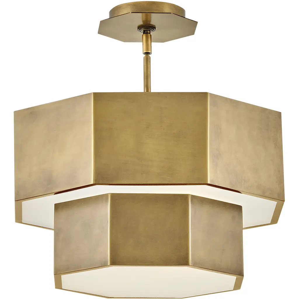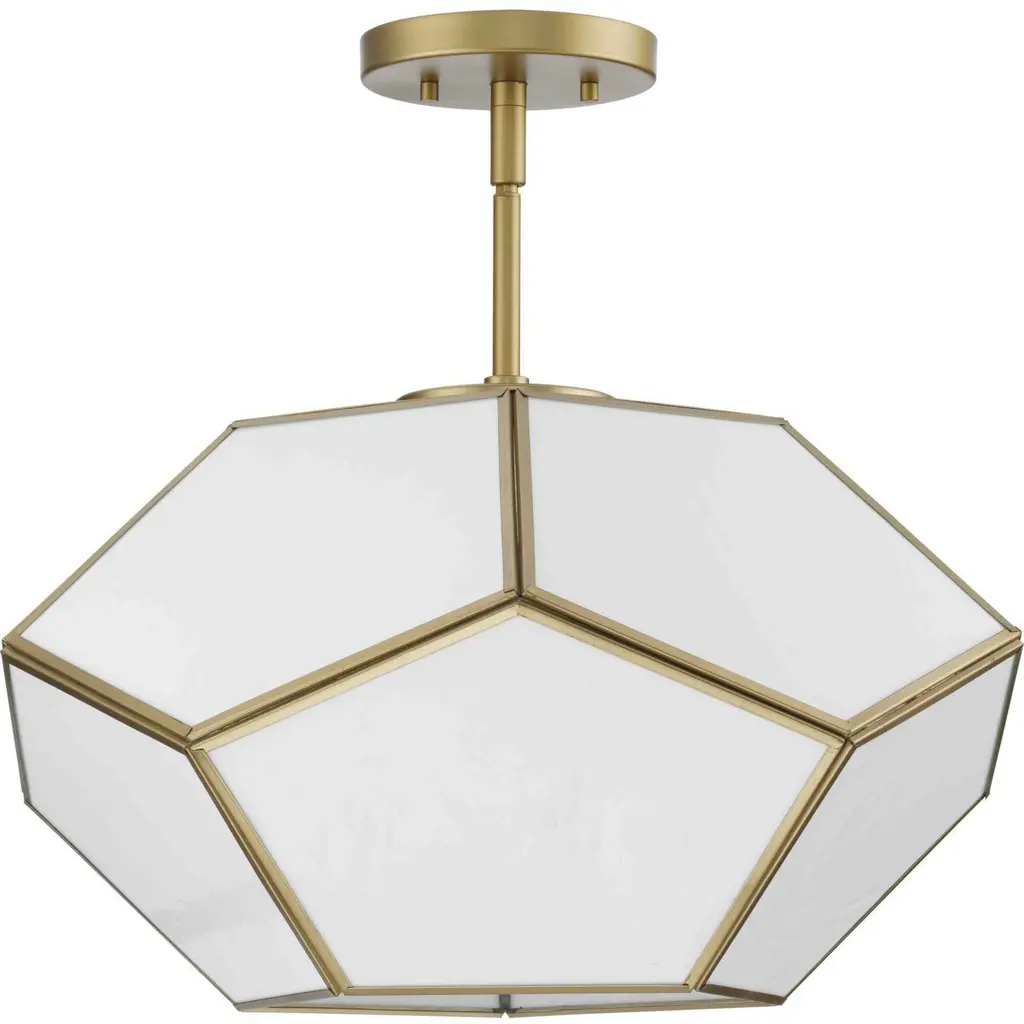 Progress Lighting Latham 3-light Semi-flush Mount, Vintage Gold, White Art Glass. Geometric Framework With Handmade Glass.