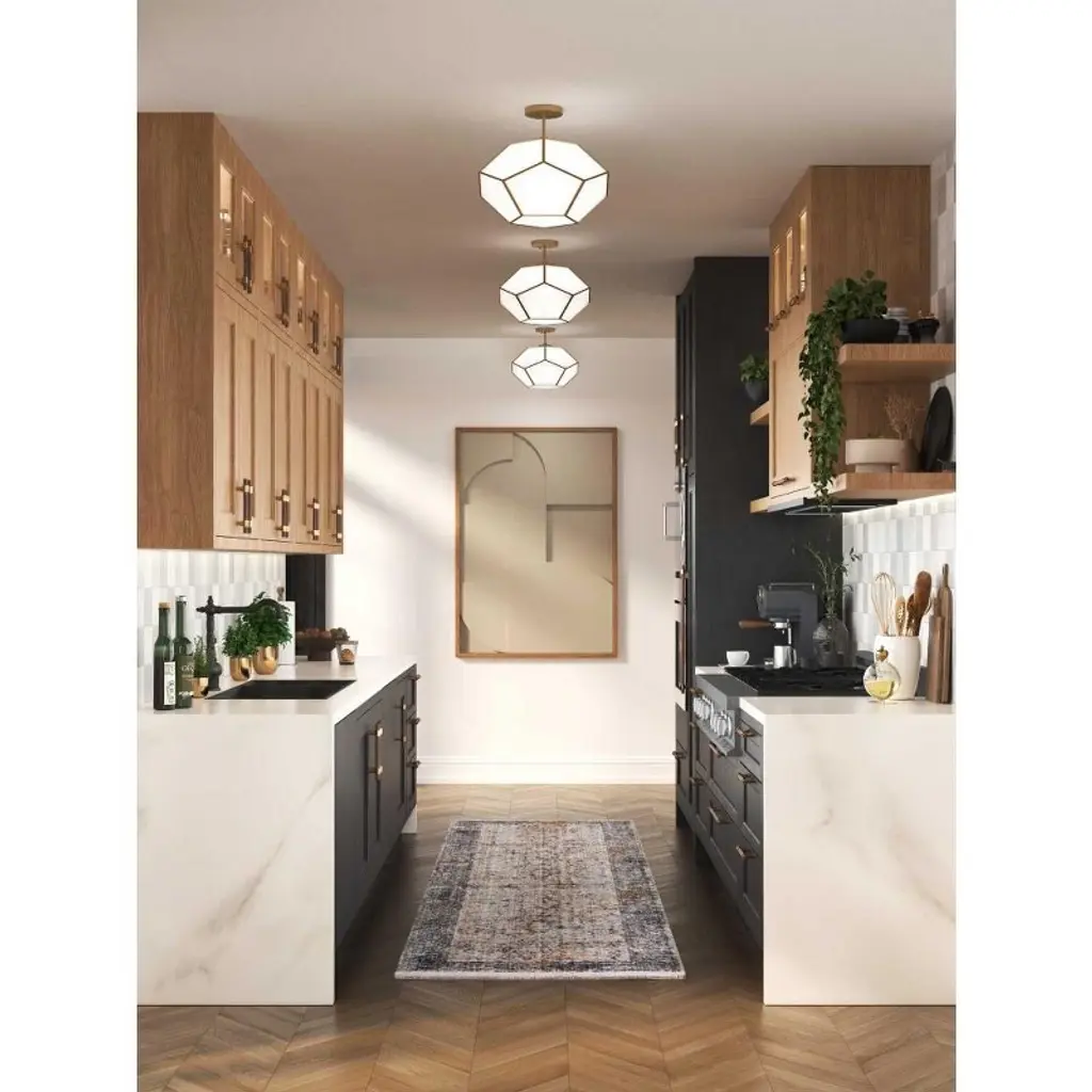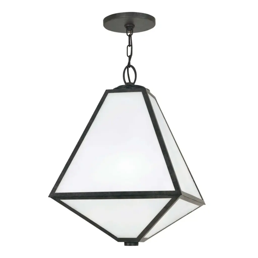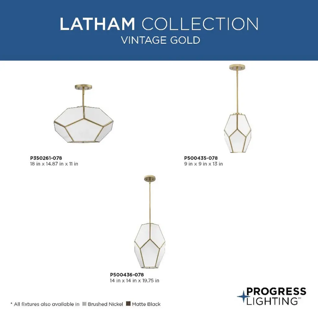 Introducing the Latham Collection by Progress Lighting, a modern and elegant lighting solution crafted from steel with a vintage gold finish. This versatile fixture can be mounted as a semi-flush mount or pendant, featuring a geometric framework finished in brushed nickel and handmade white art glass for a striking illumination effect. Measuring 14.87" in width, 11" in height, and 18" in length, it uses 3 incandescent bulbs with a maximum wattage of 60 watts each and has a damp rating for use in moisture-prone areas. Ideal for Timeless Modern and Contemporary settings, it comes with a 1-year limited warranty, installation instructions, and mounting hardware for easy setup. Elevate your space with the Latham Collection for a perfect blend of modern design and functional illumination.