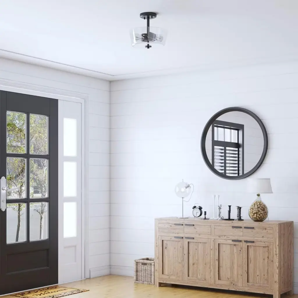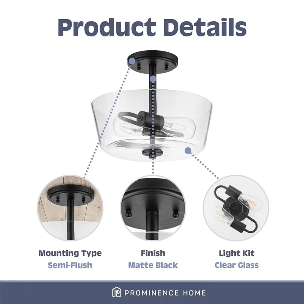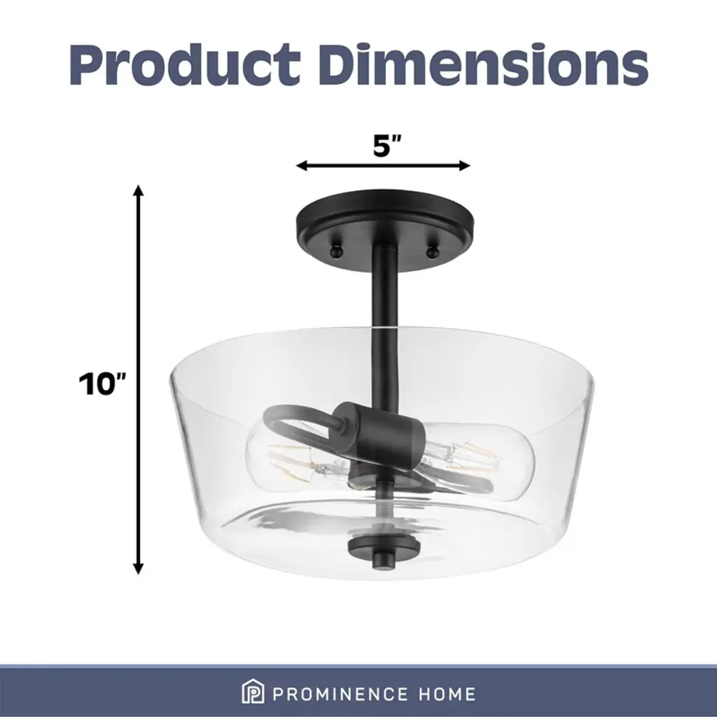 Bring warmth and refined character to your space with the Prominence Home Viktoria Semi-Flush Mount Light. Designed to suit a variety of indoor settings, this modern fixture features a streamlined profile with a clean-lined structure that offers both function and timeless style. Whether placed in a hallway, kitchen, or living area, it delivers focused and flattering light. The Viktoria ceiling light features a rounded, clear glass shade that adds dimension and brightness, enhancing the beauty of any room. The sleek finish and open-style shade allow the light to shine clearly and evenly, complementing a wide range of decor—from transitional to farmhouse to contemporary interiors. Ideal for areas where a low-hanging fixture might not be practical, this semi-flush mount design offers the visual appeal of a pendant without sacrificing headroom. It supports 2 medium base E26 bulbs, up to 60 watts each, allowing for ample illumination and bulb flexibility. Installation is simple with included instructions and a troubleshooting manual, helping you update your room with ease. Crafted for indoor use, this Prominence Home 2-Light Ceiling Fixture elevates your space with modern elegance, giving your room a fresh, polished look while providing practical lighting exactly where it’s needed.