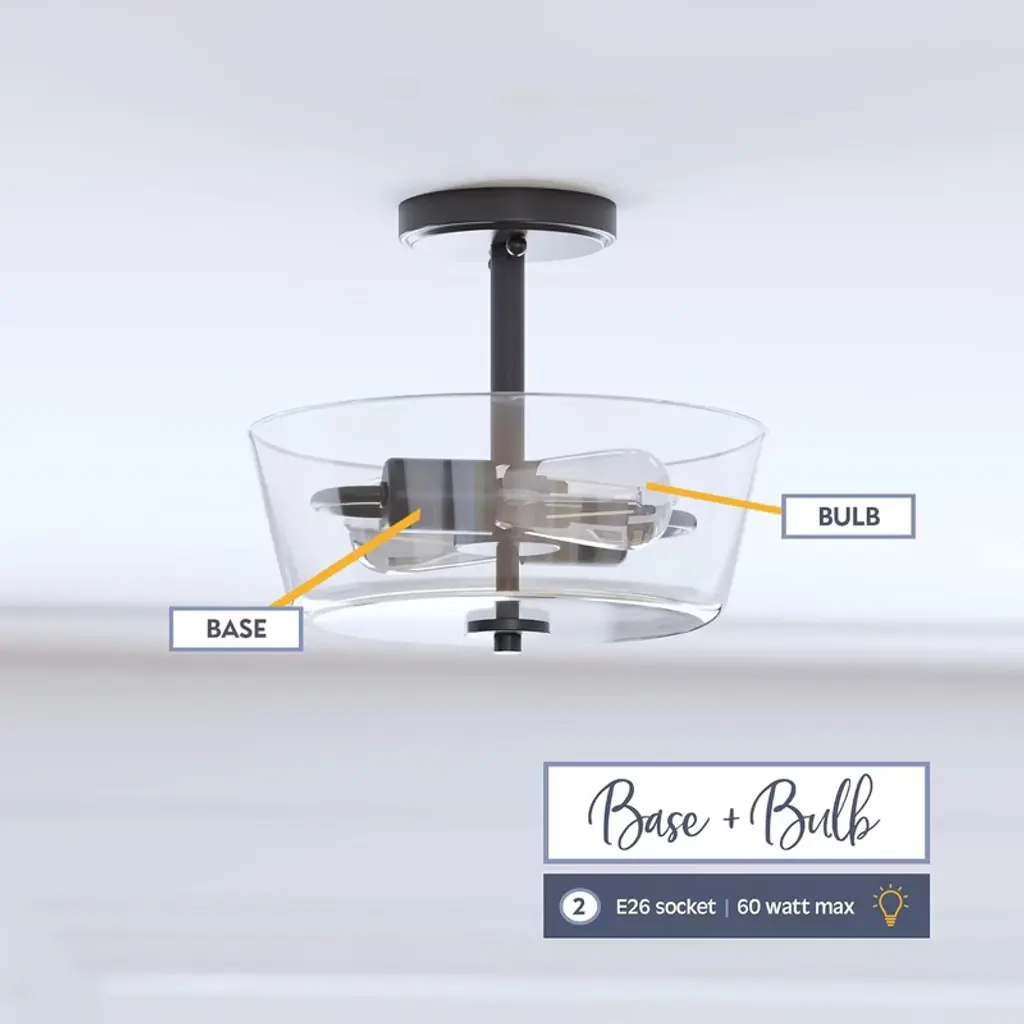 Prominence Home 13 Inch Semi Flush Mount 2 Light Ceiling Fixture With Clear Glass Shade, Modern Indoor Lighting, Viktoria, Black