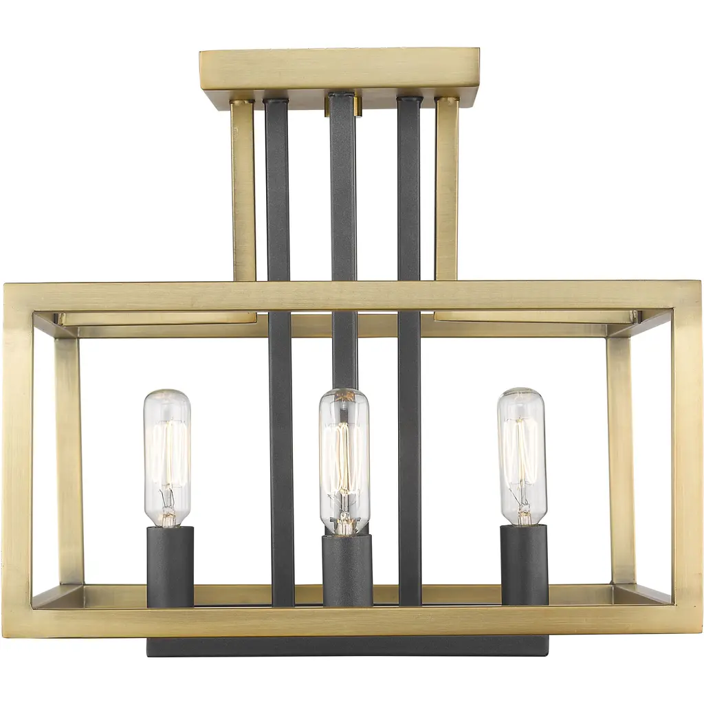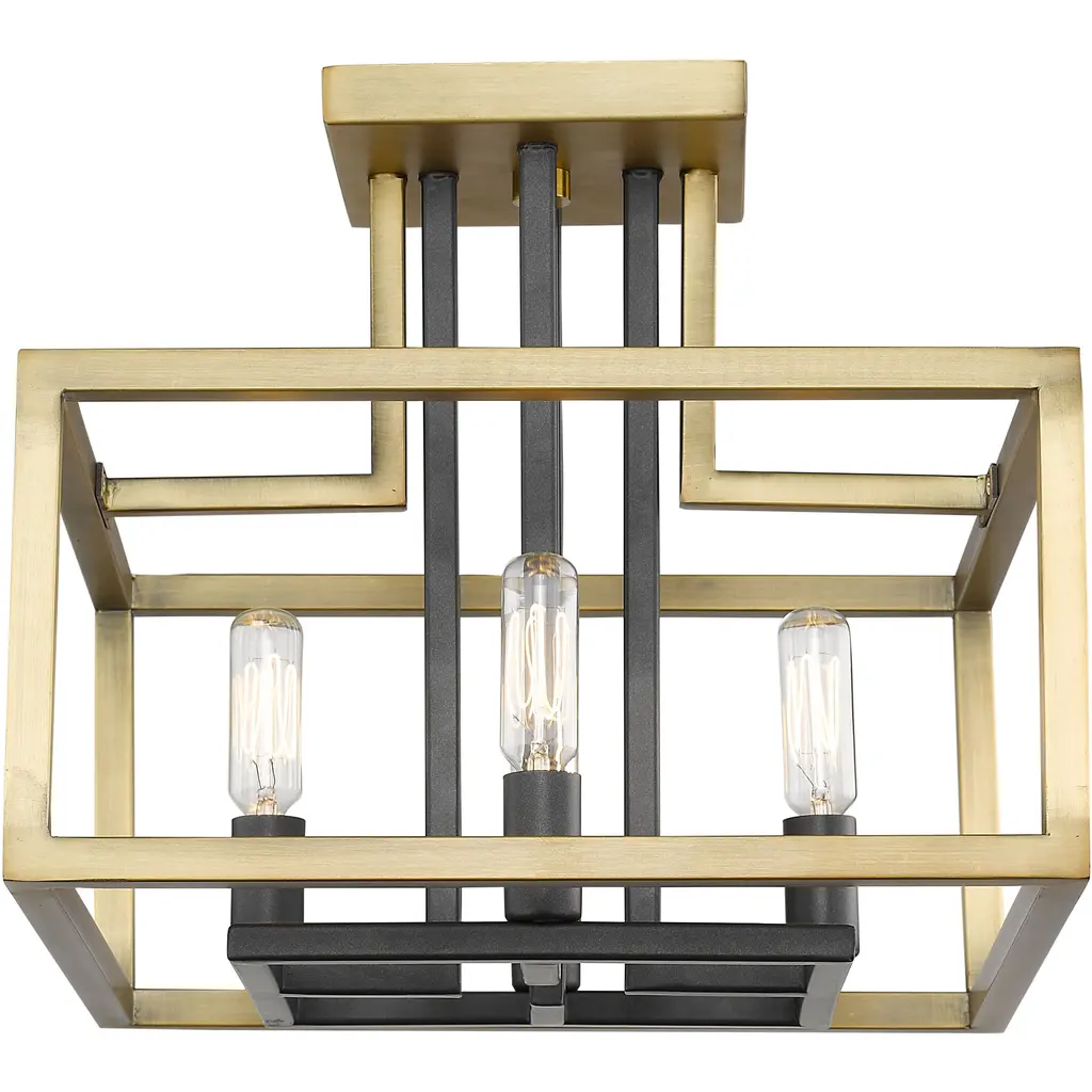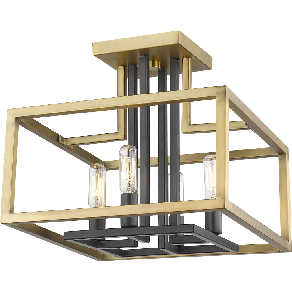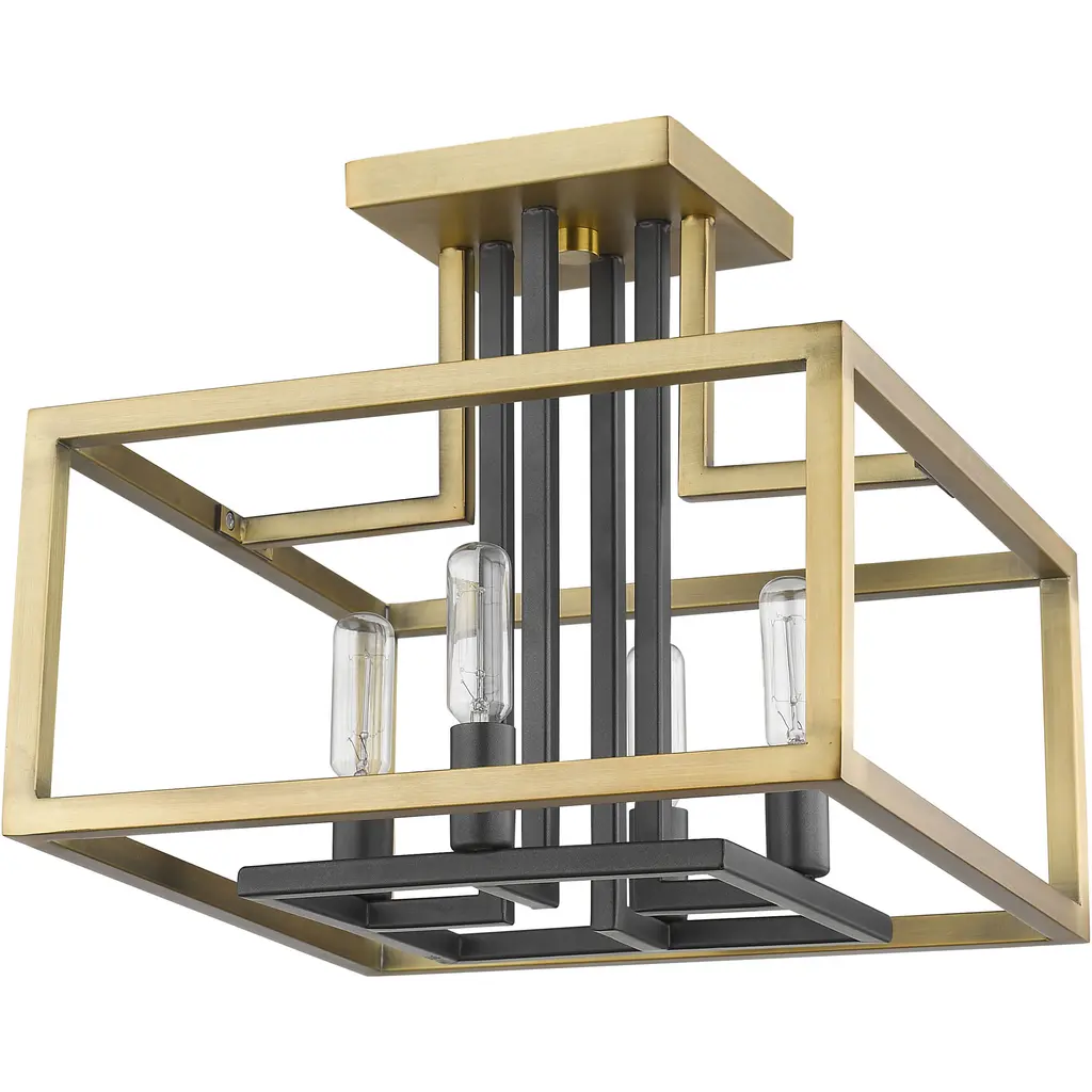Modern geometric styling receives a softening effect from a warm olde brass finish, making this steel four-light semi-flush-mount ceiling light an exceptional choice. Fold metropolitan appeal into a design scheme that works with high and low ceilings, and enjoy the eye-catching blend of brass and bronze.