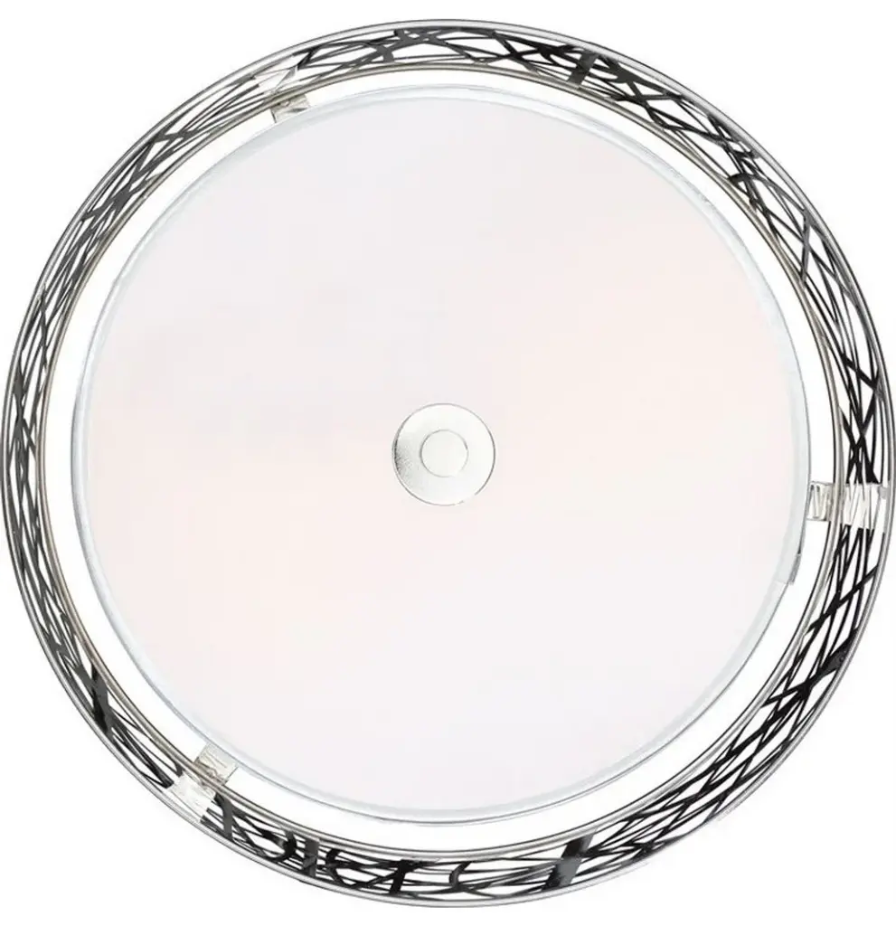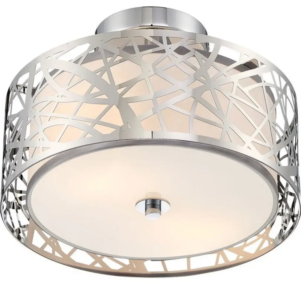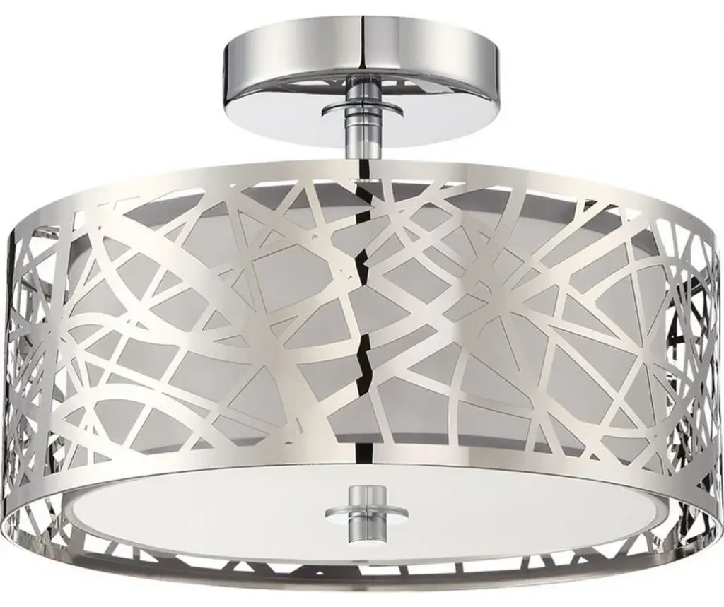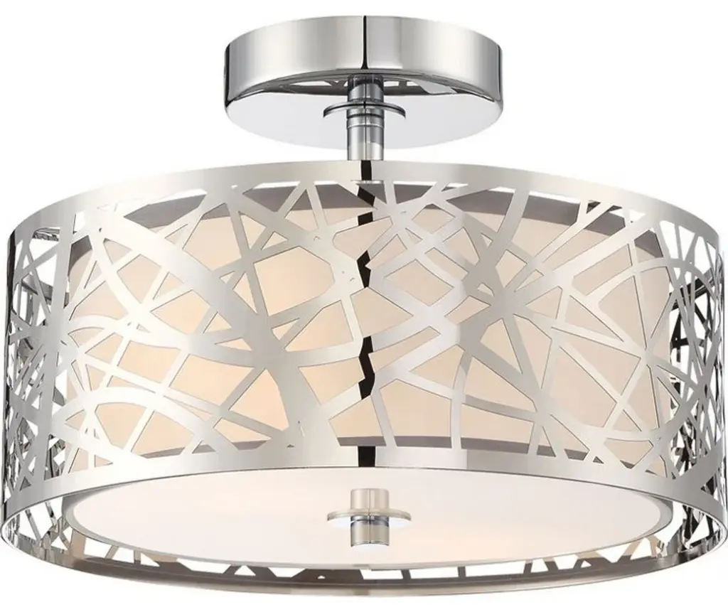 Two Light Semi-Flush Mount from Platinum Collection Abode collection in Polished Chrome finish. Number of Bulbs 2. Max Wattage 75.00 . No bulbs included. Contemporary, diverse and sharp are what makes the Platinum Collection`s Abode series a hit. The dual shades are combined to create a cohesive look with clear organza trimmed in grey under a laser cut metal shade with an intriguing, unique design. The sleek polished chrome finish completes the look. No UL Availability at this time.