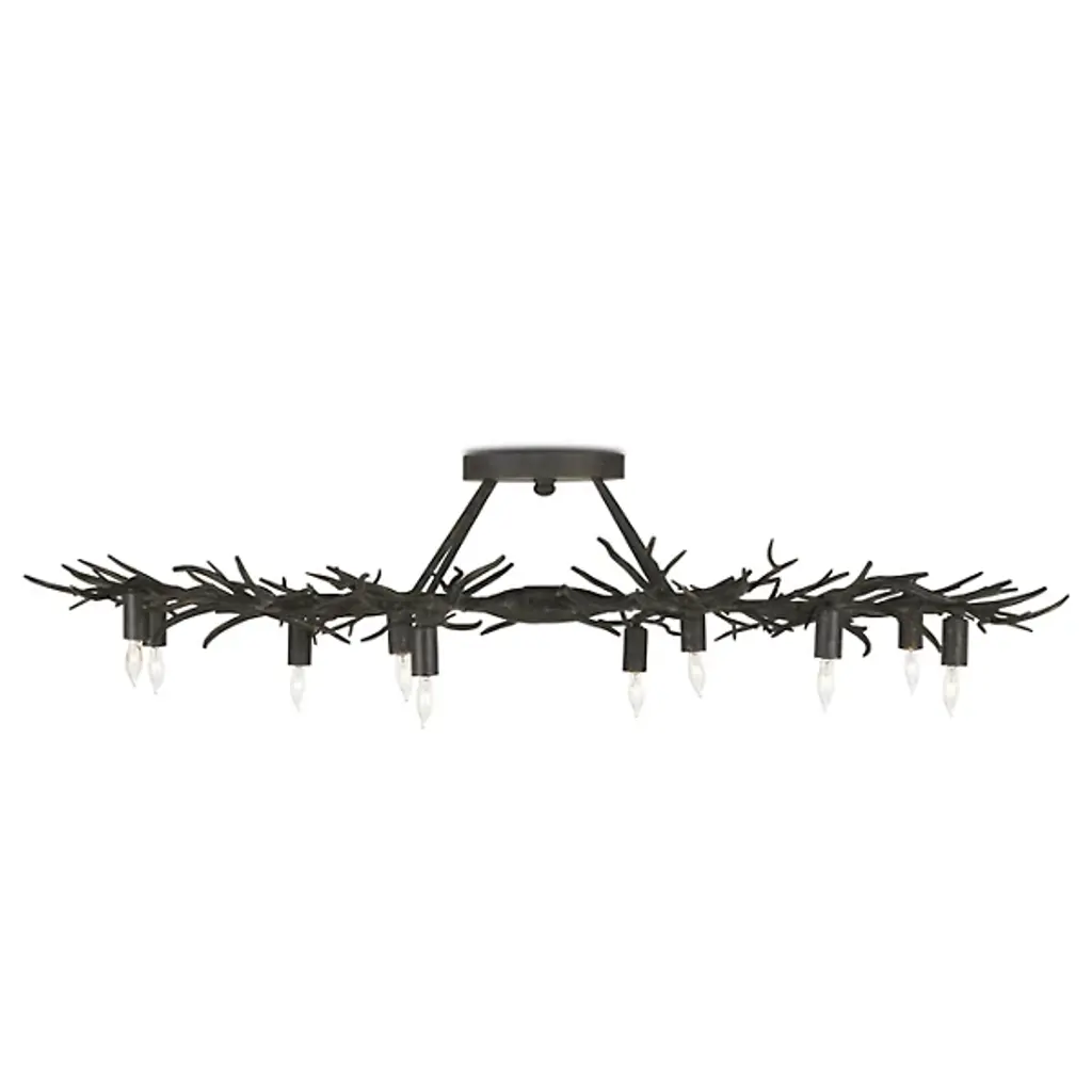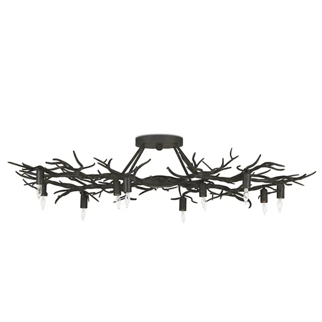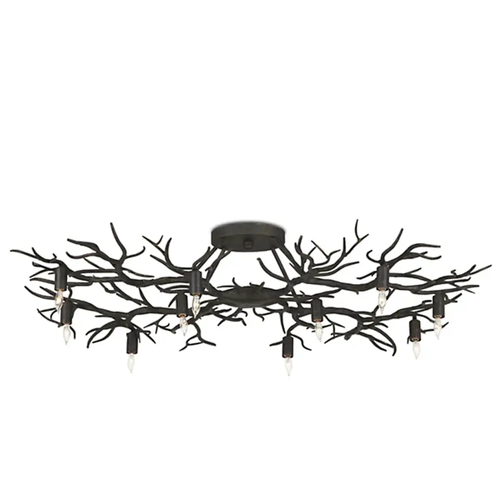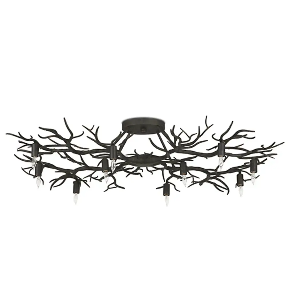 The Rainforest Semi-Flushmount by Currey & Company blends the vibrant beauty of nature with interior spaces. The fixture's tree-like structure features downward-facing open lamping, creating a captivating play of light and shadow reminiscent of dappled sunlight through branches. The limbs harmoniously integrate with the skillfully placed bulbs. The canopy and attaching structural rods maintain an unobtrusive presence, making it an excellent choice for hospitality projects. This fixture adds impressionistic charm, celebrating the natural world.