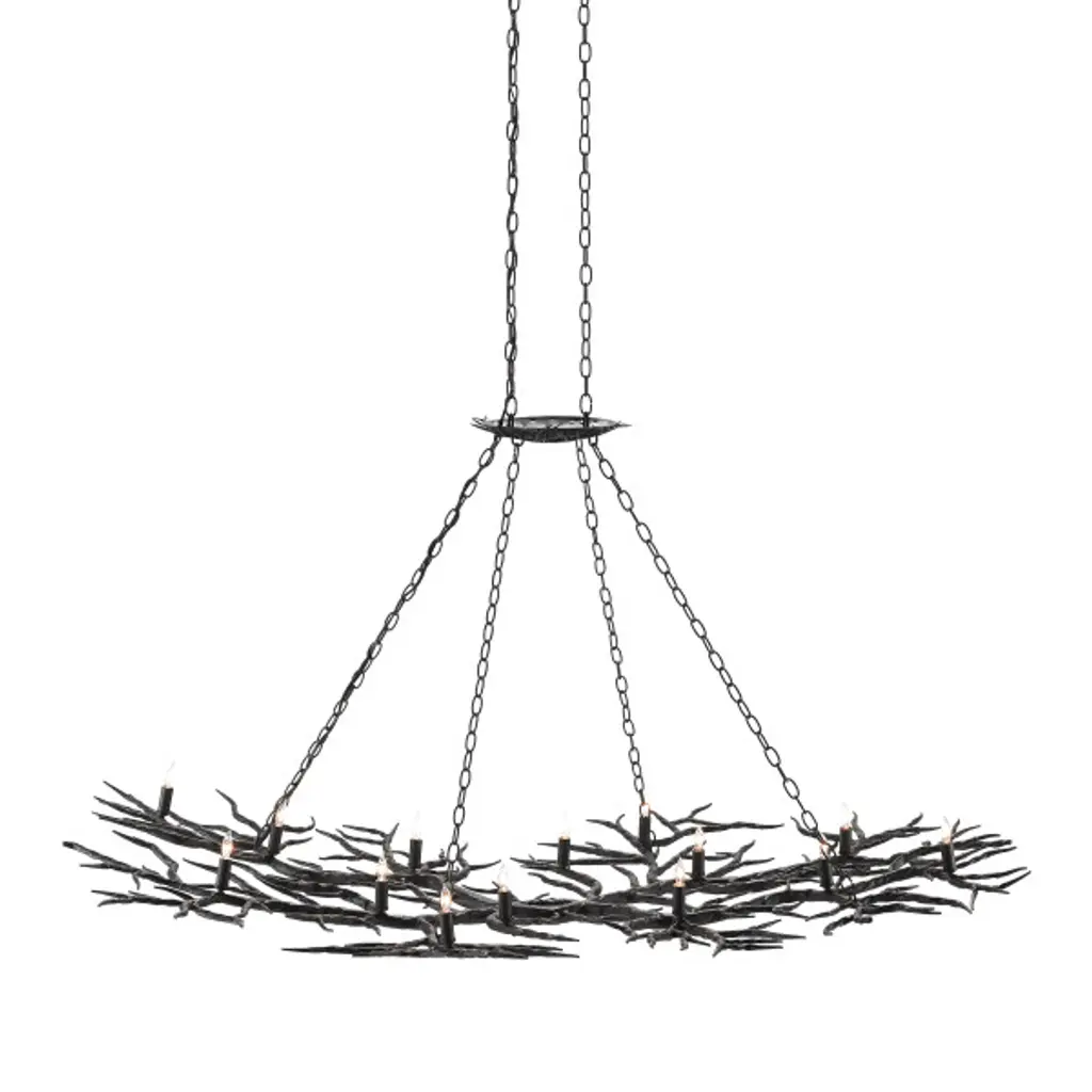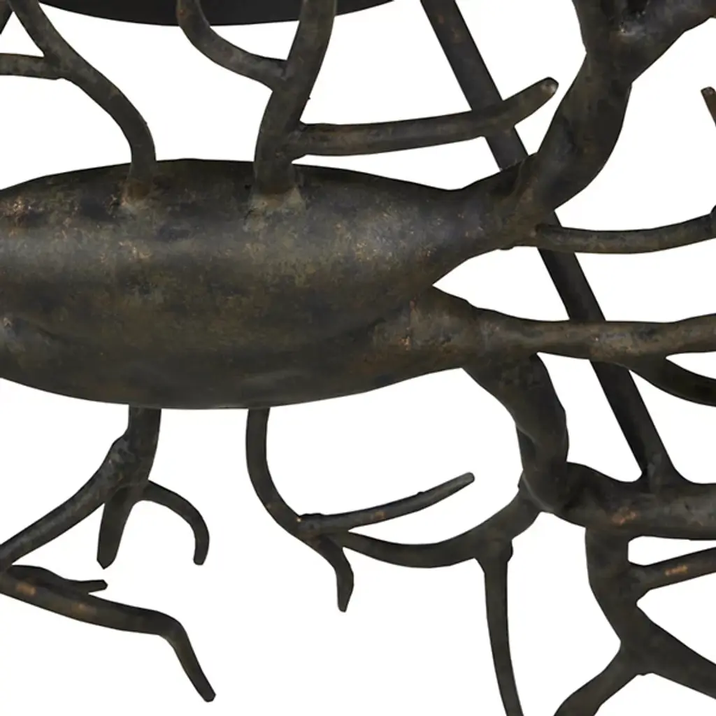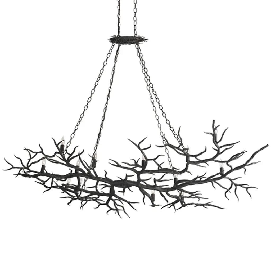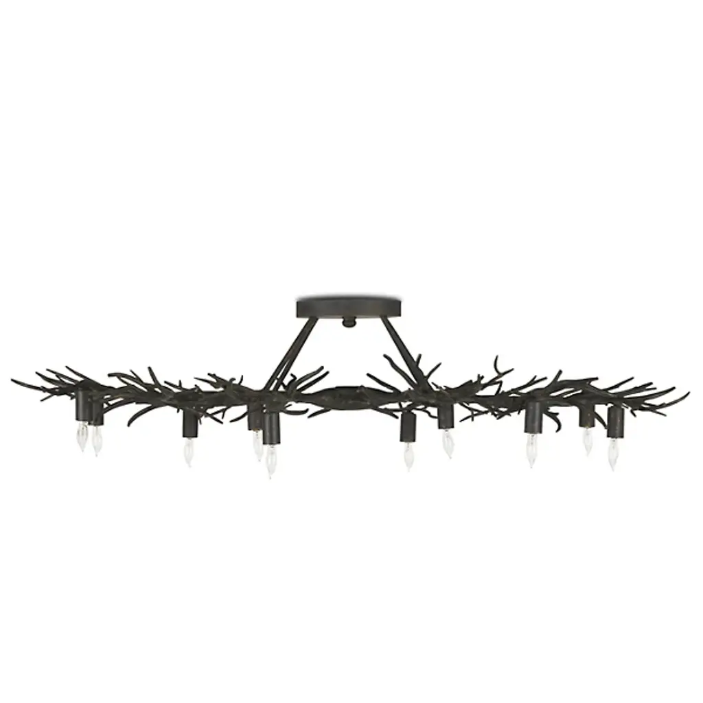 The Rainforest Semi-Flushmount by Currey & Company blends the vibrant beauty of nature with interior spaces. The fixture's tree-like structure features downward-facing open lamping, creating a captivating play of light and shadow reminiscent of dappled sunlight through branches. The limbs harmoniously integrate with the skillfully placed bulbs. The canopy and attaching structural rods maintain an unobtrusive presence, making it an excellent choice for hospitality projects. This fixture adds impressionistic charm, celebrating the natural world.