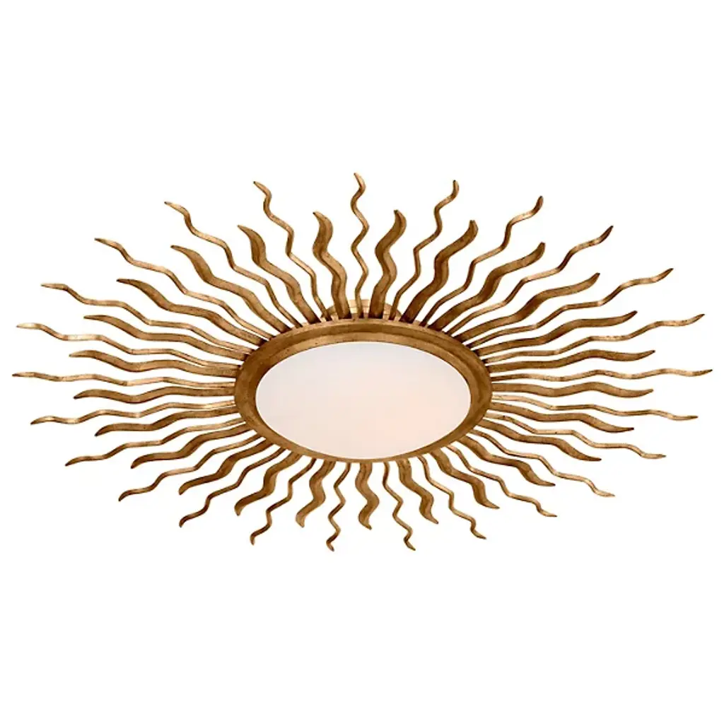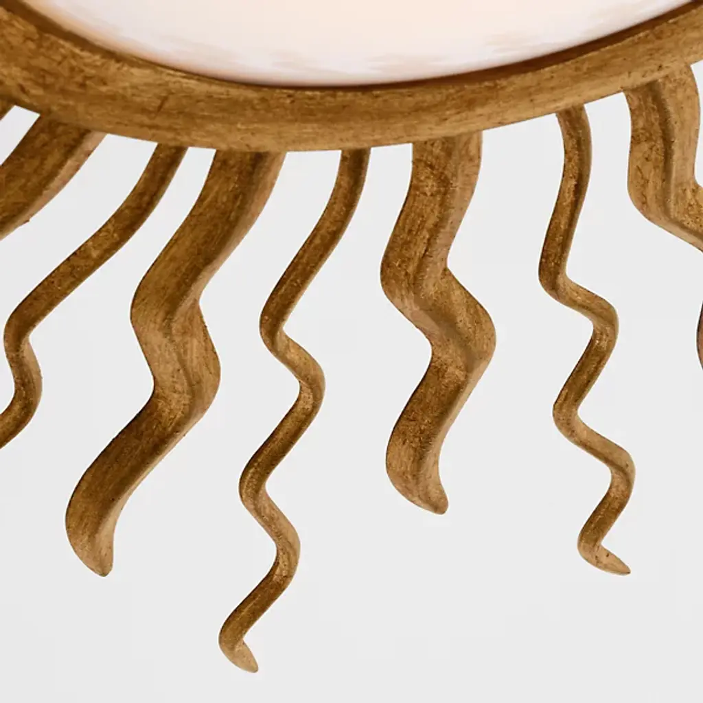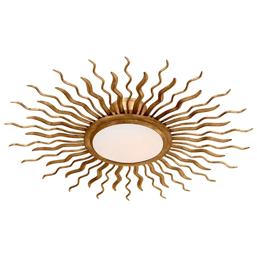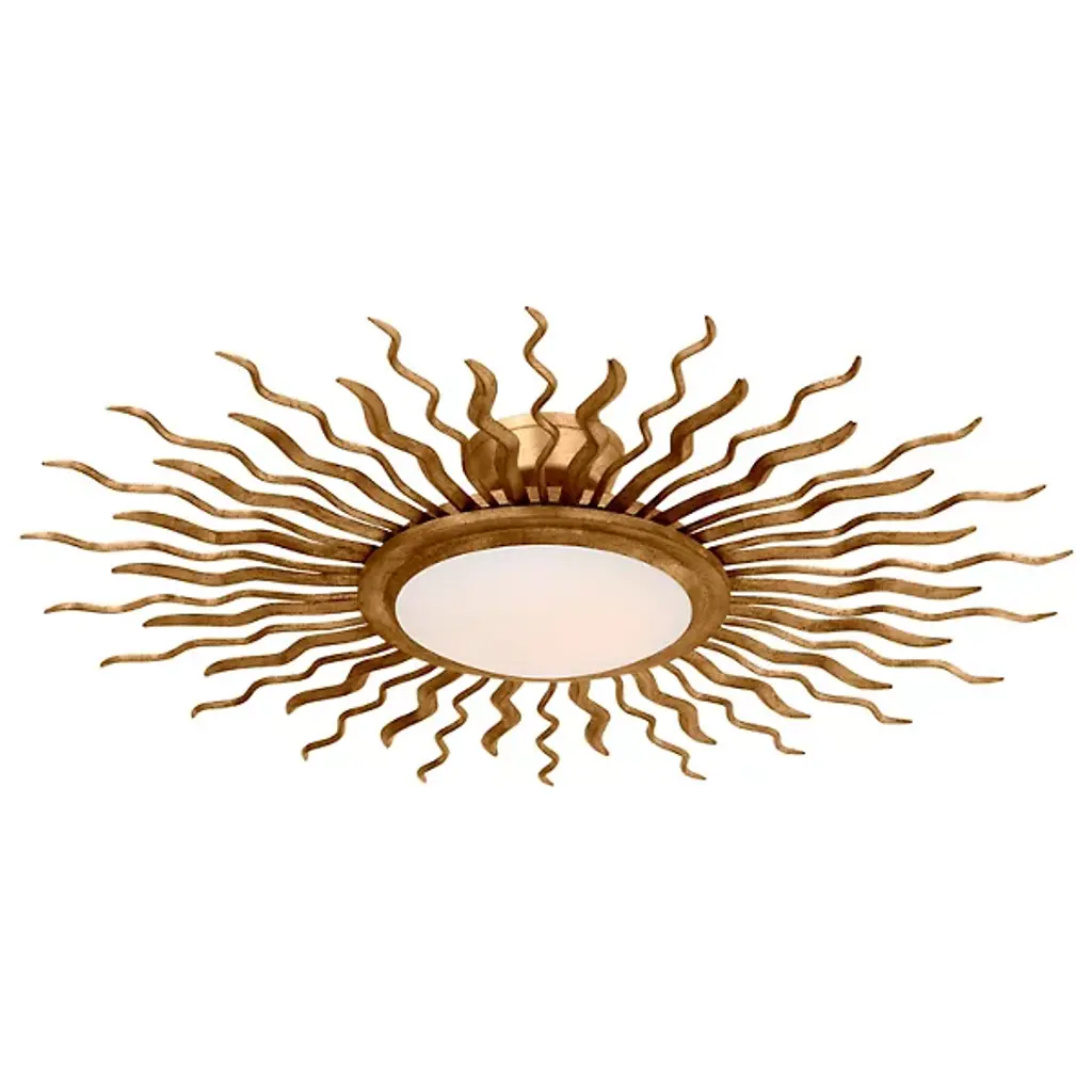 The Re LED Semi-Flushmount from Visual Comfort Signature radiates energy through its sculptural sunburst design. Undulating steel rays extend outward from the central glass diffuser, creating dynamic patterns on surrounding surfaces. Designer Suzanne Kasler employs LED technology to provide efficient radiance while maintaining the fixture's artistic impact. Each ray of this semi-flushmount is carefully shaped, allowing it to become the center of attention in any room or hallway.