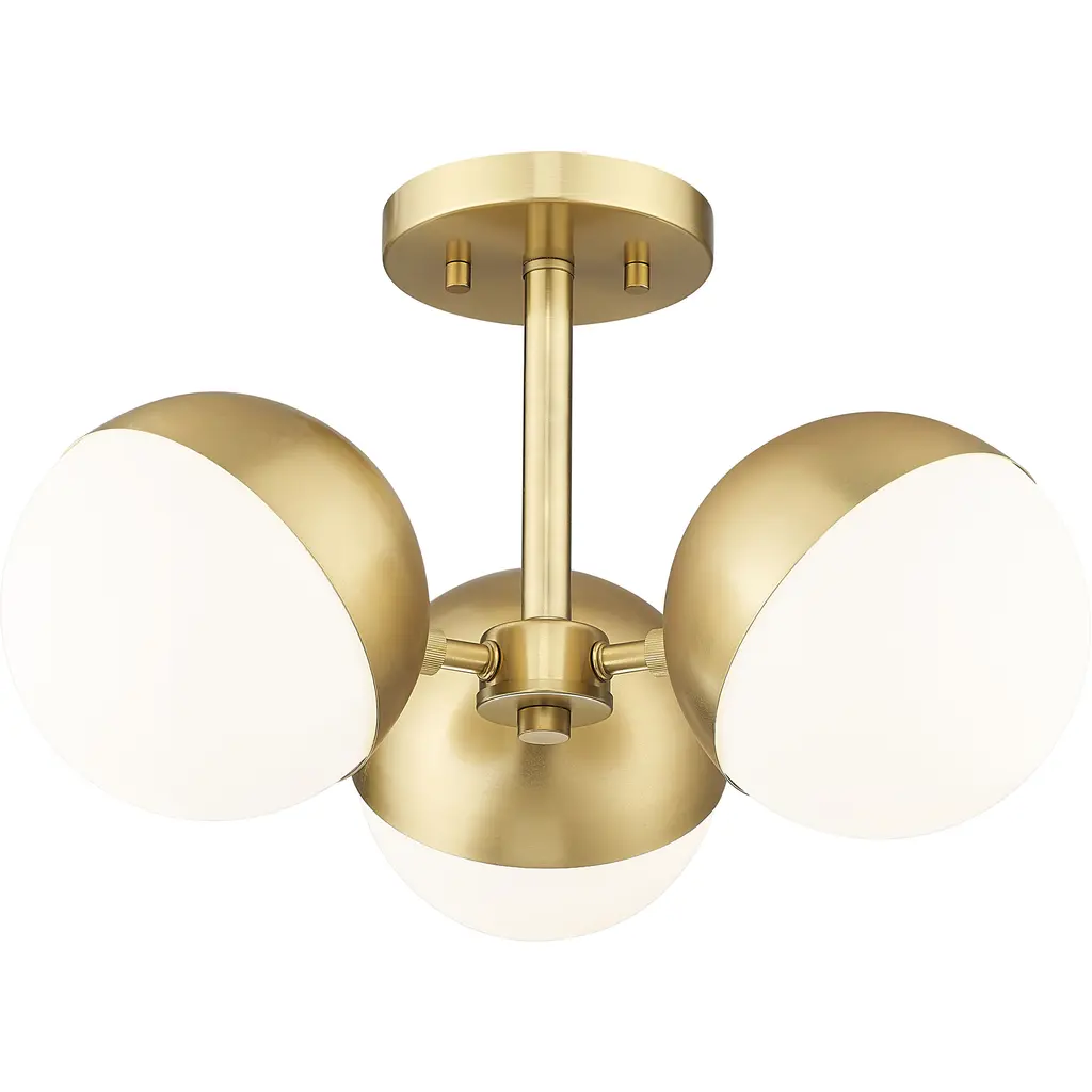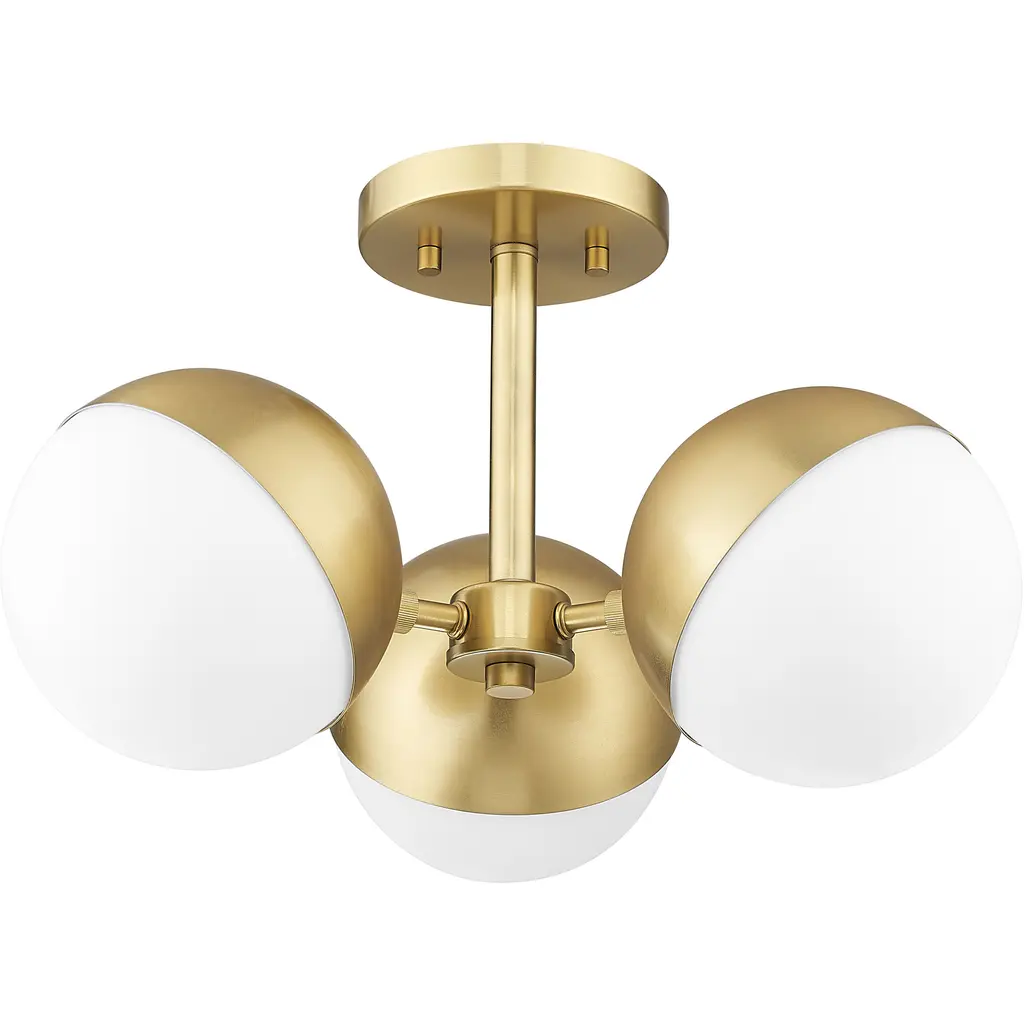 A modern gold finish reinforces the vintage design inspirations of this three-light semi-flushmount ceiling light. Casting multidirectional illumination, it pairs opal glass orbs with moveable metal shields to create a custom look and feel in your bedroom or home office.