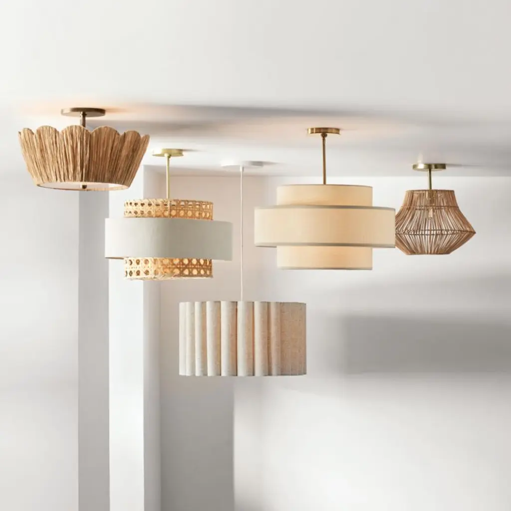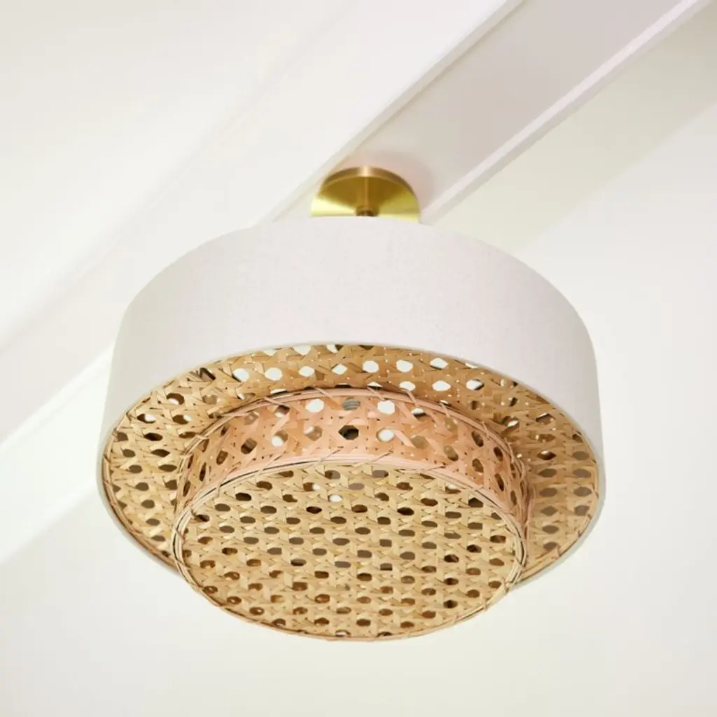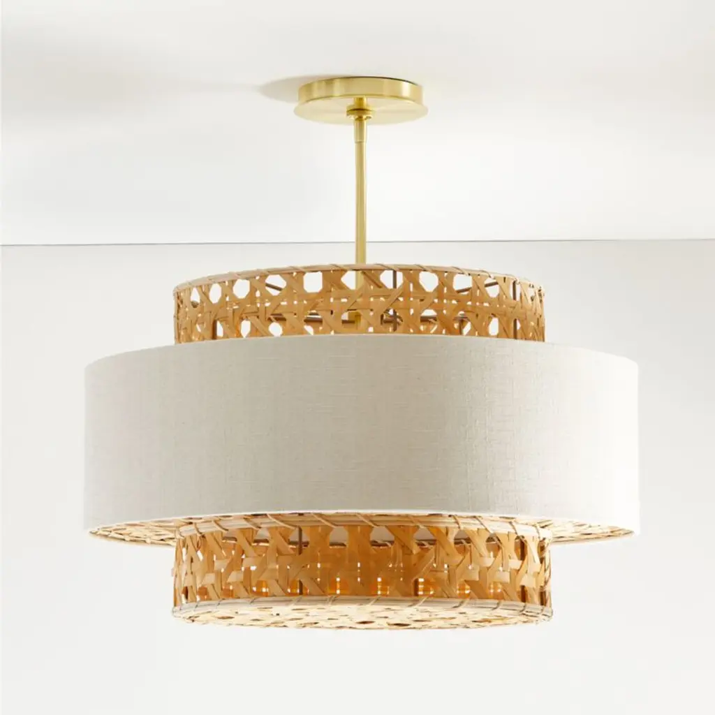 With an eye-catching natural rattan frame and neutral linen shade, plus a glimmering brass rod and base, our Reese Pendant Light is a trend-forward statement piece. Chic enough for your nursery, shared family spaces or cool big kid rooms, this mixed material fixture has a woven drum shape encircled by a unique rounded shade. Its low-profile design works especially well in bedrooms with bunk beds or loft beds. The intricate, lattice-like weave brings in the warmth, texture and beauty of natural materials, while the calming, soft natural linen fabric and shimmery brass accents contrast gorgeously.