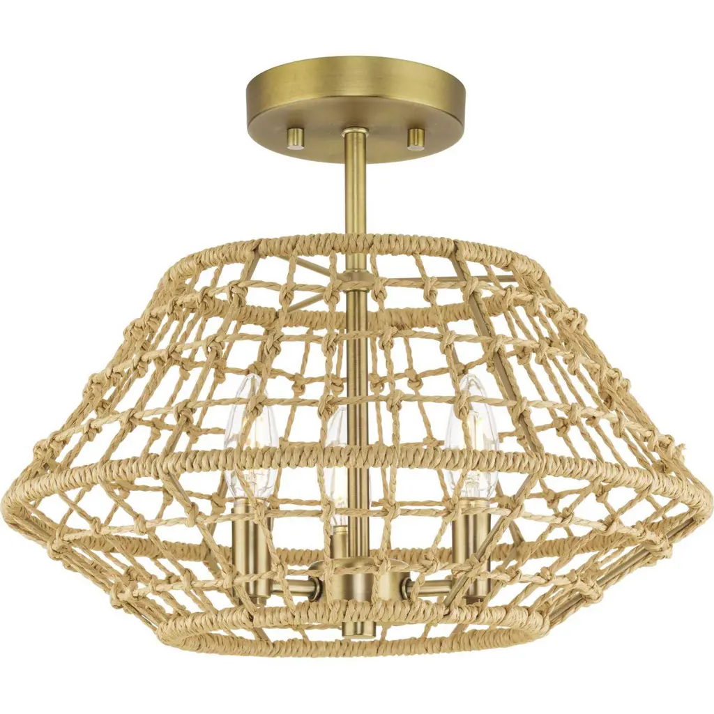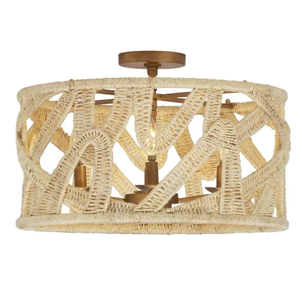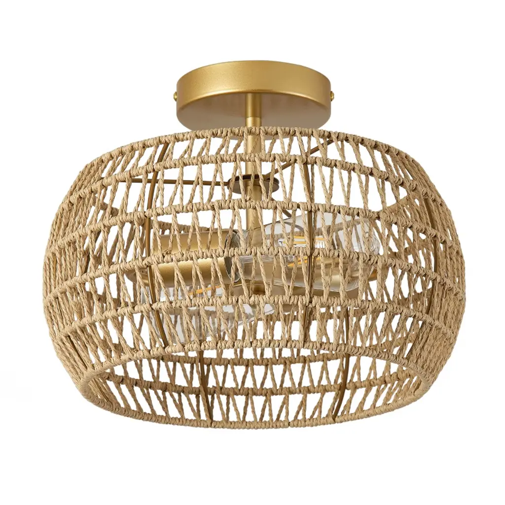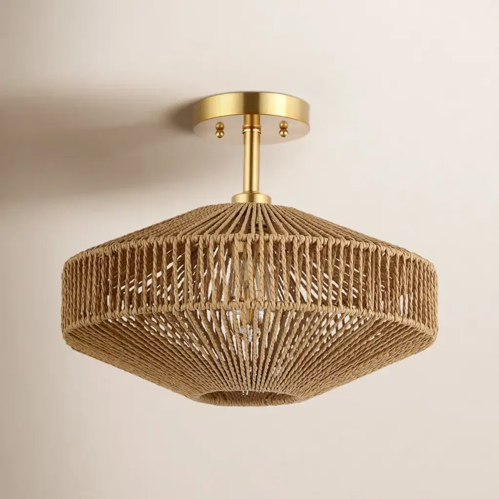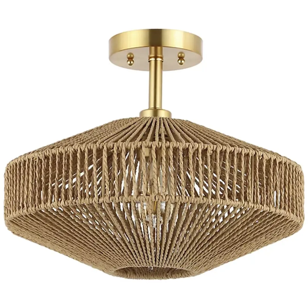 The Reeta Geometric Semi-Flushmount from Alder & Ore introduces a fresh, modern flair to any space. The fixture's signature element is a striking geometric shade woven with paper strands, lending it an artisanal touch. Smooth gold-finished metal hardware anchors the piece using a circular canopy, sending a central stem to strong lamping below. The design blends refined elegance with intricate textures. At the same time, the open gaps in the paper shade beautifully transmit elegant ambient light, creating captivating patterns of light and shadow, perfect for transitional or Bohemian decor. The fusion of contemporary clean lines and the crafted shade's rustic charm results in something stylish and sculptural.