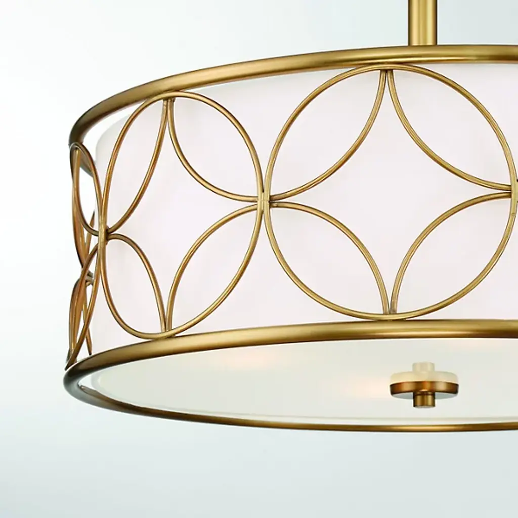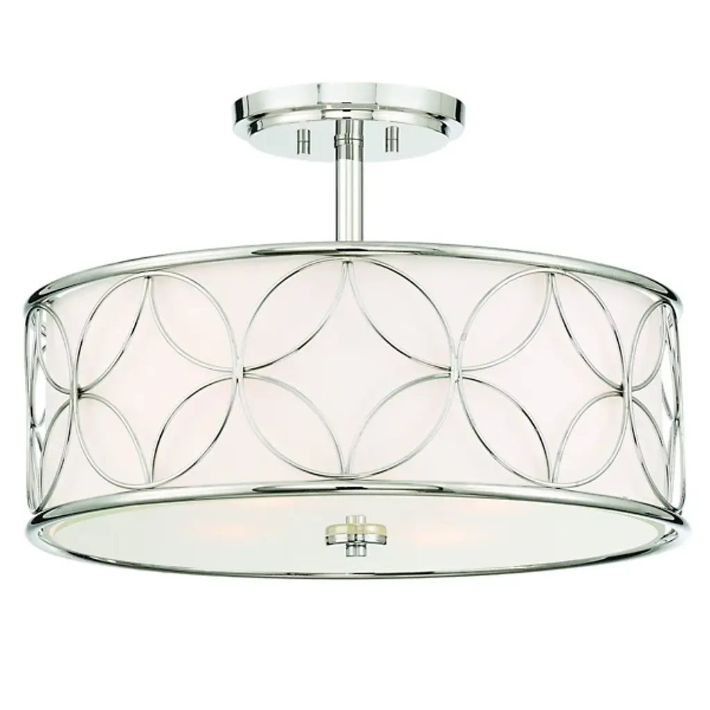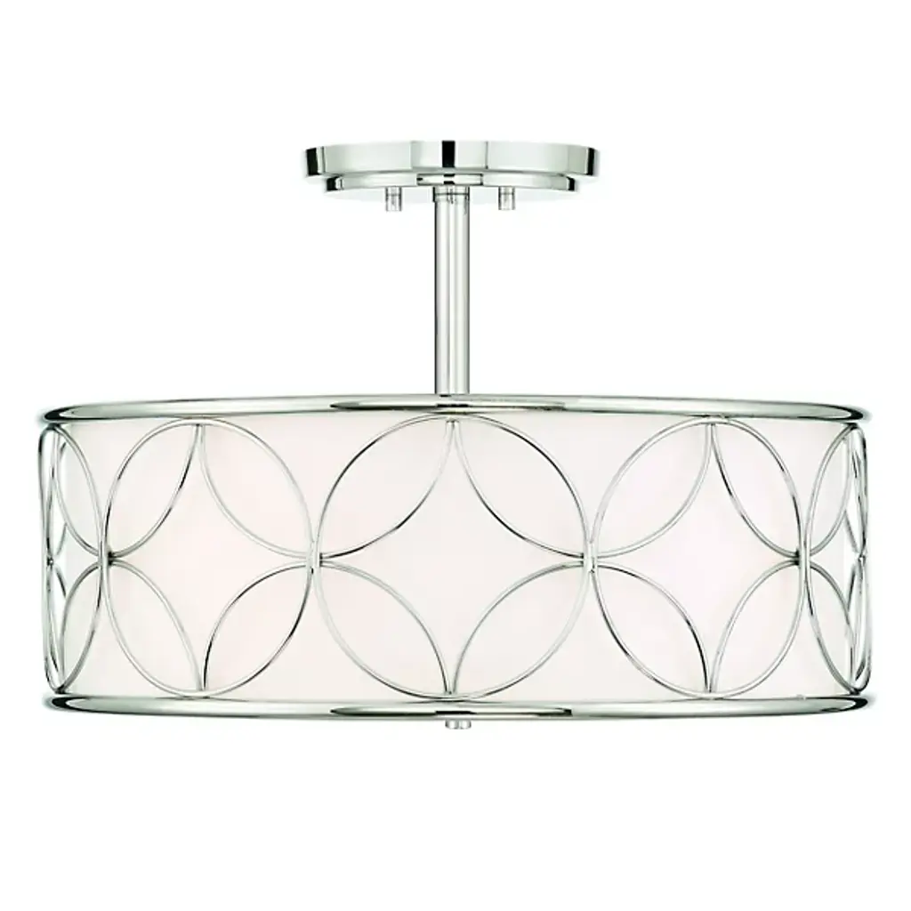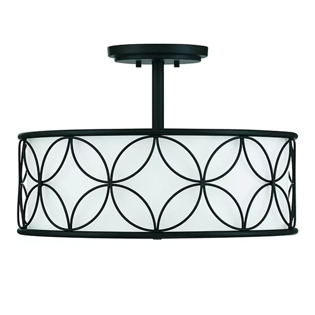 Elegant and effortless. The Reid Semi-Flushmount is a transitional piece of illumination presented by Savoy House. A floral-inspired geometric pattern wraps around the bodice of the shade. Light flows through the white fabric and glass diffuser for a pleasant ambient glow. Completing the composition is a sleek finishing along the fixtures, down rod, and canopy. It’s a lovely piece to add in a small space for ample illumination or a larger space that needs additional illumination.