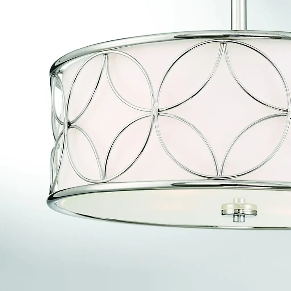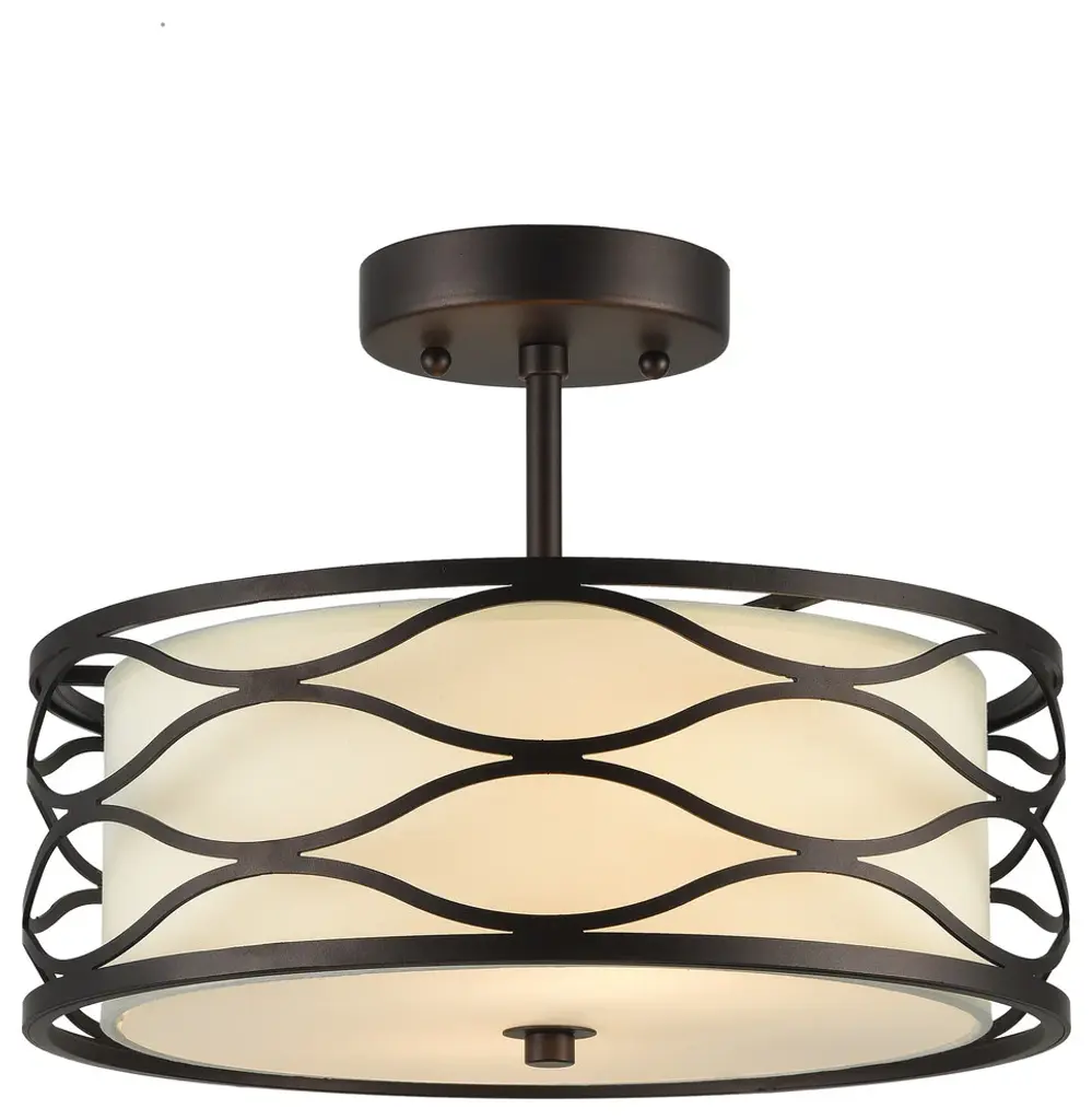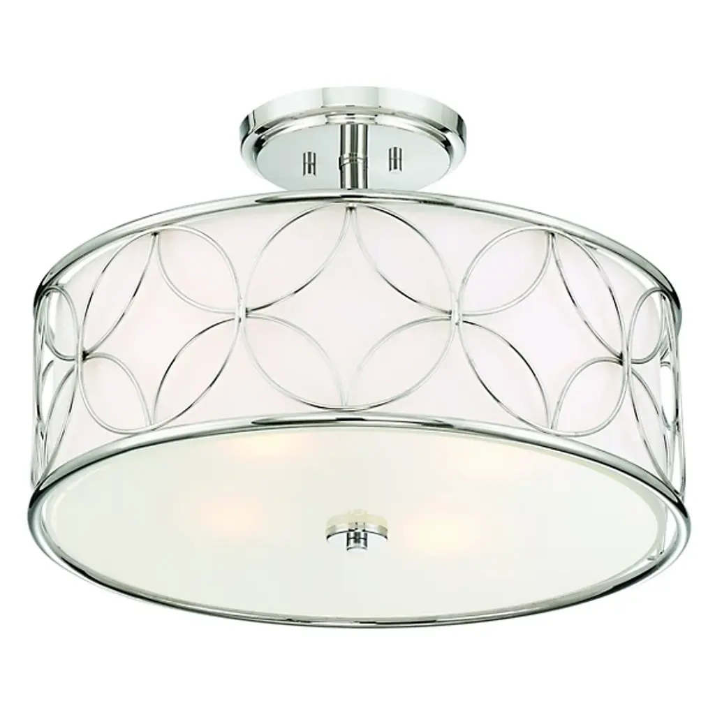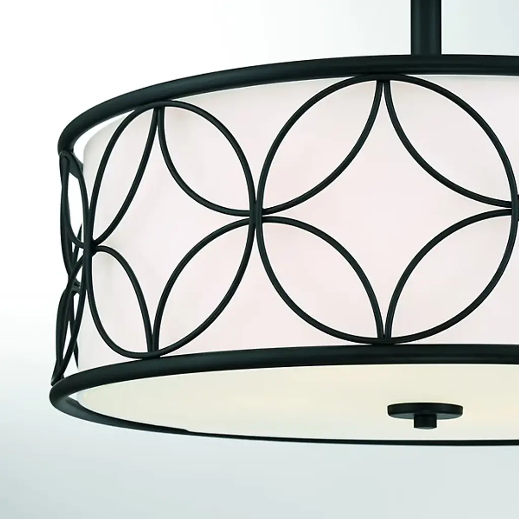 Elegant and effortless. The Reid Semi-Flushmount is a transitional piece of illumination presented by Savoy House. A floral-inspired geometric pattern wraps around the bodice of the shade. Light flows through the white fabric and glass diffuser for a pleasant ambient glow. Completing the composition is a sleek finishing along the fixtures, down rod, and canopy. It’s a lovely piece to add in a small space for ample illumination or a larger space that needs additional illumination.