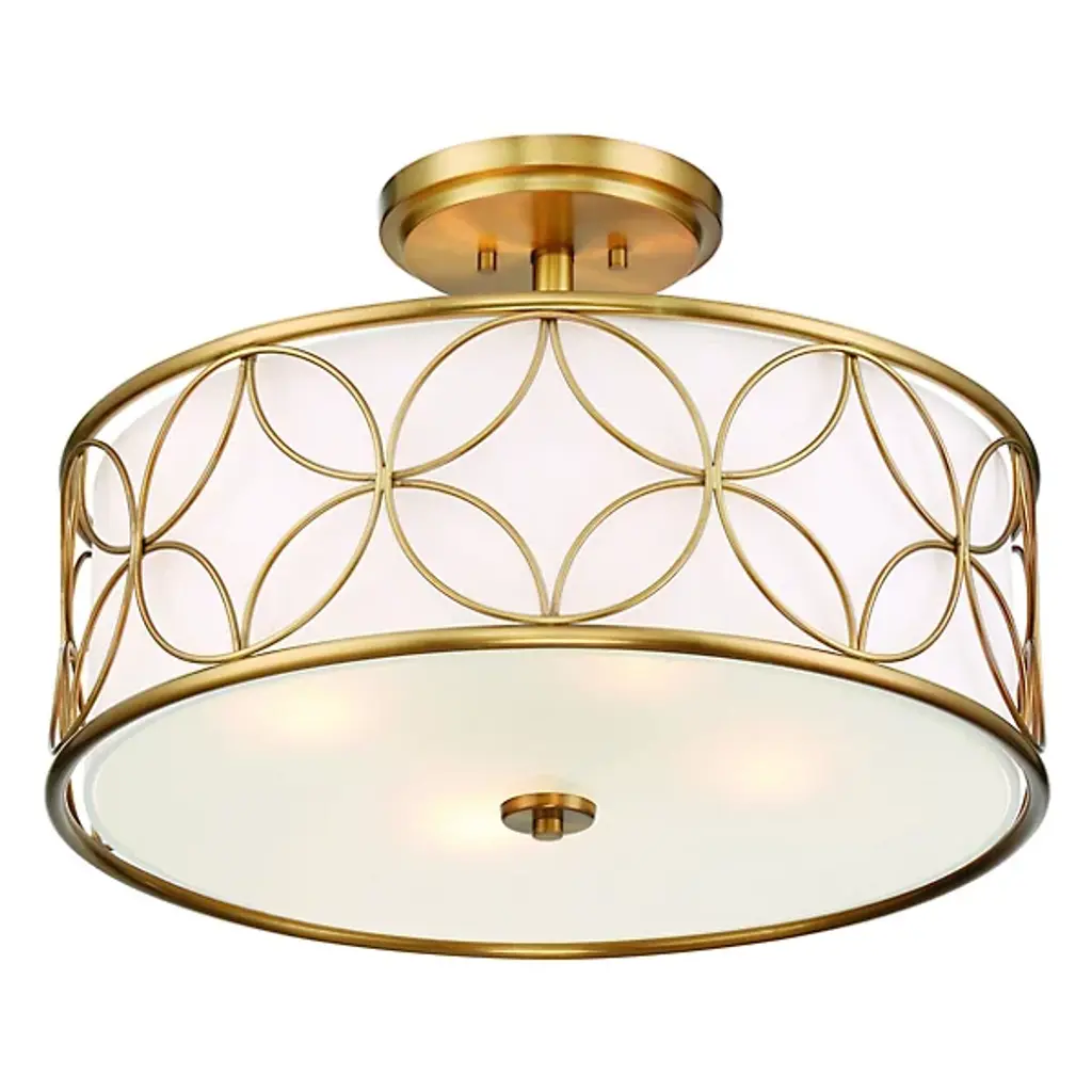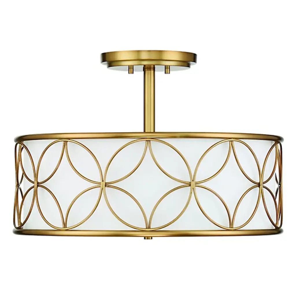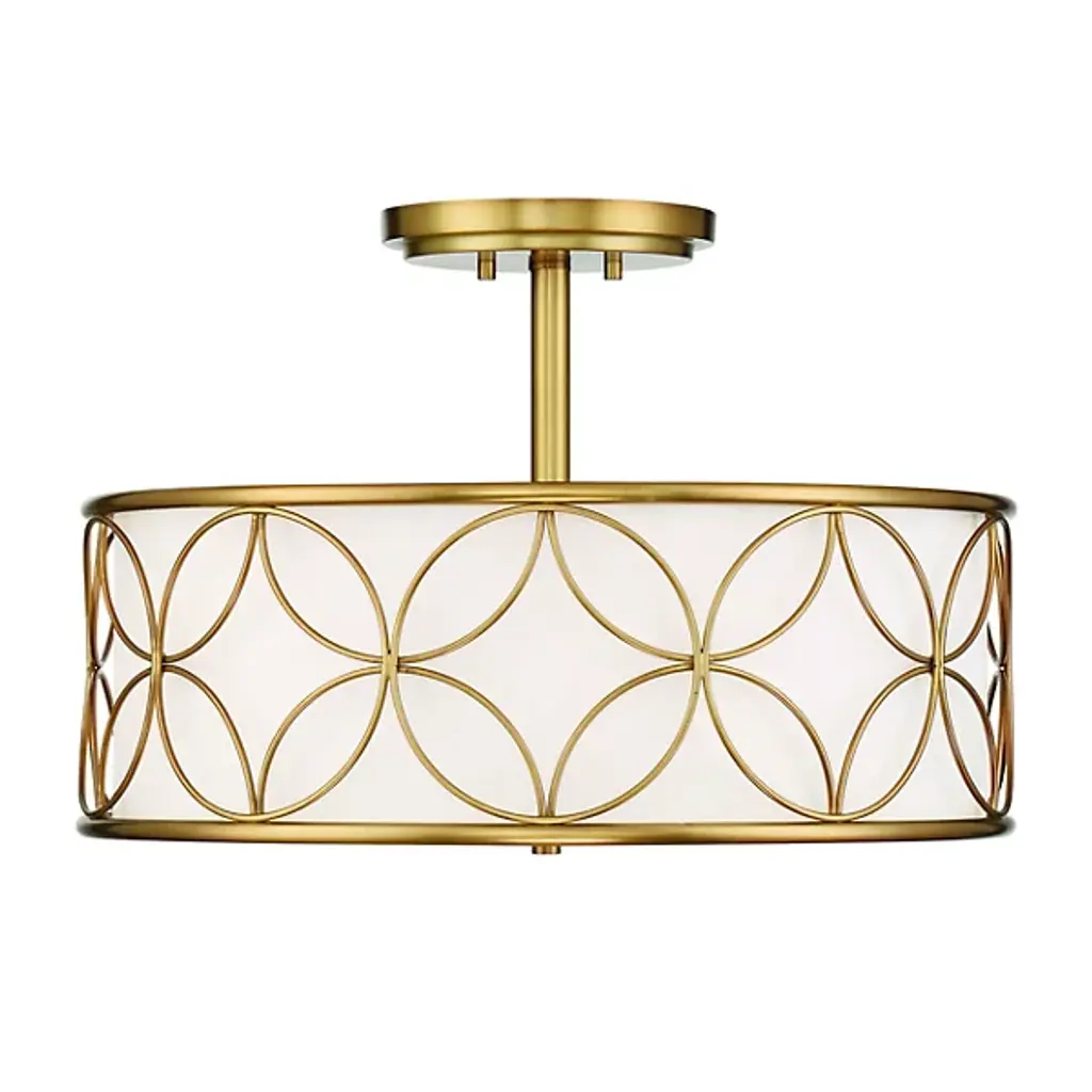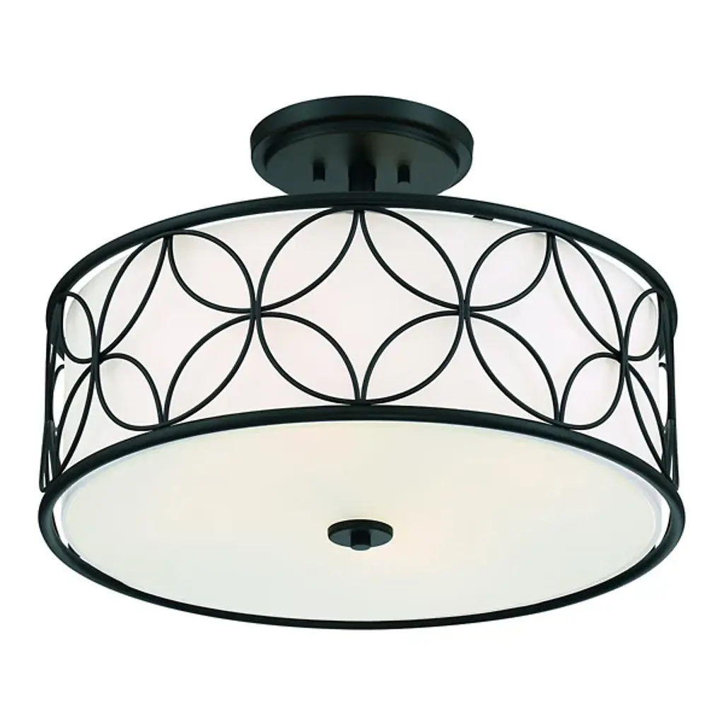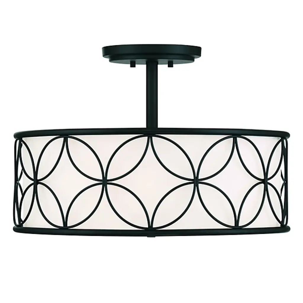 Elegant and effortless. The Reid Semi-Flushmount is a transitional piece of illumination presented by Savoy House. A floral-inspired geometric pattern wraps around the bodice of the shade. Light flows through the white fabric and glass diffuser for a pleasant ambient glow. Completing the composition is a sleek finishing along the fixtures, down rod, and canopy. It’s a lovely piece to add in a small space for ample illumination or a larger space that needs additional illumination.