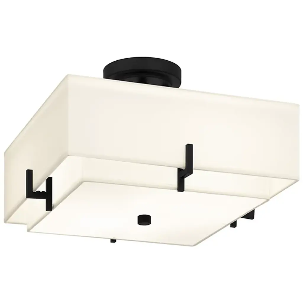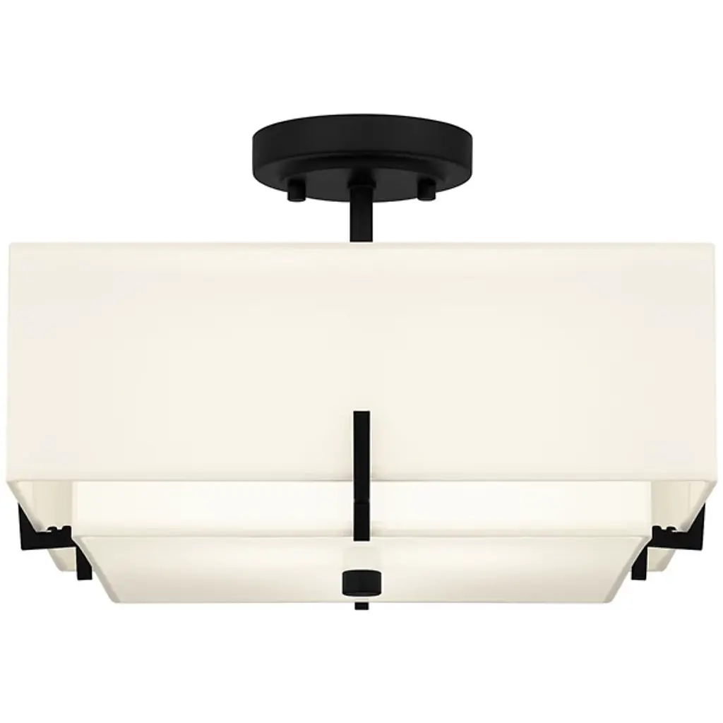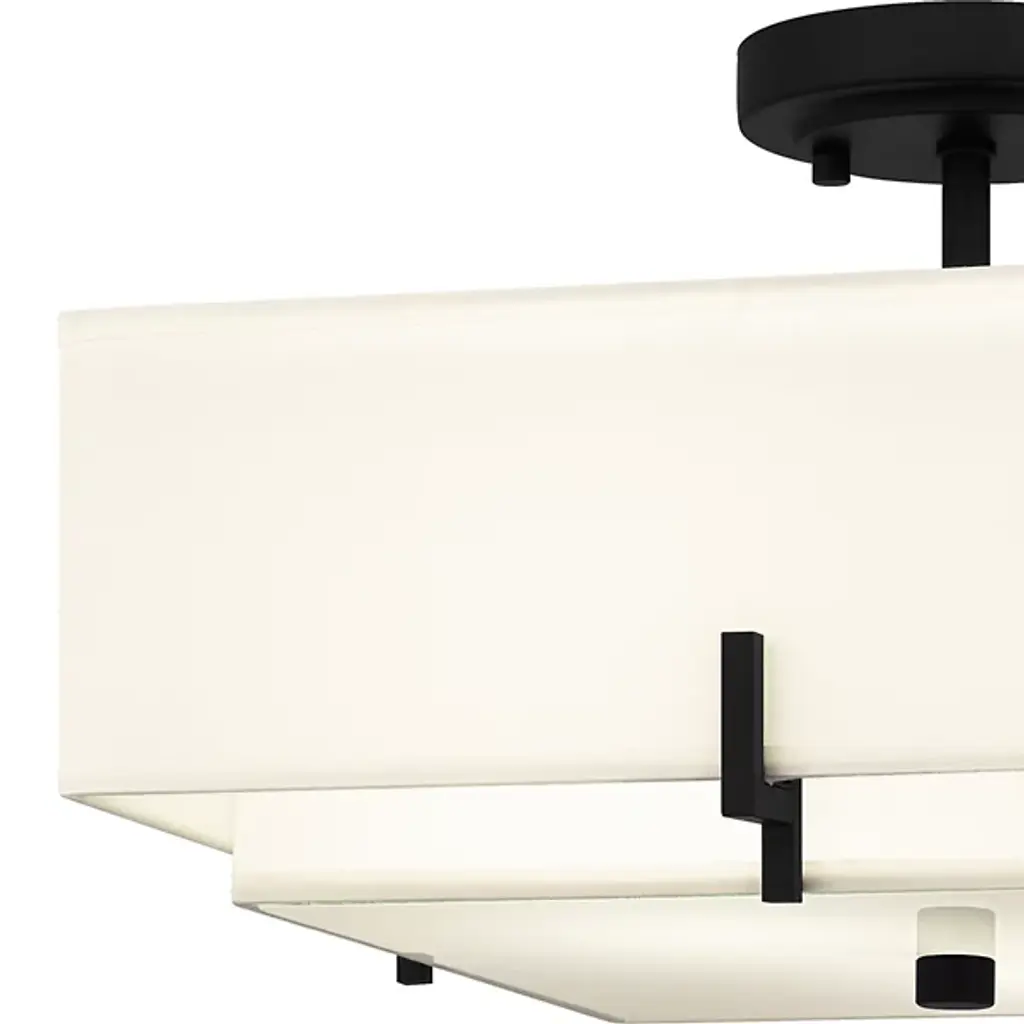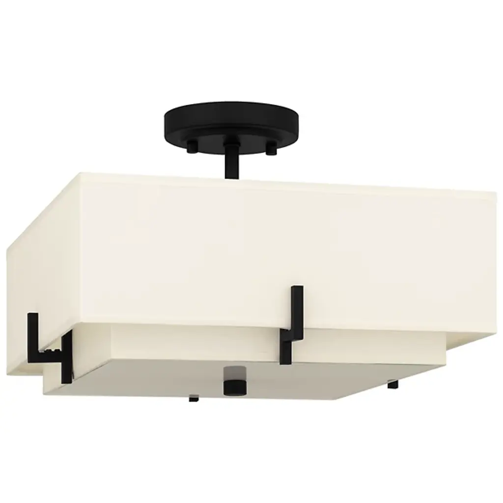 The Renzo Semi-Flushmount from Quoizel will illuminate your space with inviting warmth. Its square beige fabric shade surrounds a smaller shade, creating a distinctive layered appearance. Enhanced by a matte black finish and coordinating geometric accents, the Renzo Semi-Flushmount exudes a transitional charm that complements various settings. Whether in a hallway, living room, bedroom, foyer, or home office, this fixture adds a touch of elegance and sophistication to any space.