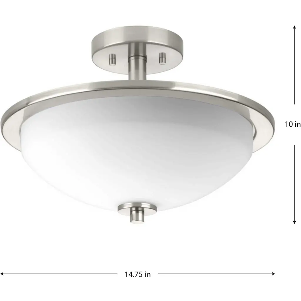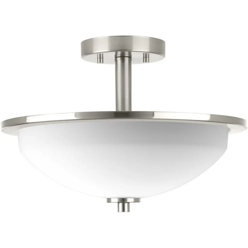 The two-light semi-flush from the Replay collection features a linear form that provides a pleasingly elegant accent to your home. A sleek, metallic finish is complemented by white glass diffusers for a clean, modern silhouette. Brushed Nickel finish.