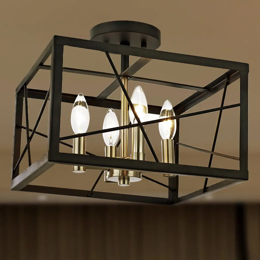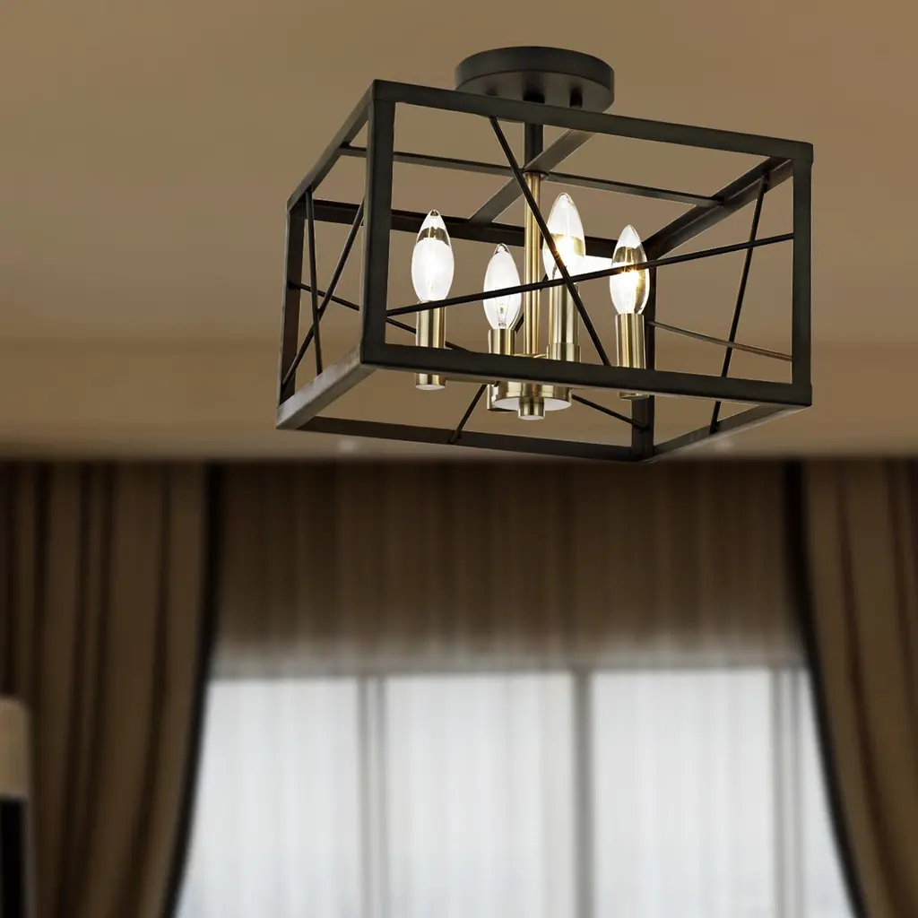 Rinah Matte Black+brushed Nickel 4-Light Rectangle Metal Cage Semi-Flush Mount - Matte Black+brushed Nickel