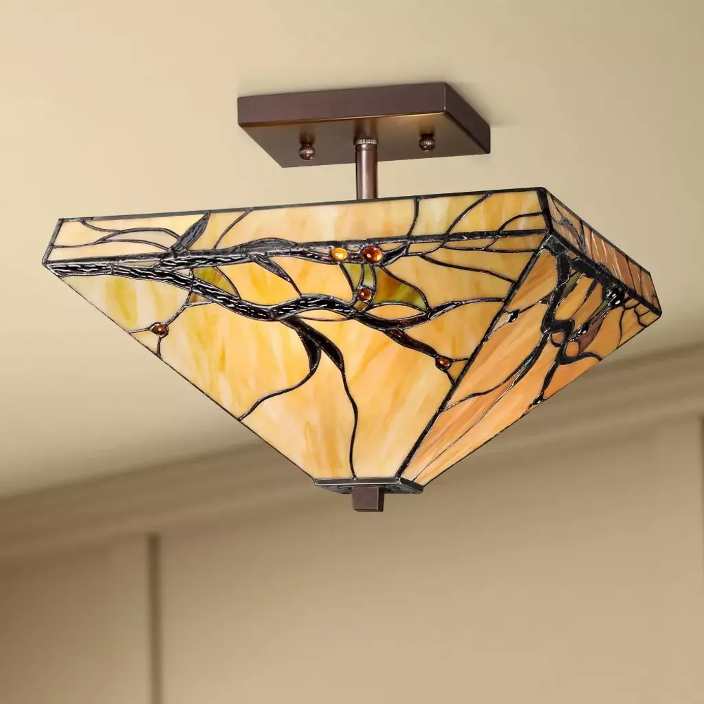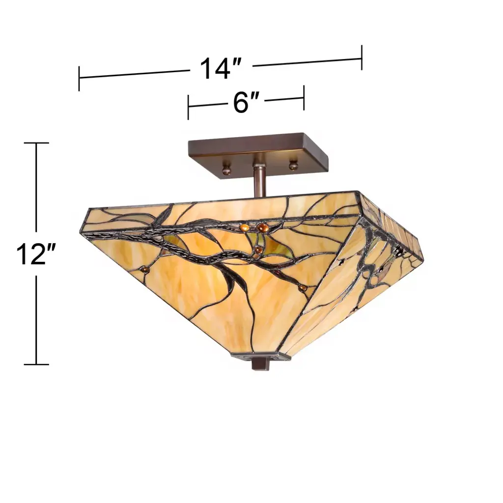 Robert Louis Tiffany Mission Rustic Ceiling Light Semi Flush Mount Fixture 14" Wide Bronze 2-light Budding Branch Art Glass Shade For Bedroom Kitchen