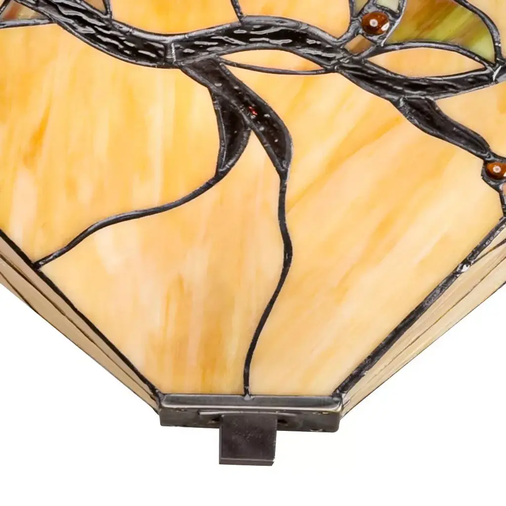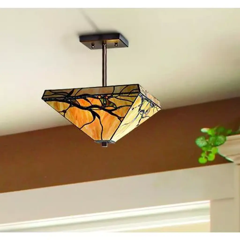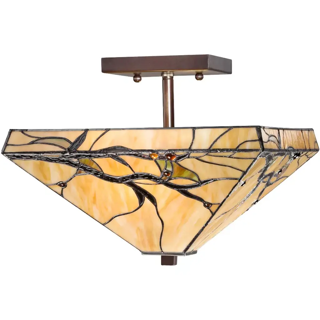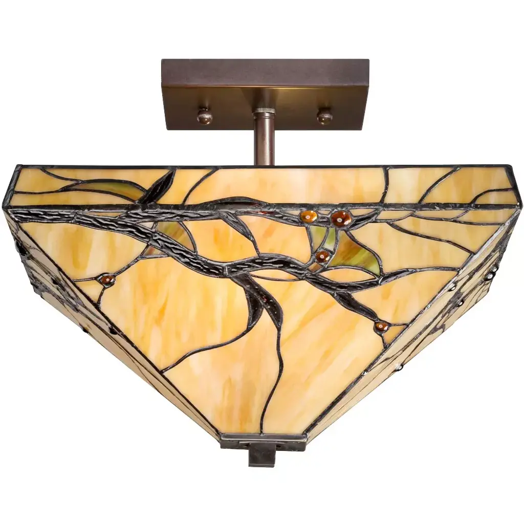 This Tiffany-style semi flush ceiling light looks splendid with a budding branch motif and jeweled olive inlays. A bronze finish completes the Mission-inspired look. This shade is fashioned from naturally occurring mica mineral. Slight variations due to the natural tone and pattern of the mineral make each shade unique.