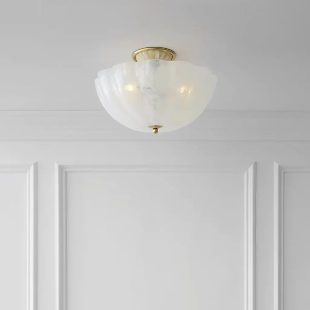 Enhance your home décor with the Rosehill Semi-Flushmount by Visual Comfort Signature, formerly known as Visual Comfort, Its elegant design features a softly scalloped white strie Glass bowl which houses a series of internal lamps. Once on, light filters through the bowl as though underwater, offering an alluring distorted display that contrasts well with the fixture’s refined aesthetic. Supported by a decorative canopy.